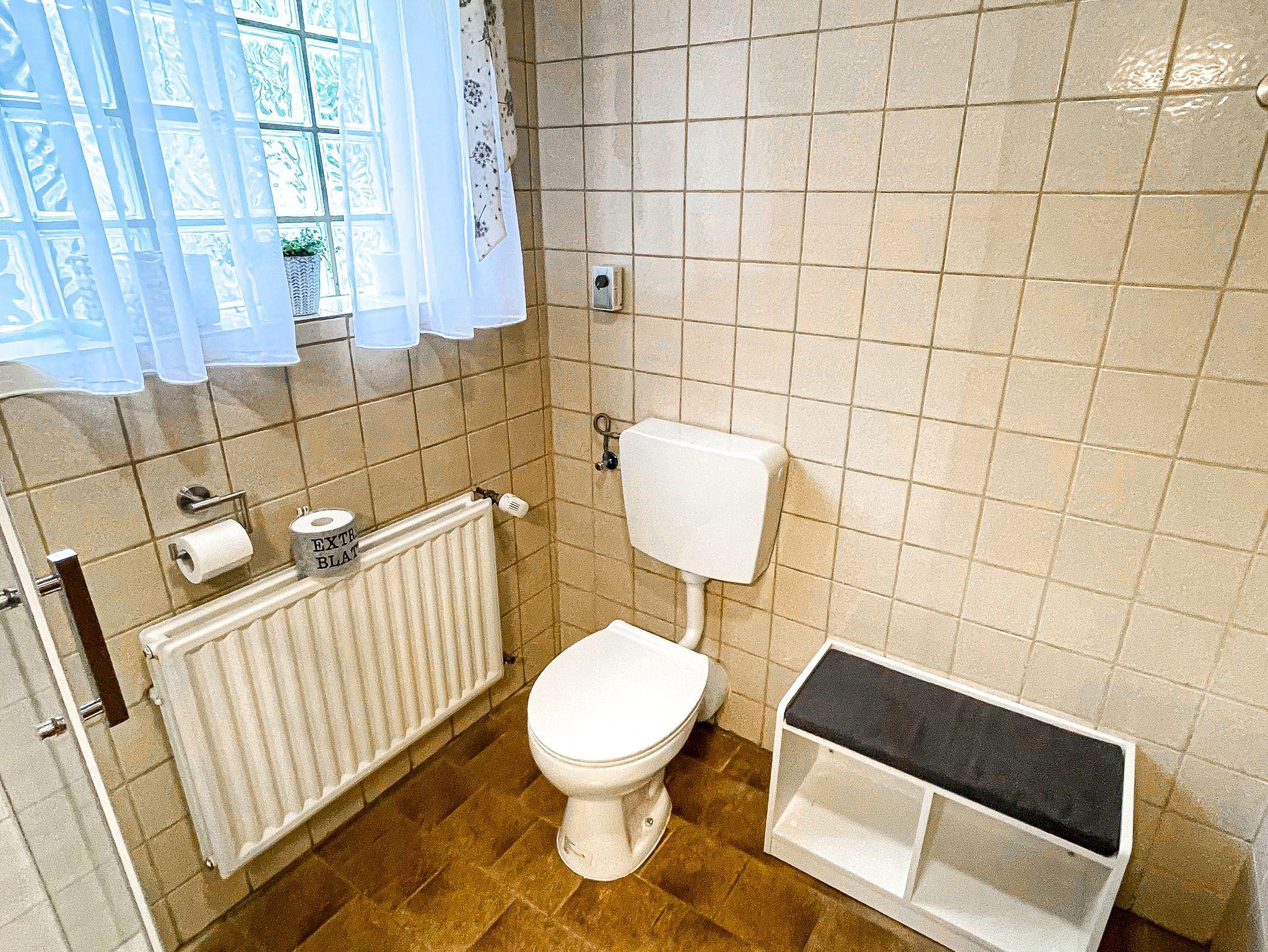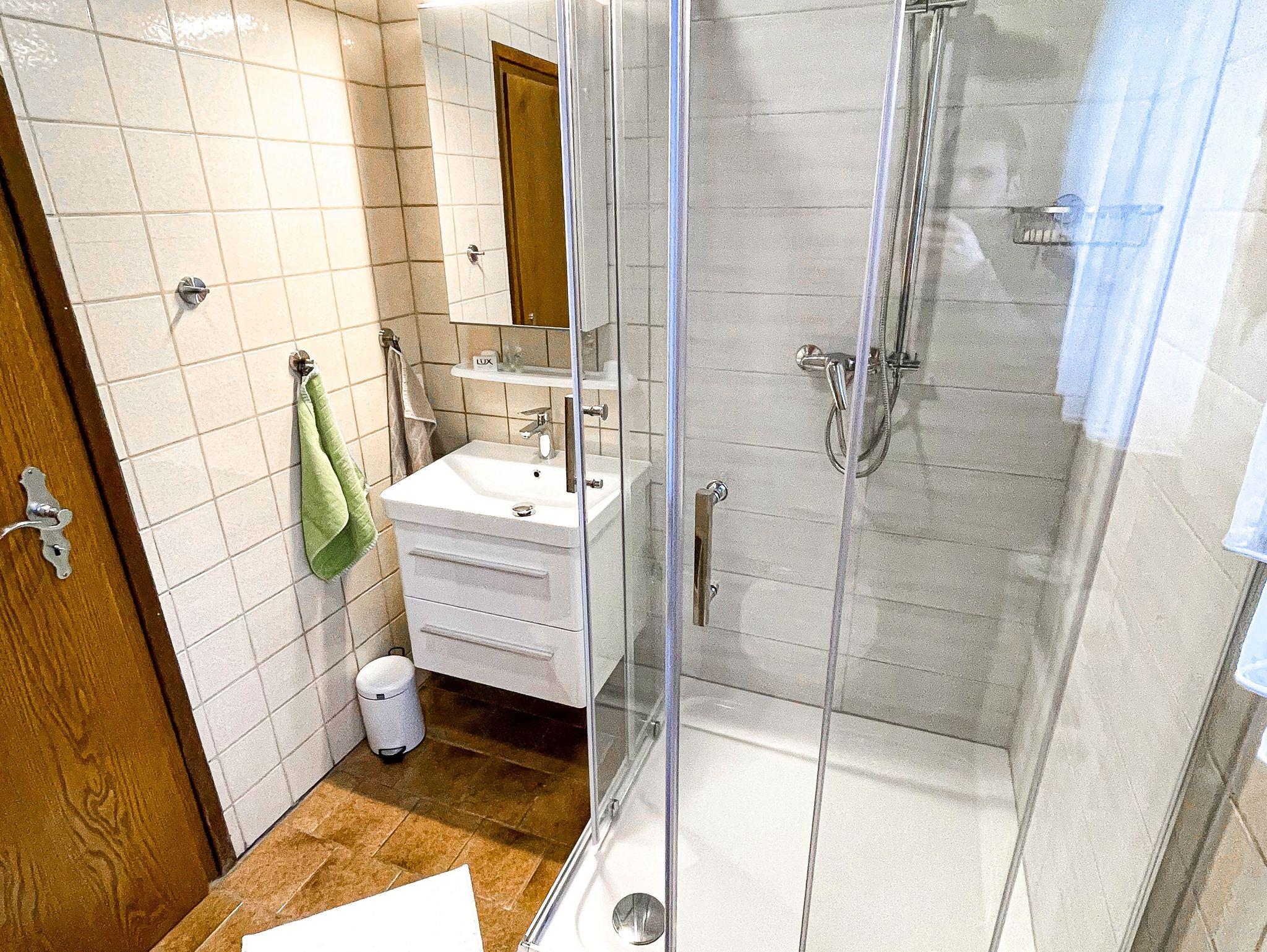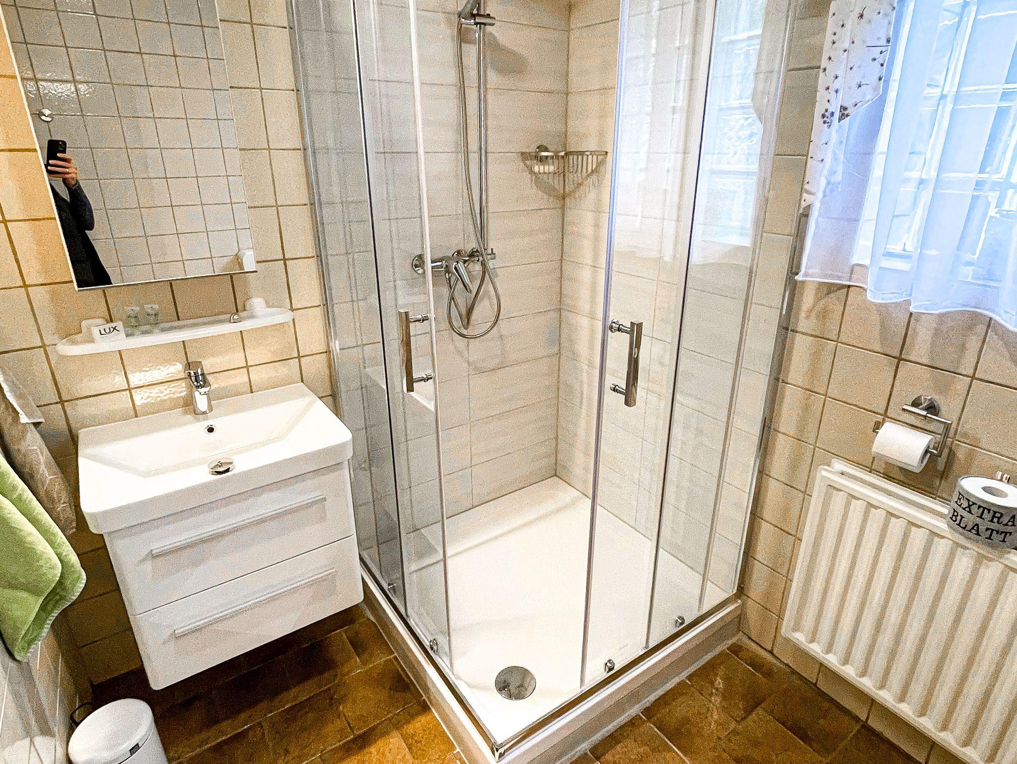 Im Badezimmer befindet sich die großzügige Dusche, Waschbecken und Toilette.