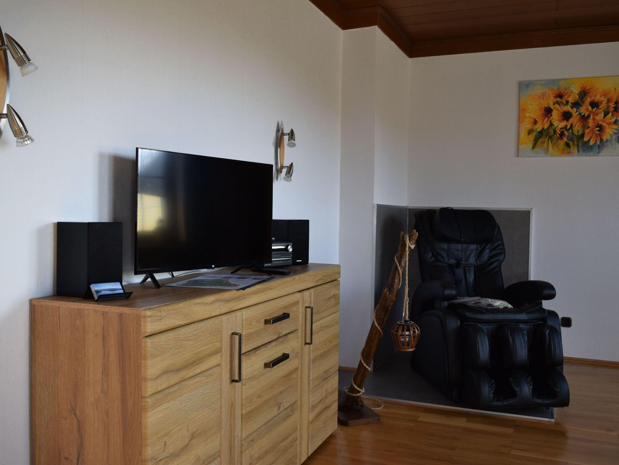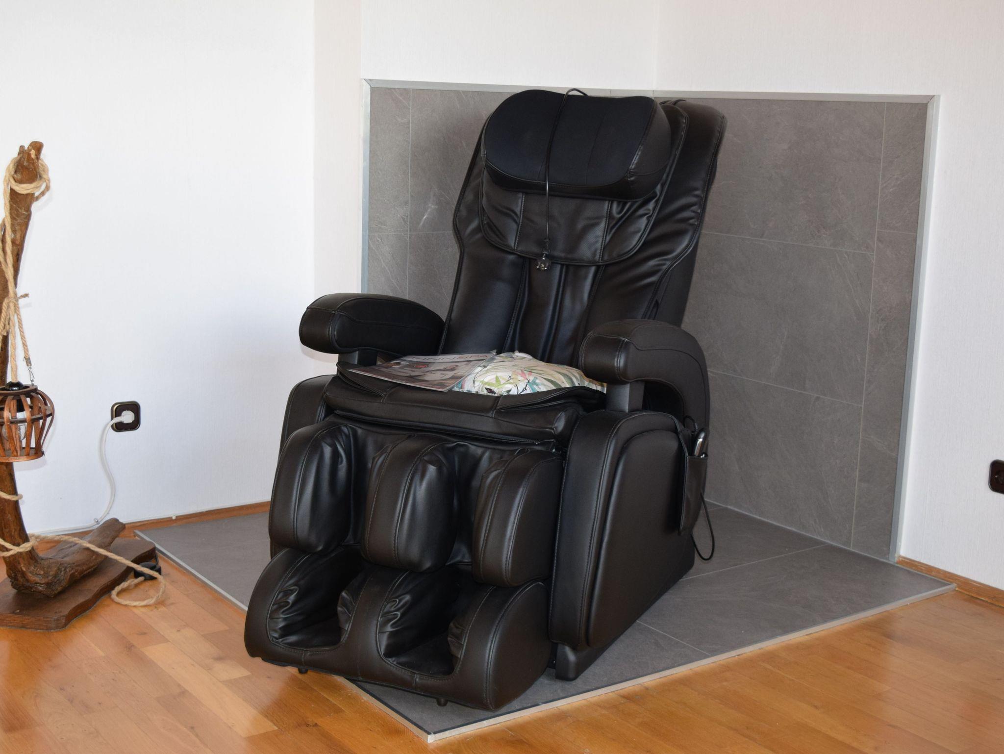 erinnert an eine Alm in den Bergen. Das Wohnzimmer ist mit TV, Kachelofen und einem wohltuenden Massagesessel ausgestattet.