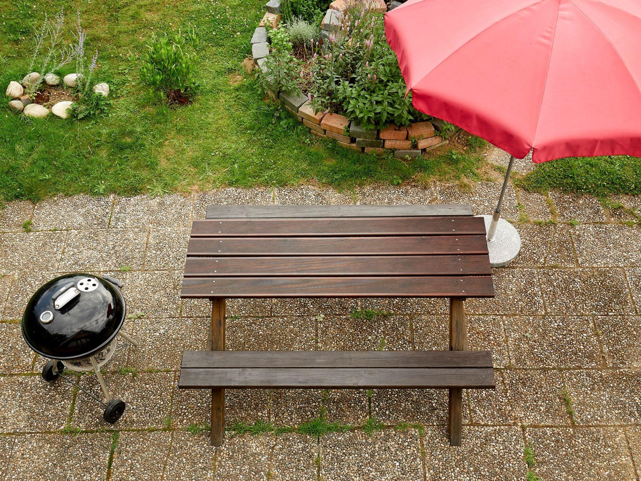 The house has a large, beautiful garden and a terrace. In the neighbouring shed you will find garden furniture, a parasol, a barbecue with accessories and a badminton set. On the terrace there is a wooden table/seating combination for eating and playing, the beautiful natural garden with herb spiral and grass area invites you to relax and play badminton, for example.