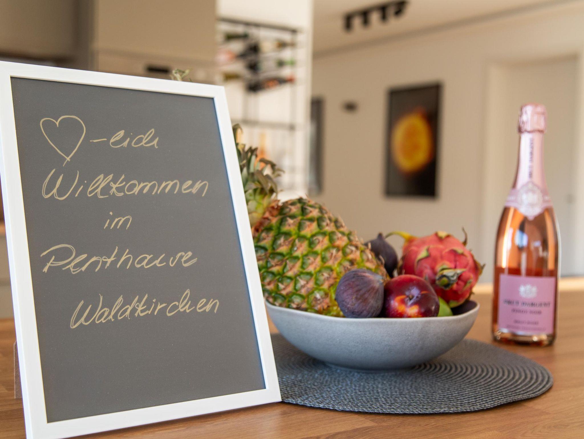 Auf 256 m² genießen Sie hochwertige Ausstattung, großzügige Zimmer und absolute Privatsphäre. Die Wohnung liegt im obersten Stockwerk und bietet über die einzigartige Dachterrasse einen weiten Blick auf den Bayerischen Wald, das umliegende Bergpanorama sowie die benachbarte Penninger Hausbrennerei.