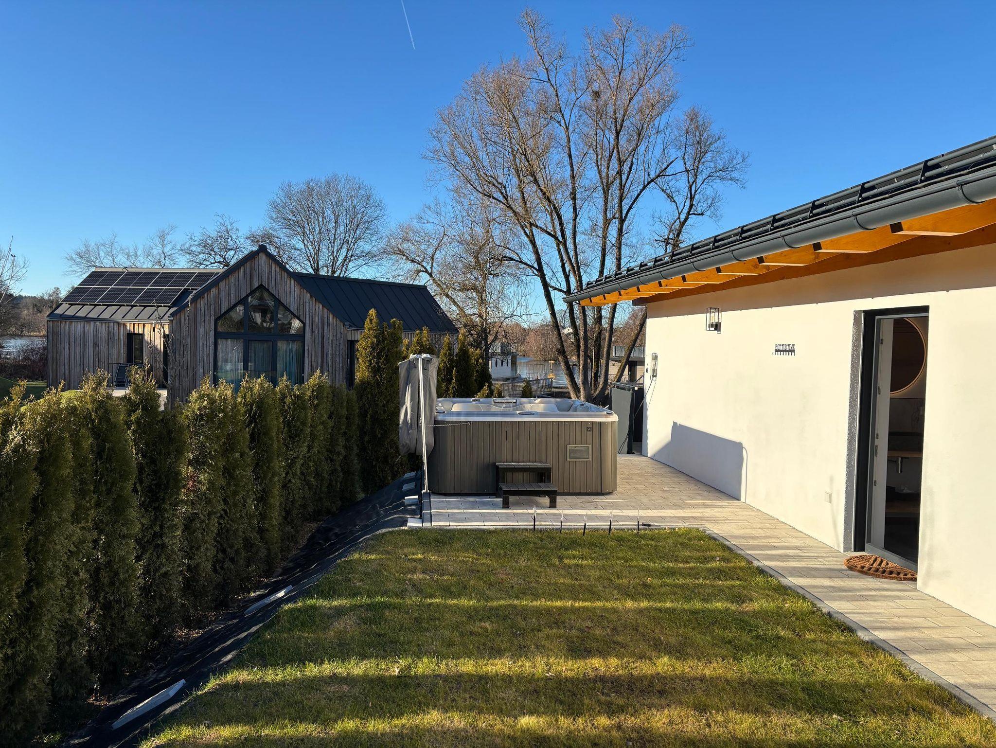 Das 2025 fertiggestellte 80 m² große Ferienhaus bietet moderne Ausstattung, viel Helligkeit und höchsten Wohnkomfort. Die Wohnküche überzeugt durch große Fensterfronten mit Blick auf den See, während der private Whirlpool im Garten – direkt über die Tür im Badezimmer erreichbar – für besondere Entspannungsmomente sorgt. Das Haus verfügt über zwei Schlafzimmer mit Doppelbetten, ein helles Wohnzimmer mit Schlafsofa, ein modernes Bad mit begehbarer Dusche sowie bereitgestellte Bettwäsche und Handtücher. Die Küche ist vollständig ausgestattet mit Kühlschrank, Herdplatte, Backofen, Spülmaschine, Waschmaschine, Trockner, Kaffeemaschine, Toaster, Wasserkocher und Küchenutensilien. Weitere Ausstattungsmerkmale sind eine Terrasse, Balkon, Klimaanlage, privater Eingang, Pelletofen für gemütliche Wärme, Flachbild-TV mit Satellitenempfang, Holz- oder Parkettböden, Heizung, Gartenmöbel, Essbereich im Freien sowie barrierefreie Zugänglichkeit auf einer Ebene. WLAN steht kostenfrei zur Verfügung. Rauchen ist im gesamten Haus nicht gestattet.