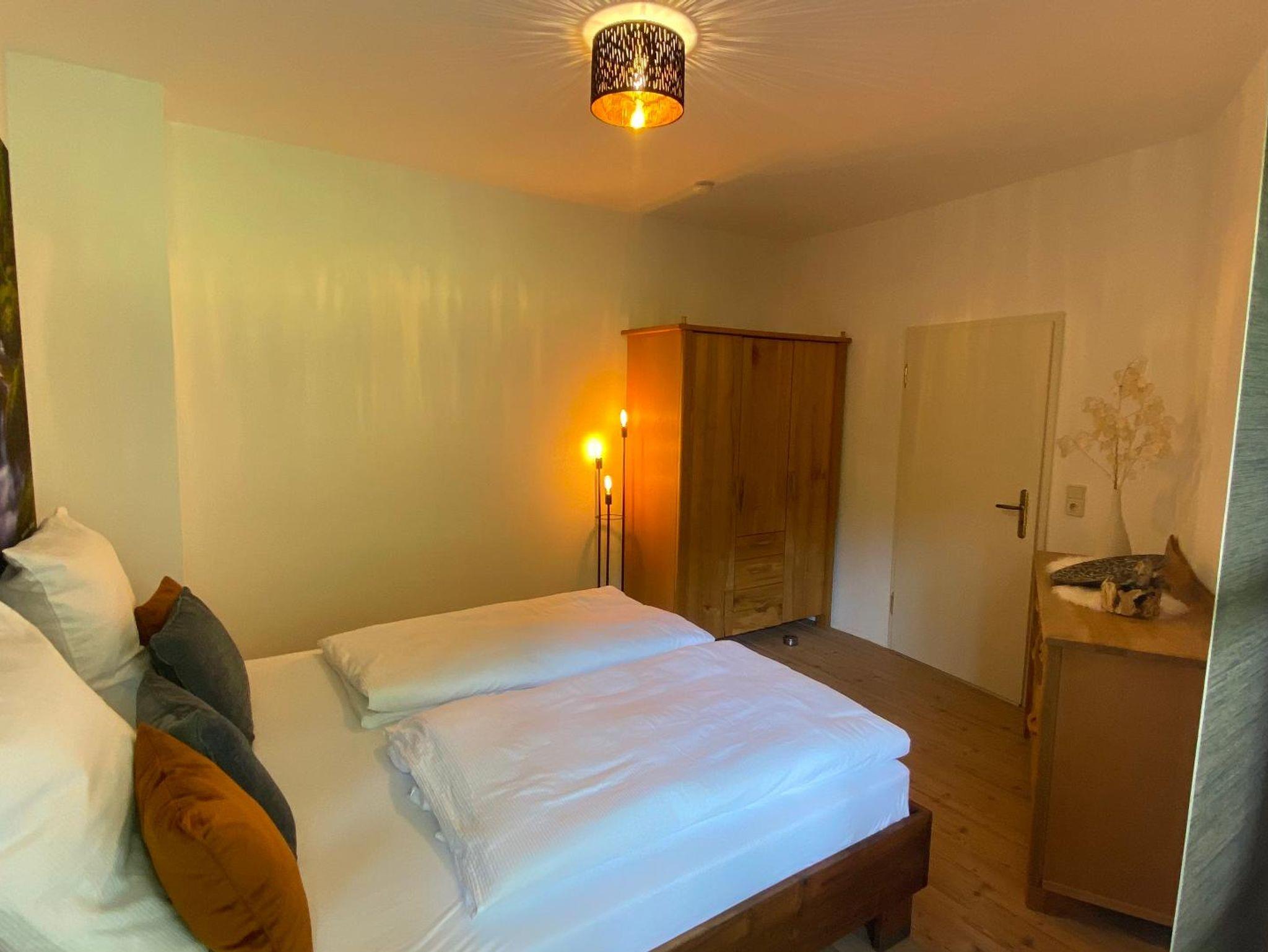 Die Ferienunterkunft Waldzauber mit ihren 74 qm bietet Platz für bis zu 5 Personen in 2 Schlafzimmern. Das erste Schlafzimmer ist mit einem Doppelbett (1,80 m breit) ausgestattet, während das 2. Schlafzimmer ein Doppelbett (1,60m breit) und ein Einzelbett (0,90 m breit) hat. Im Badezimmer befindet sich eine Badewanne, Waschbecken und Waschmaschine. Daneben gibt es ein separates WC mit zweitem Waschbecken und einer Dusche. Die neue Essküche ist gut ausgestattet mit Mikrowelle, Geschirrspüler, Backofen, Kaffeemaschine, Toaster, Geschirr und allen Kochutensilien. Neben der geräumigen Garderobe befindet sich ein Regal mit Büchern für Groß und Klein und Brettspielen. Das gemütliche Wohnzimmer verfügt über einen 50-Zoll-TV und auf der überdachten Terrasse kann man sich wunderbar entspannen.