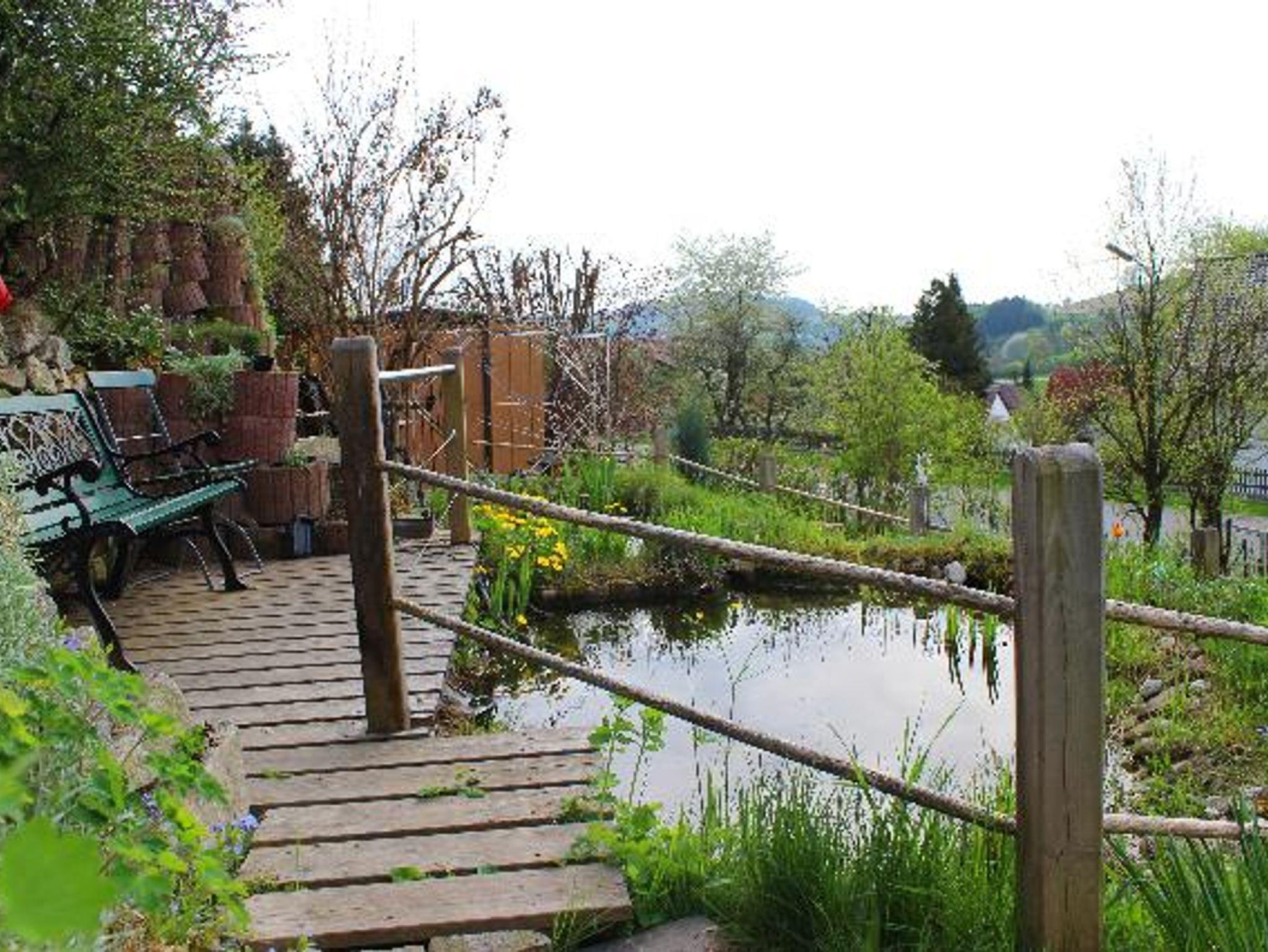 - Garten mit Teich, Spielturm und Schaukel,