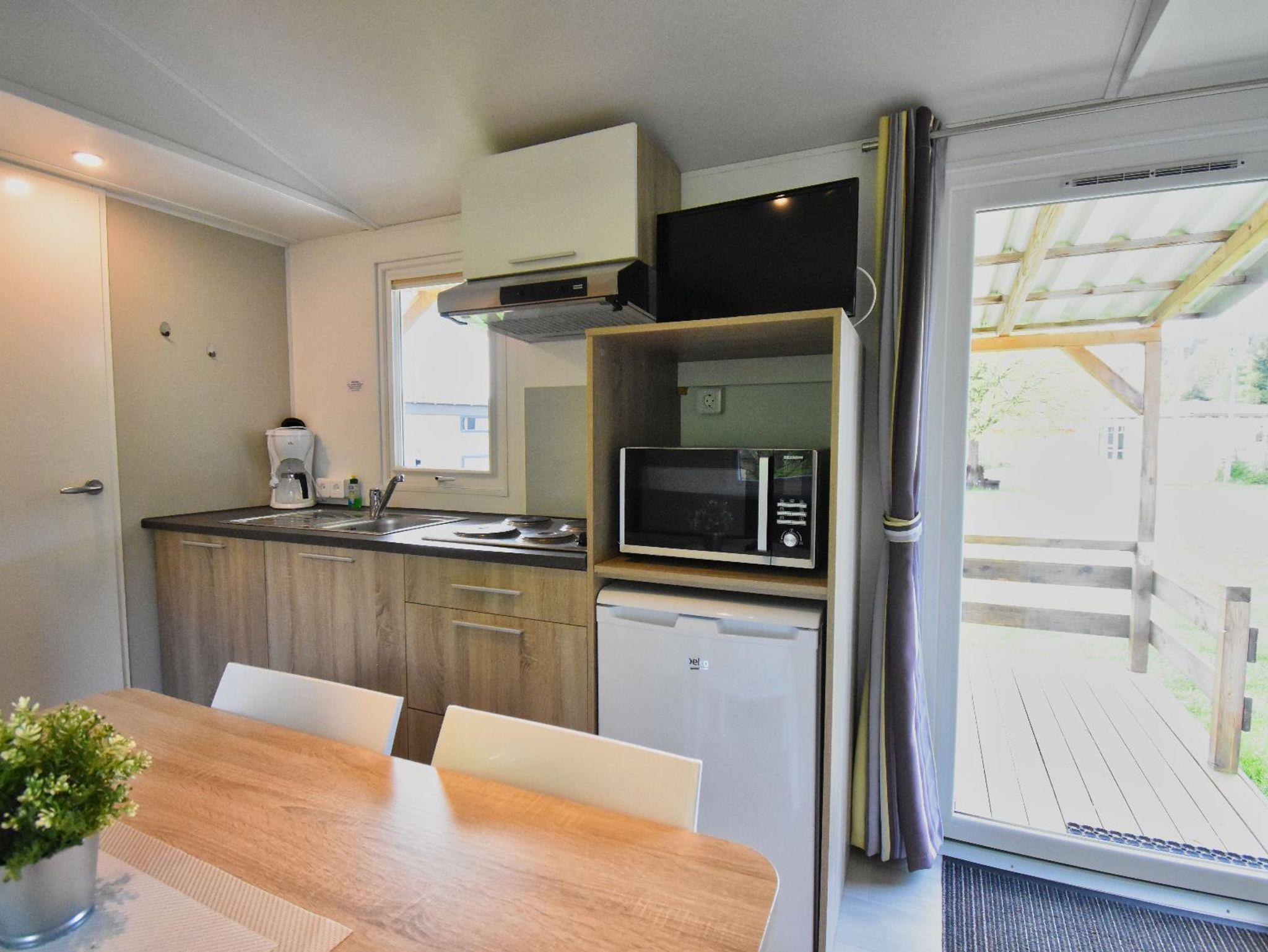 Das behagliche, modern eingerichtete Mobilheim Rapunzel ist 27qm groß und bietet Platz für 4 Personen. Im ersten Schlafzimmer befindet sich ein Doppelbett. Im zweiten Schlafzimmer befinden sich zwei Einzelbetten. Das Bad besteht aus Dusche und WC. Im Wohnzimmer befindet sich eine Essecke und ein Fernseher. Küchenzeile mit Mikrowelle, Kaffeemaschine, Kühlschrank, Herd, Geschirr und Essecke lässt keine Wünsche offen. Auf der schönen Terrasse können Sie die Sonne genießen. Parkplatz auf dem Grundstück und WLAN vorhanden. HUNDE NICHT ERLAUBT !