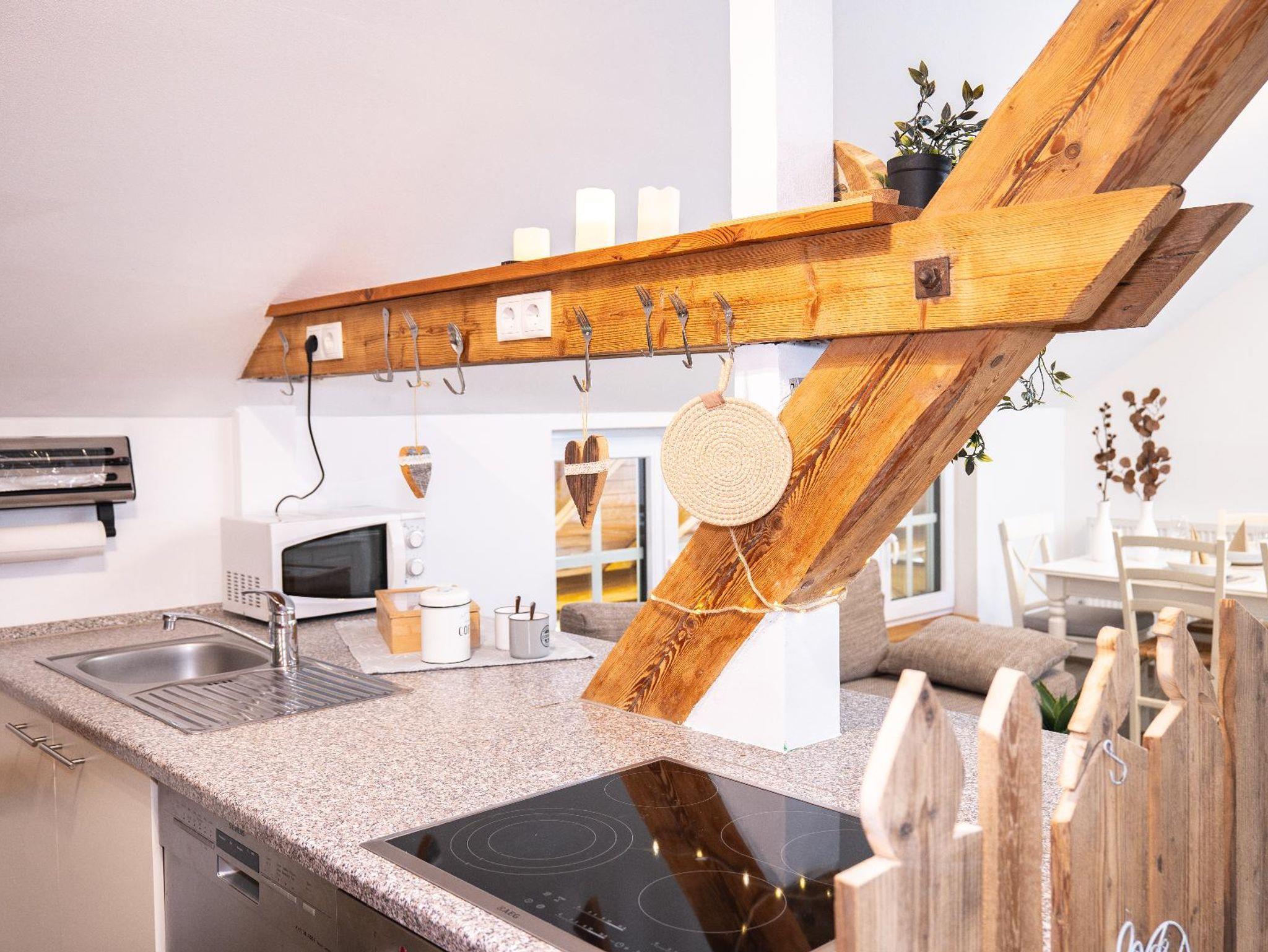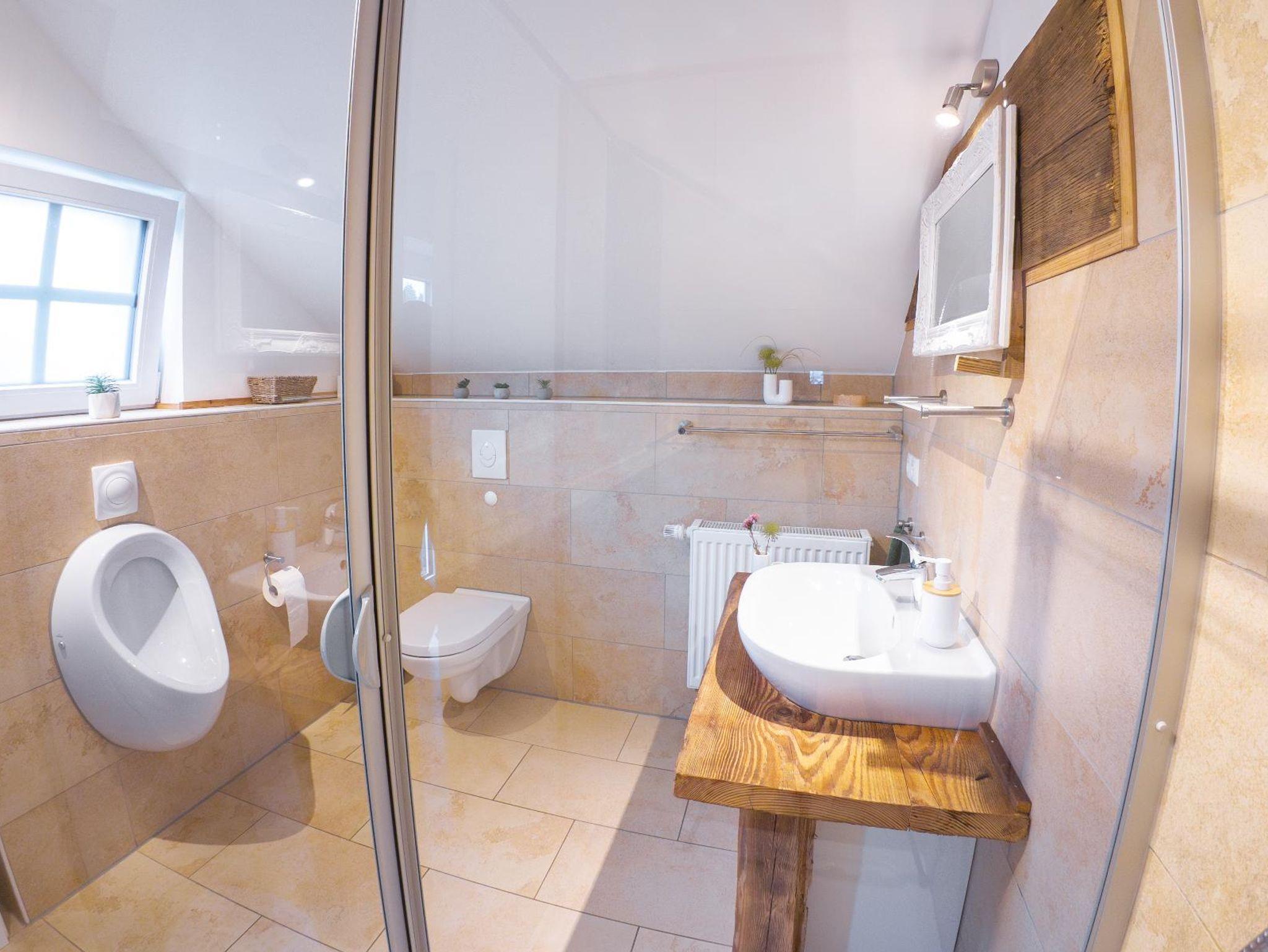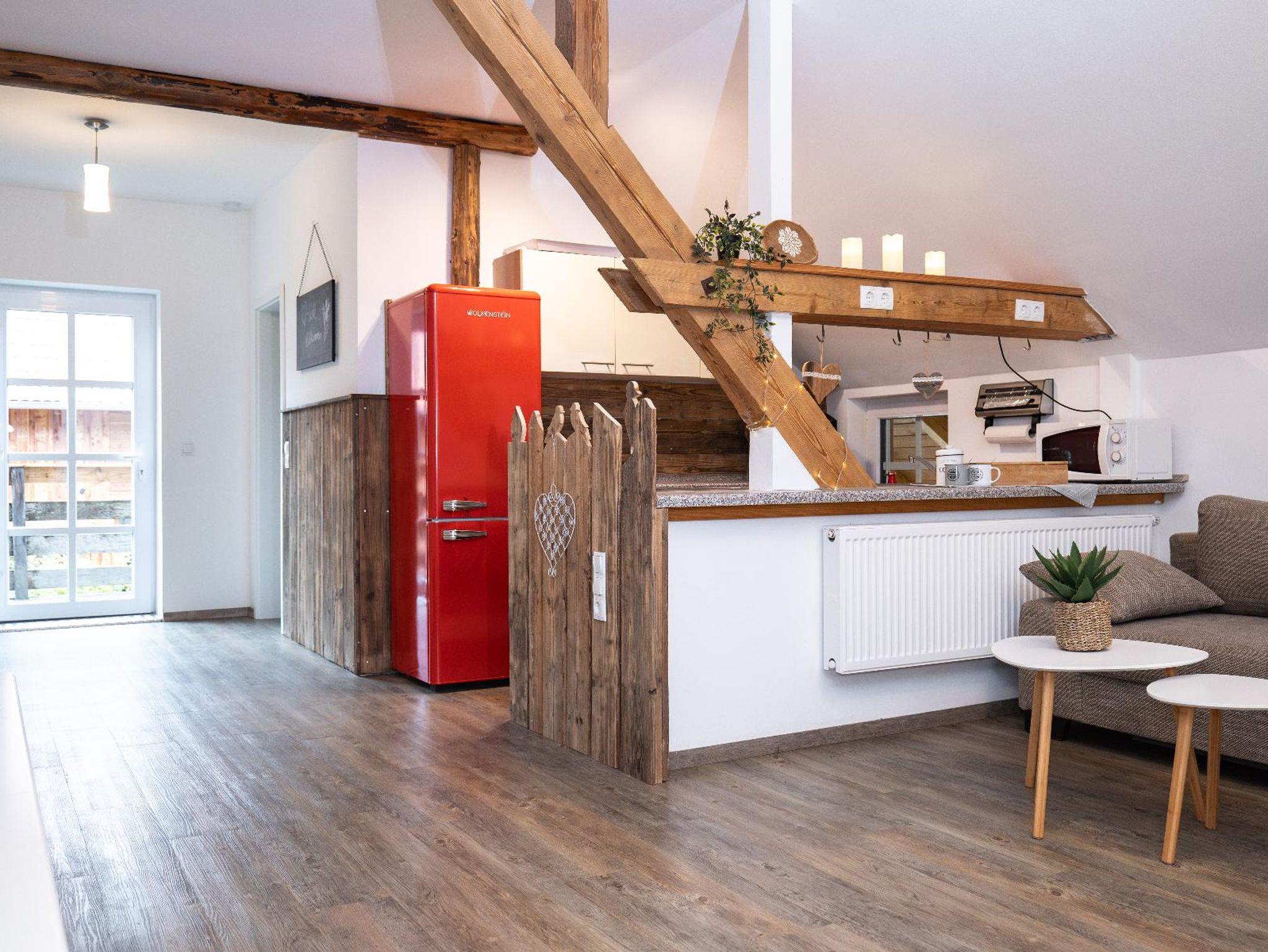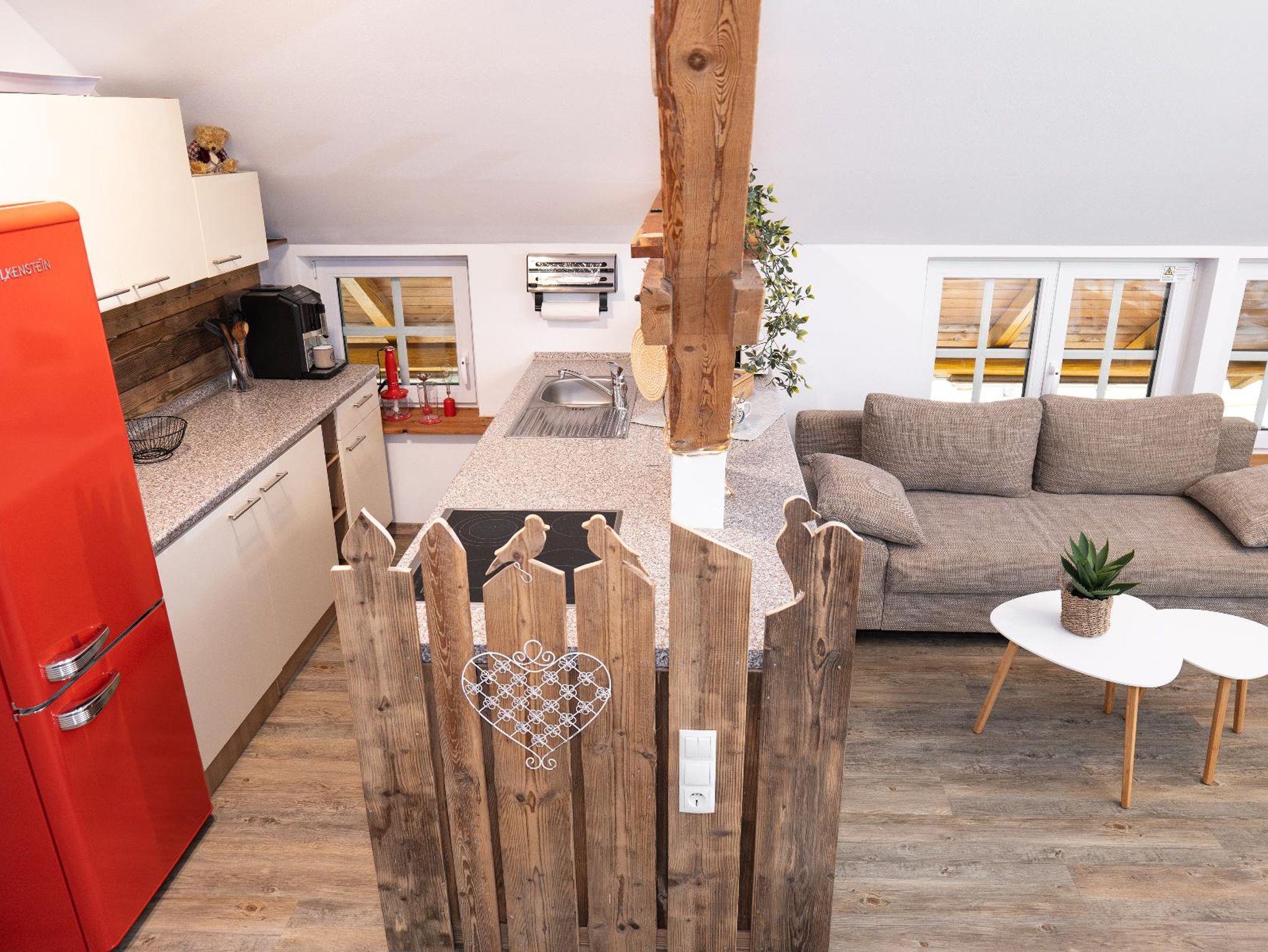 Sie liegt im 1. OG des Stallgebäudes und ist über den eigenen Balkon der Wohnung über eine Außentreppe (Gitterrost) zu erreichen. Die Wohnung verfügt über ein Tageslichtbad mit Dusche, WC und Urinal. Eine Einbauküche sowie ein großzügiger Wohn- und Essbereich mit Sat-TV, lädt zum Kochen und gemütlichen Zusammensitzen ein. In der Küche stehen Backofen und Kochfeld, Kaffeevollautomat, Kühlschrank, Toaster, Wasserkocher, Geschirrspüler und Radio zur Verfügung.