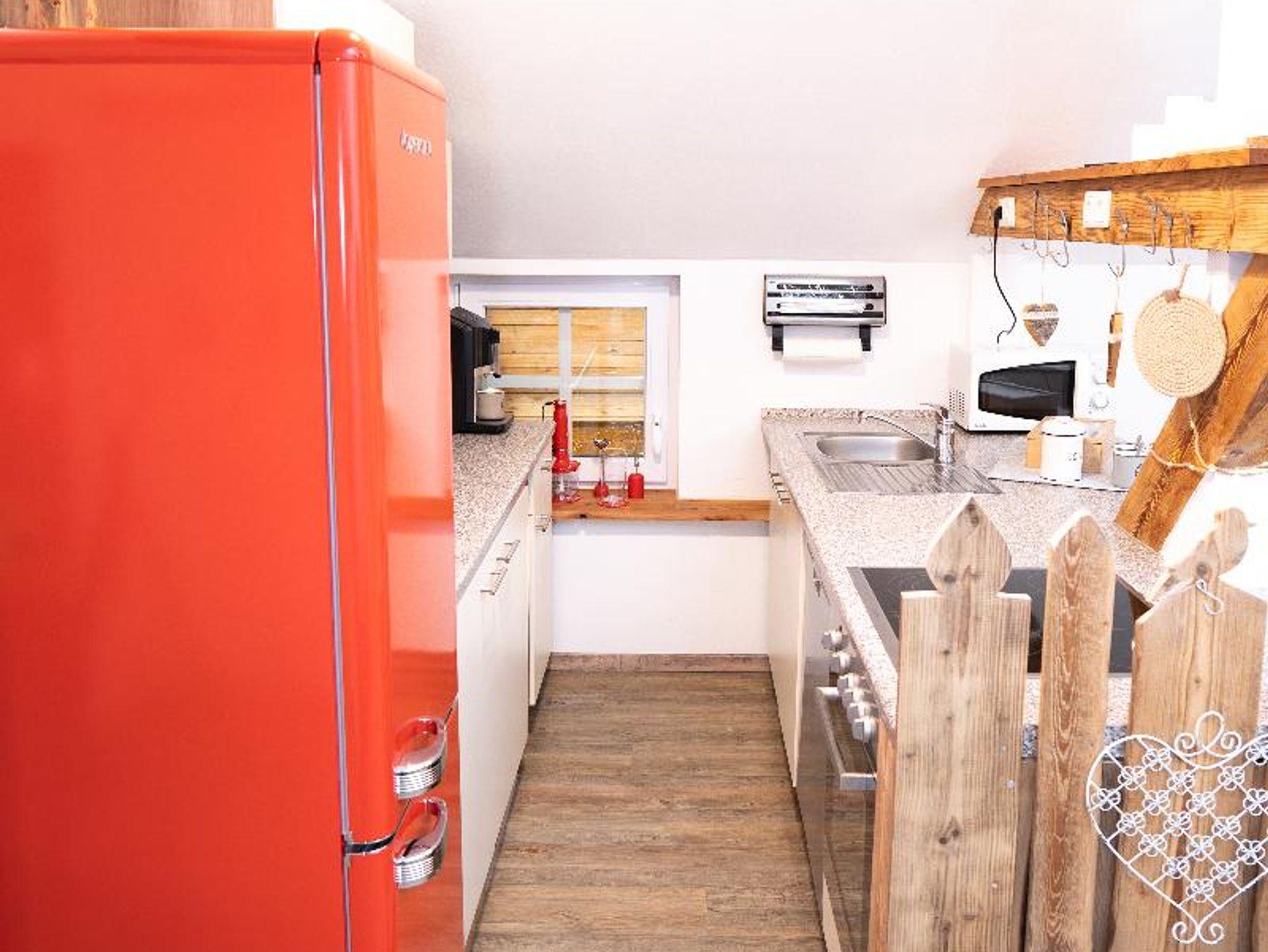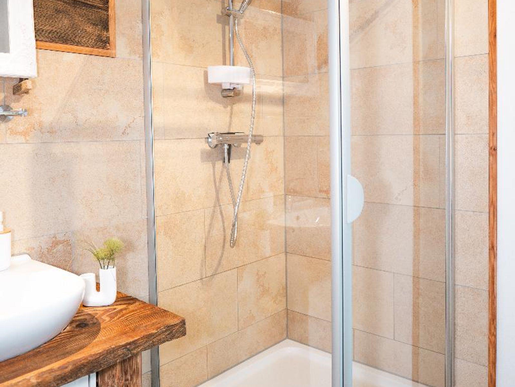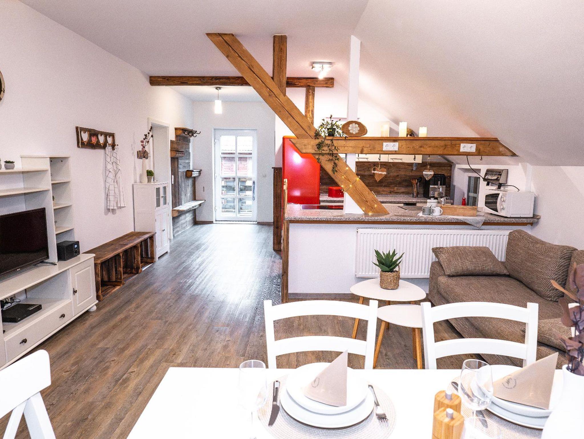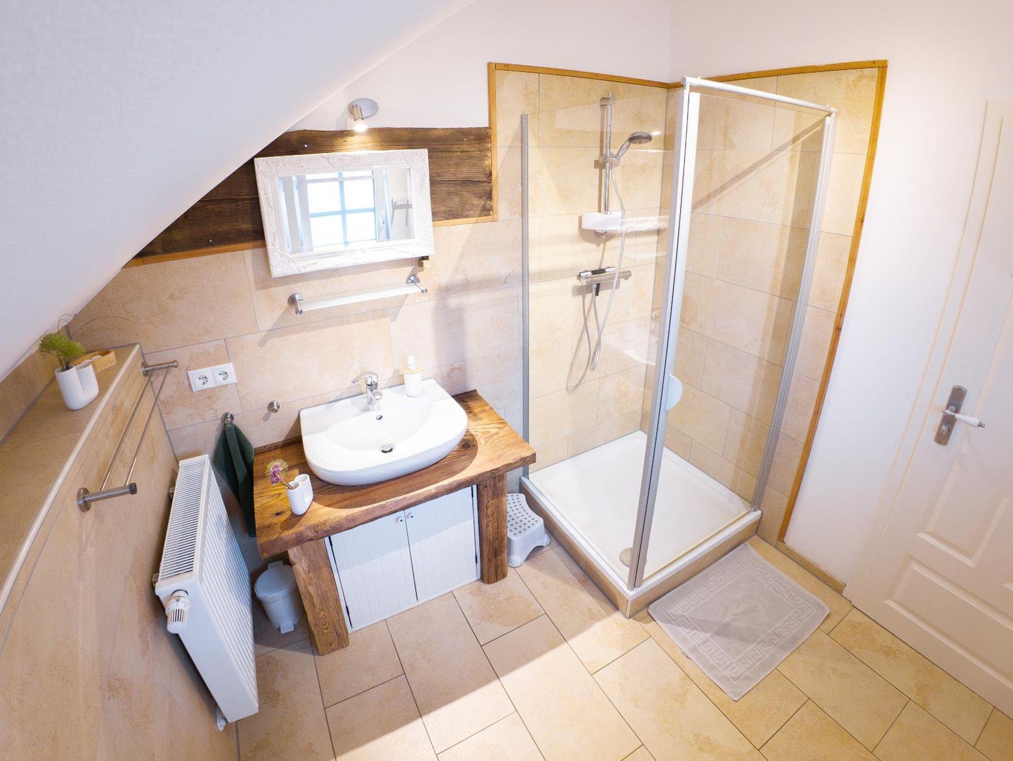 Sie liegt im 1. OG des Stallgebäudes und ist über den eigenen Balkon der Wohnung über eine Außentreppe (Gitterrost) zu erreichen. Die Wohnung verfügt über ein Tageslichtbad mit Dusche, WC und Urinal. Eine Einbauküche sowie ein großzügiger Wohn- und Essbereich mit Sat-TV, lädt zum Kochen und gemütlichen Zusammensitzen ein. In der Küche stehen Backofen und Kochfeld, Kaffeevollautomat, Kühlschrank, Toaster, Wasserkocher, Geschirrspüler und Radio zur Verfügung.