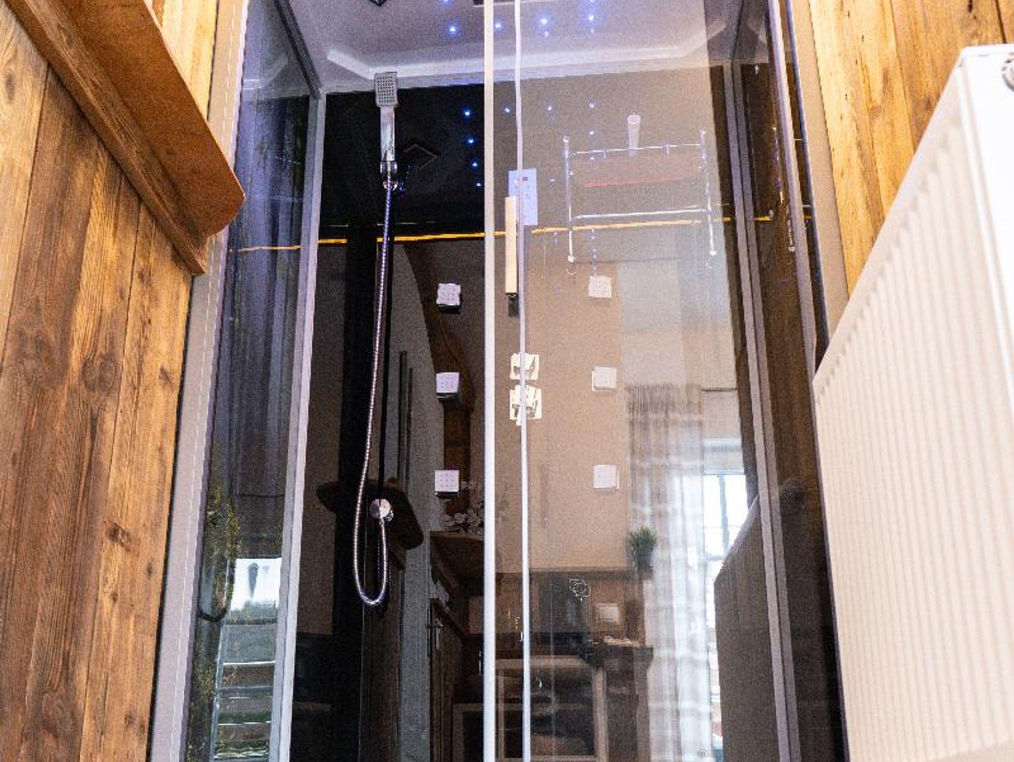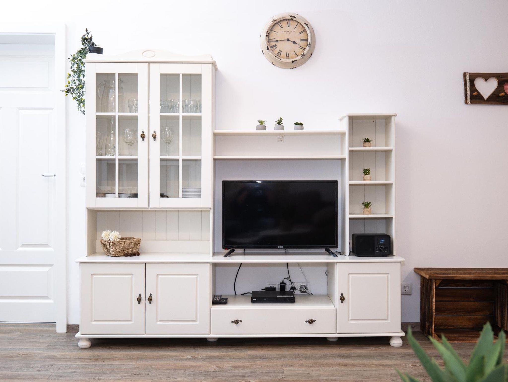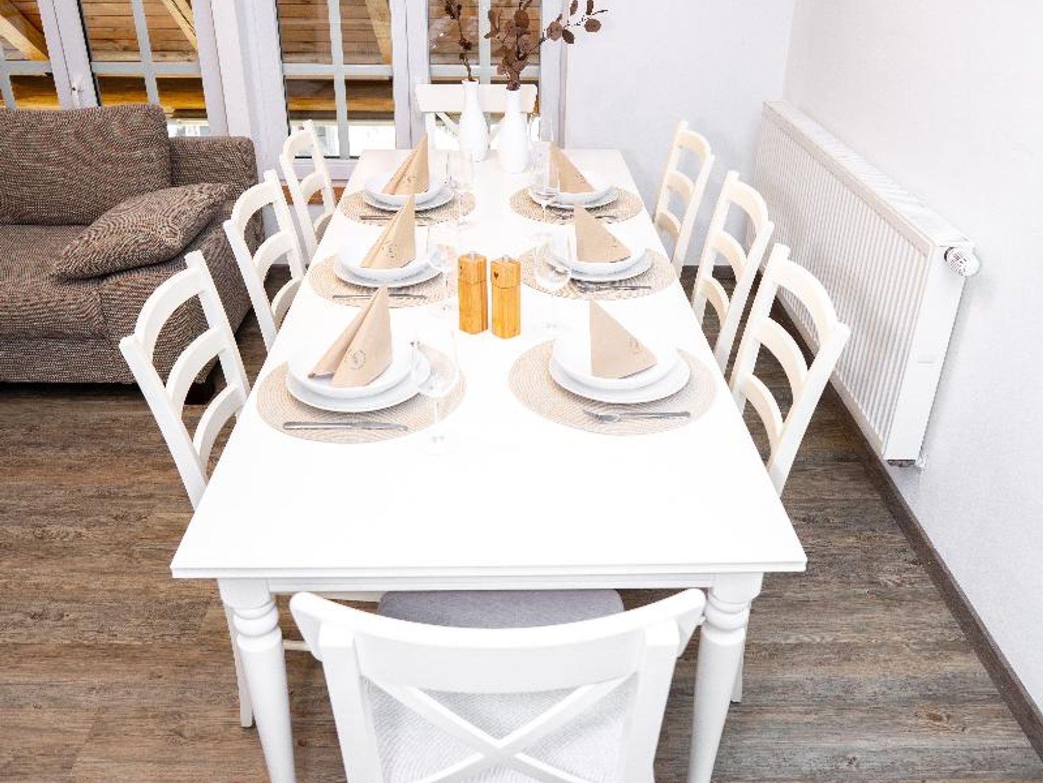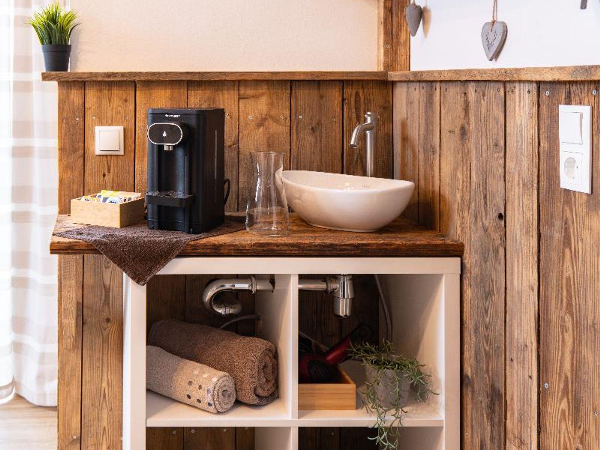 Sie liegt im 1. OG des Stallgebäudes und ist über den eigenen Balkon der Wohnung über eine Außentreppe (Gitterrost) zu erreichen. Die Wohnung verfügt über ein Tageslichtbad mit Dusche, WC und Urinal. Eine Einbauküche sowie ein großzügiger Wohn- und Essbereich mit Sat-TV, lädt zum Kochen und gemütlichen Zusammensitzen ein. In der Küche stehen Backofen und Kochfeld, Kaffeevollautomat, Kühlschrank, Toaster, Wasserkocher, Geschirrspüler und Radio zur Verfügung.