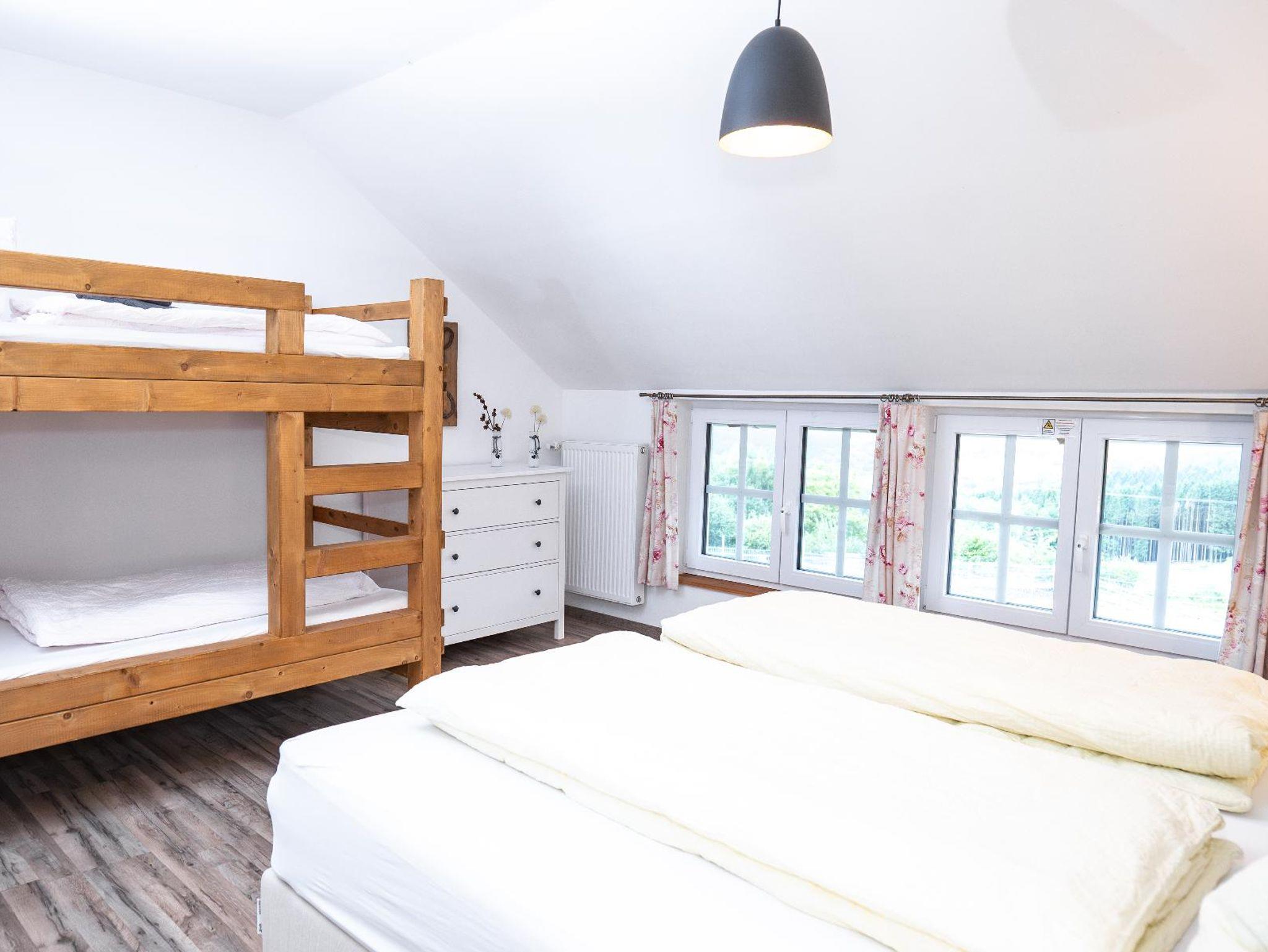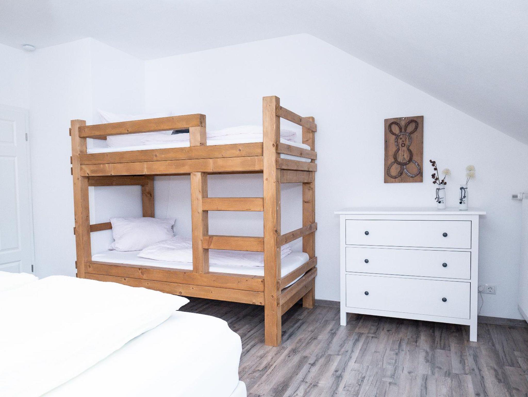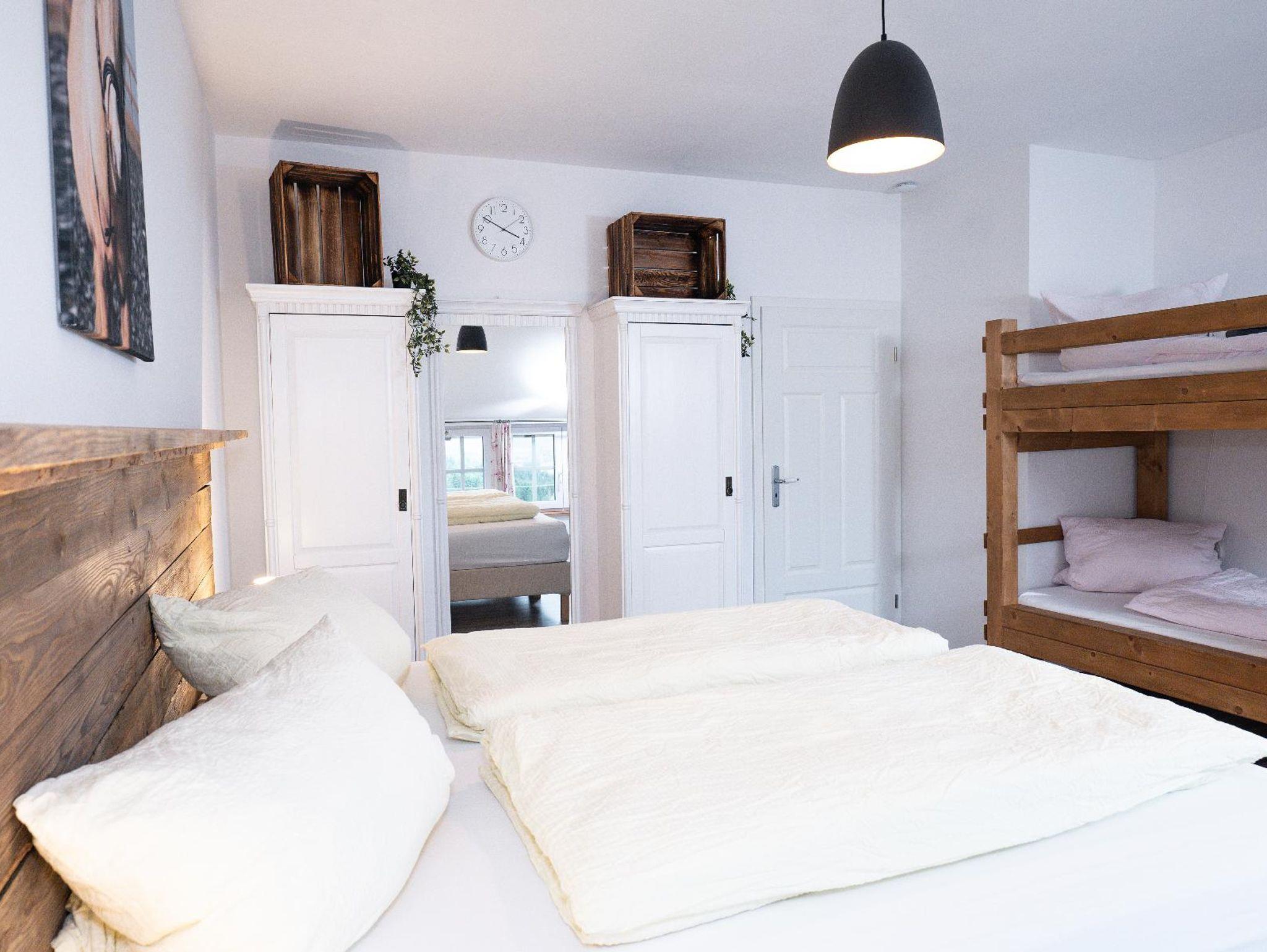 4-Bett-Zimmer „Fritzi“: Boxspring-Doppelbett (1,80×2,00m, kann als 2 Einzelbetten gestellt werden) und Etagenbett (0,90×2,00m). Zusätzlich mit kleinem Tisch und Sitzgelegenheiten.