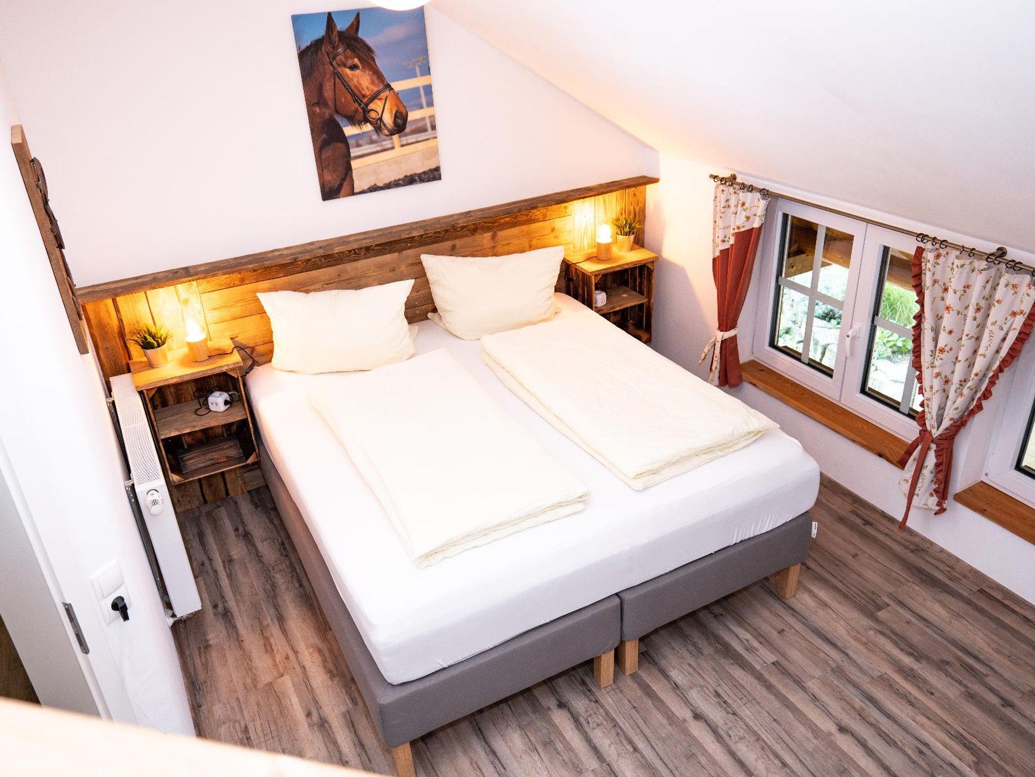 Alle Räume sind hell & liebevoll eingerichtet, einer der Schlafräume bietet direkten Blick ins Tal und auf die Pferde.