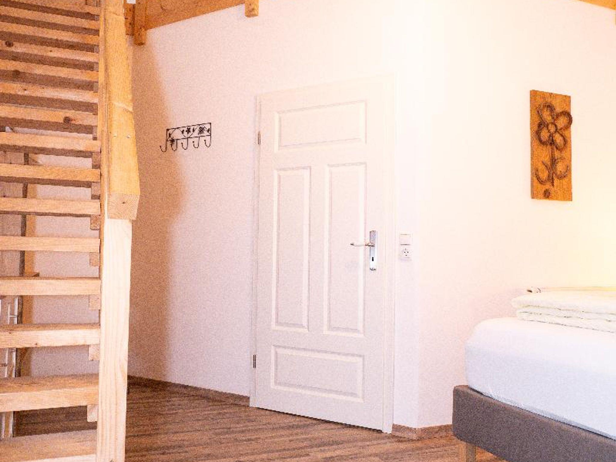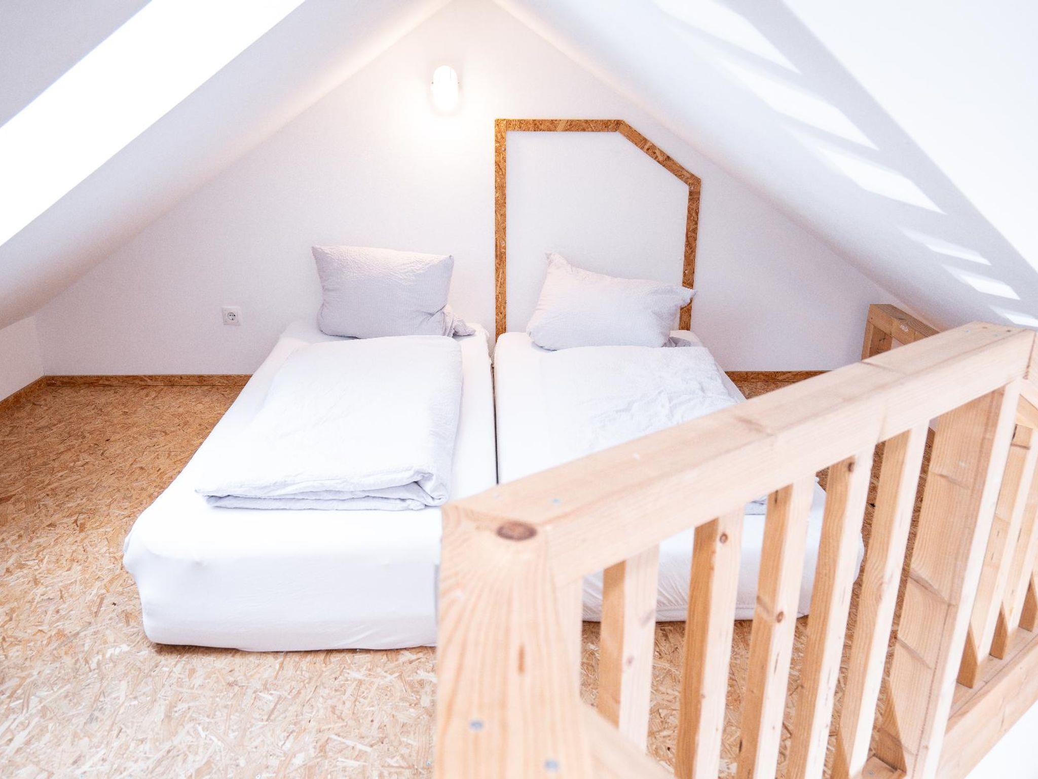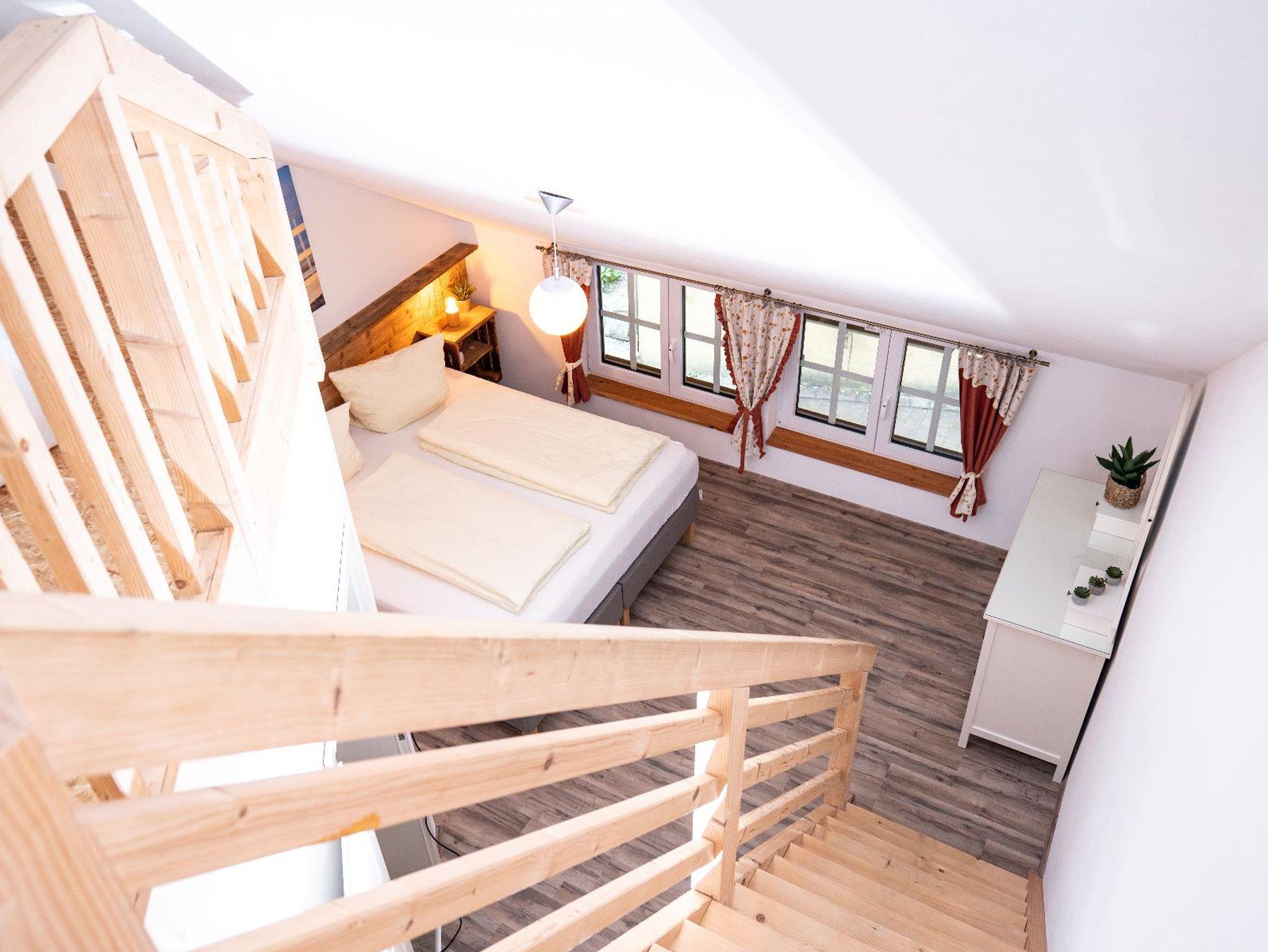 5-Personen-Zimmer „Lilly“: Boxspring-Doppelbett (1,80×2,00m), 2 Matratzen auf der Empore