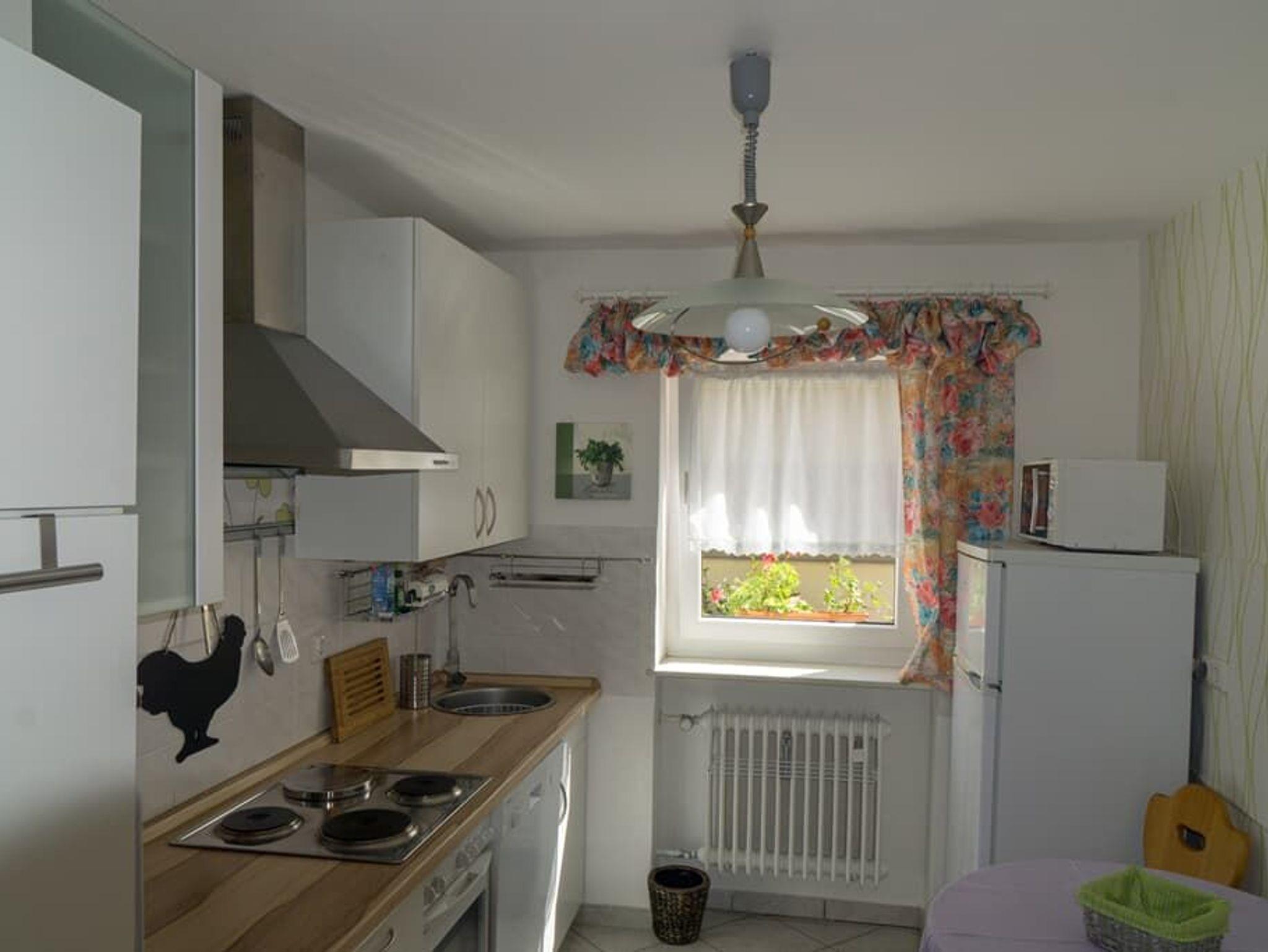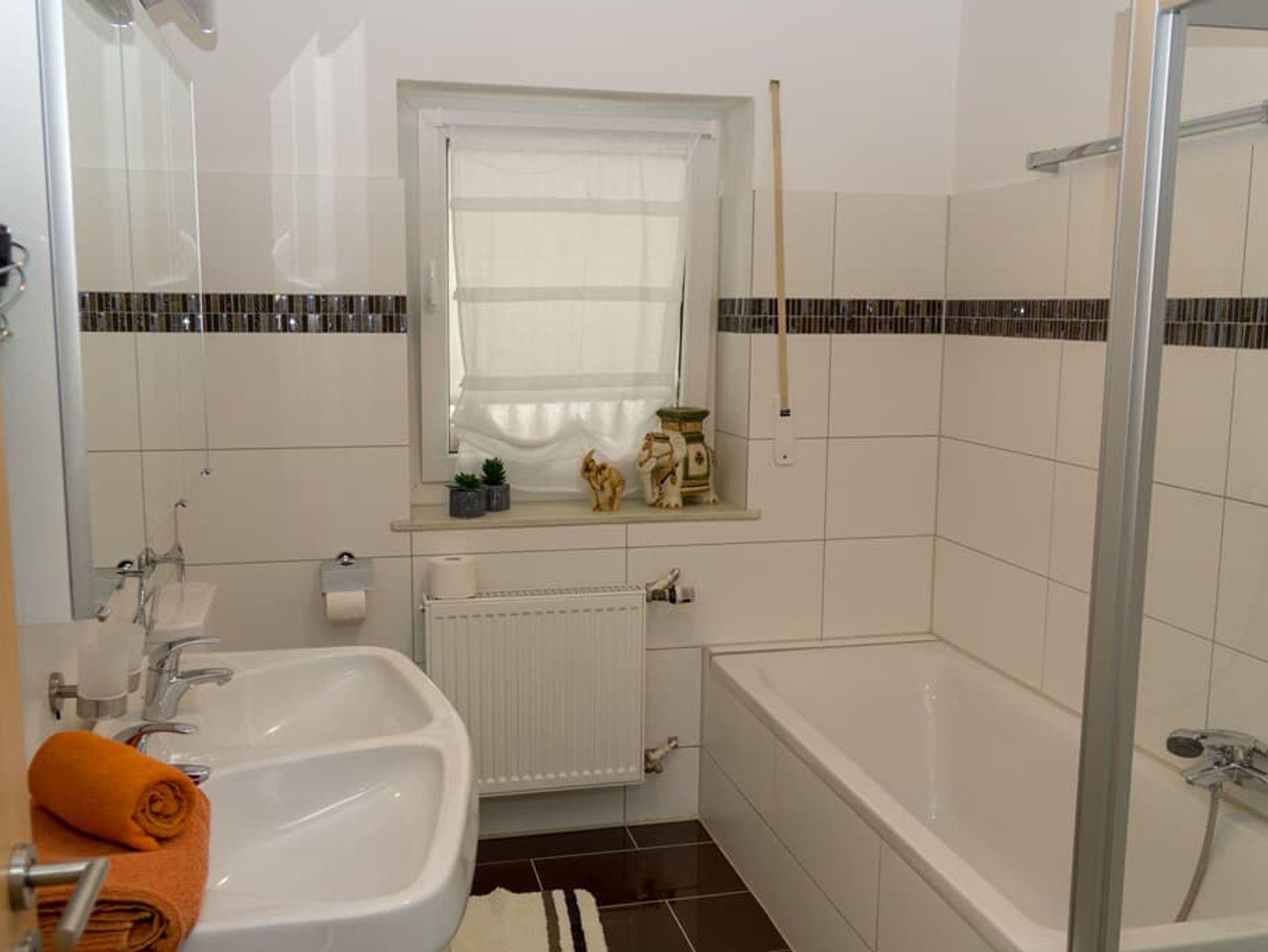 Die Ferienwohnung mit 110m² Wohnfläche und Balkon ist hell, freundlich und großzügig geschnitten. Die voll ausgestattete Wohnküche mit Essbereich, SAT-TV und Kachelofen verfügt über Spülmaschine, Kühlschrank mit kleinem Gefrierfach, Mikrowelle, Eierkocher, Herd, Backofen, Toaster und Kaffeemaschine und lässt keine Wünsche offen. Die beiden Schlafzimmer sind jeweils mit einem Doppelbett ausgestattet. Kinderbett und -hochstuhl sind vorhanden. Im Badezimmer sind sowohl Dusche als auch Badewanne vorhanden; zwei Waschbecken bieten mehr Komfort und Platz, um sich wie zuhause zu fühlen. Trockner, Waschmaschine, Bügelbrett und Bügeleisen sind vorhanden. Unsere Sauna im Haus können Sie kostenfrei nutzen. Vor allem im Sommer können Sie Grillabende in unserem Garten verbringen oder auf den Liegen einfach nur entspannen. Die Kinder finden dort mit Sandkasten und Rutsche Spiel und Spaß. Auch Räder und ein Schlauchboot für den nahegelegenen See können vermietet werden. Öffentliche Stellplätze stehen kostenfrei nahe der Unterkunft zur Verfügung. Ein privater PKW-Parkplatz kann nur auf Anfrage genutzt werden.