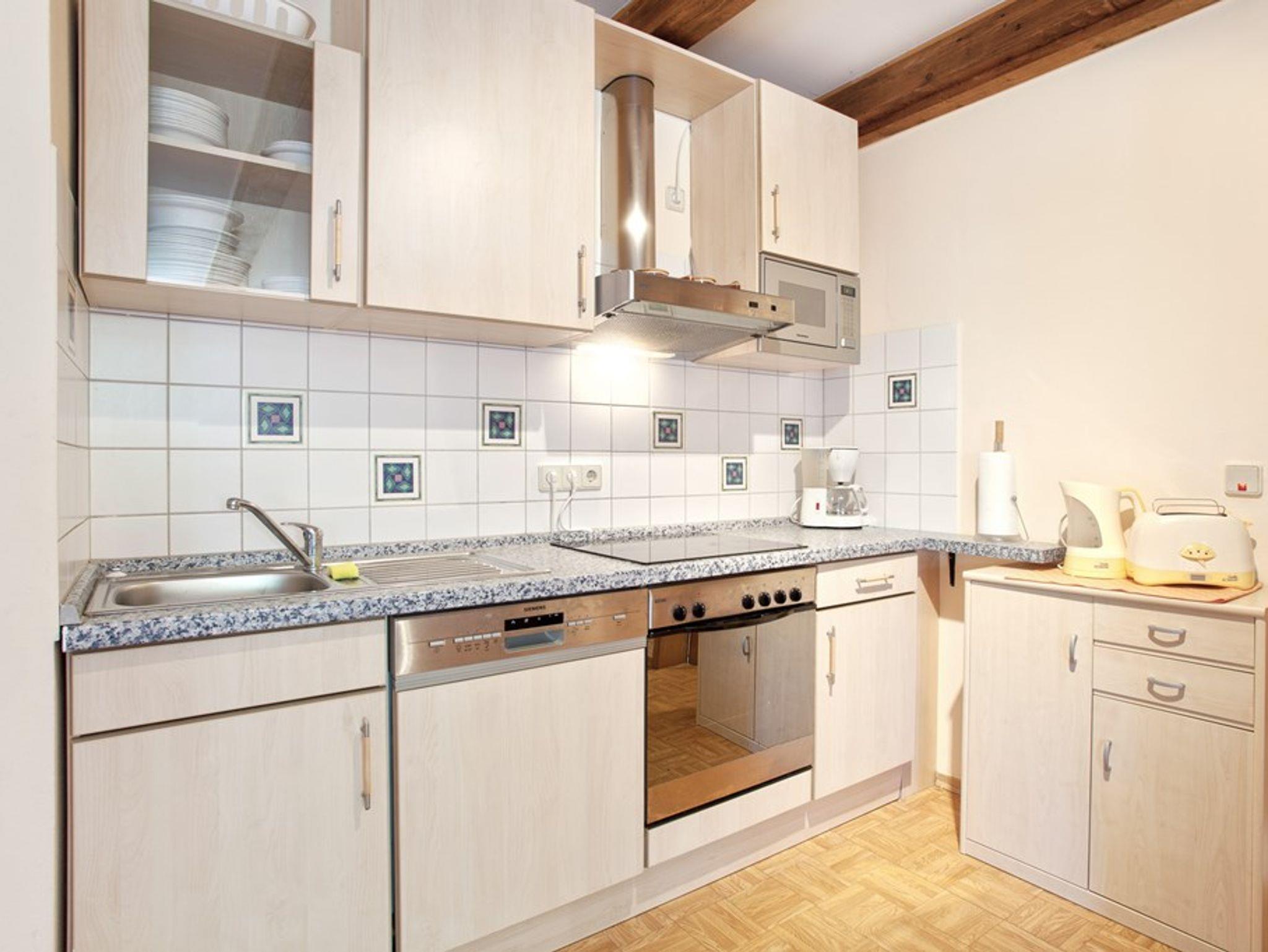 Geschirrspüler und ein Backofen mit 4 Herdplatten und eine Mikrowelle zur Nutzung bereit.