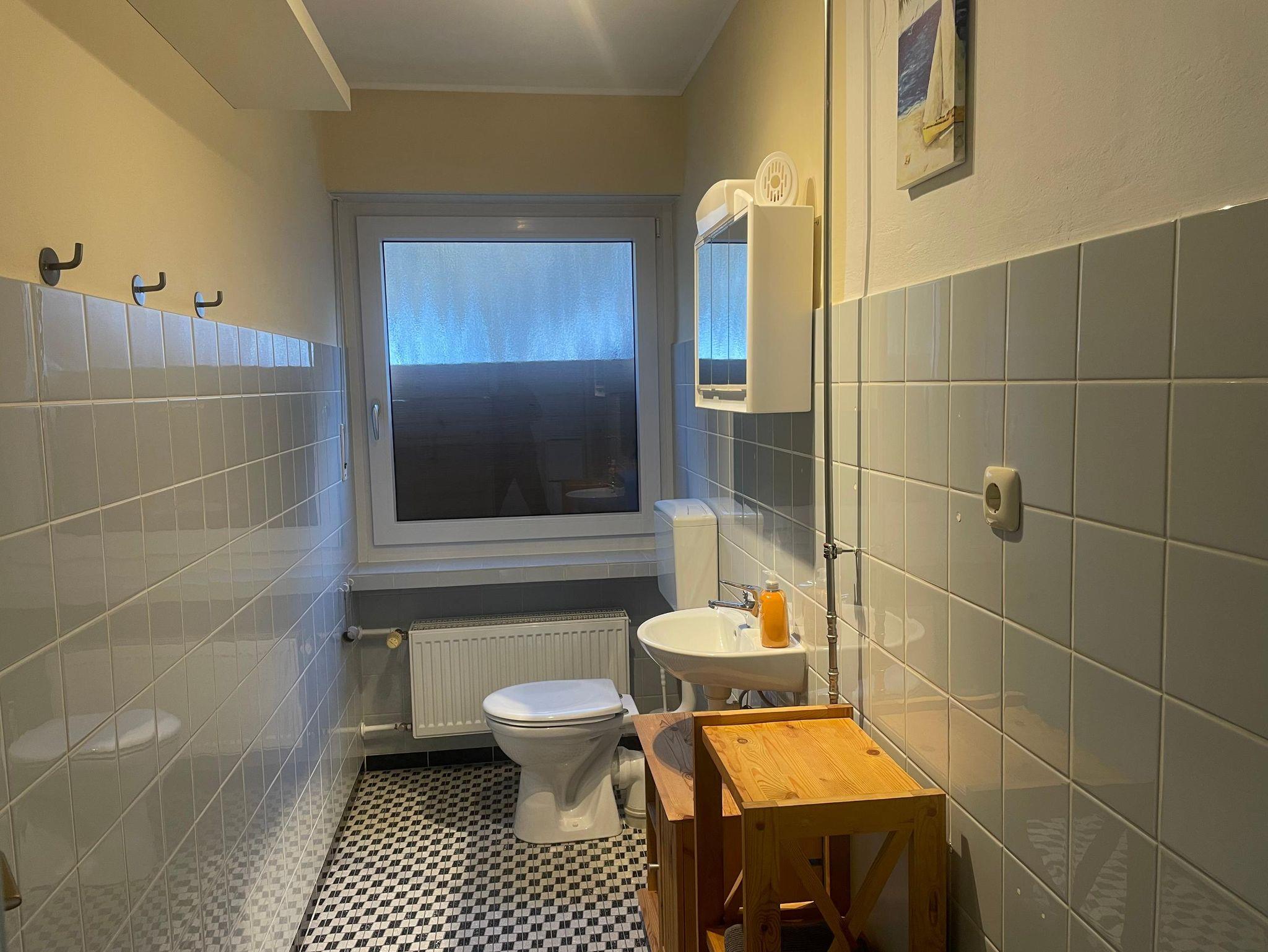 Das Bad mit Dusche (80x80) und WC hat ein großes Fenster.