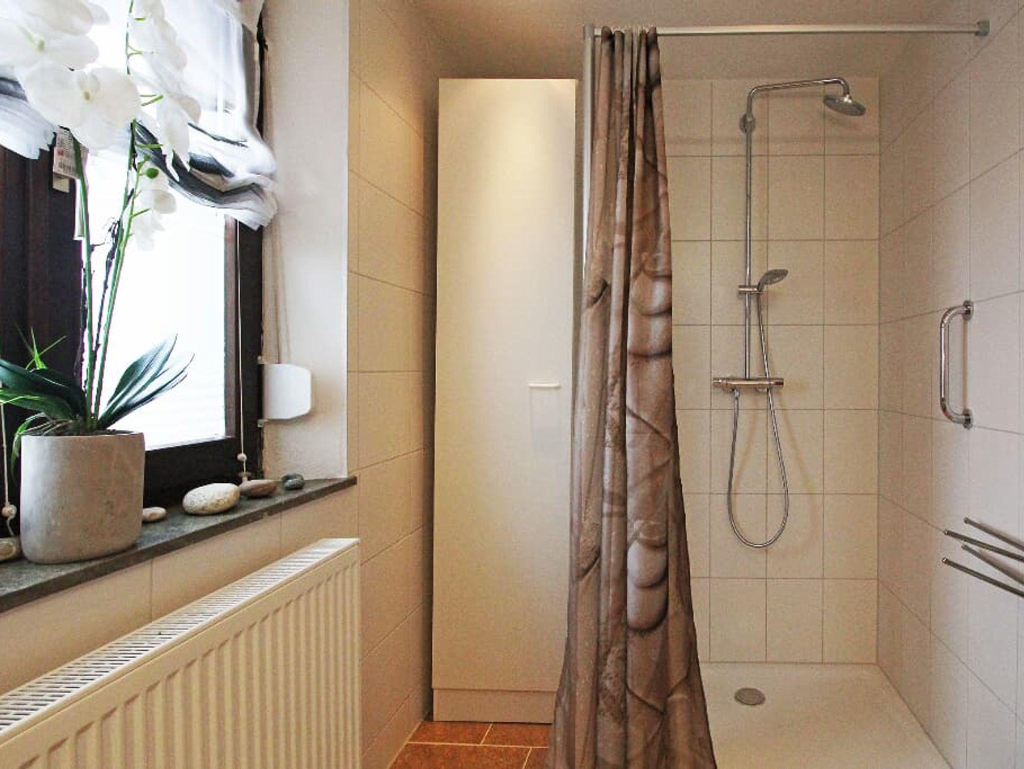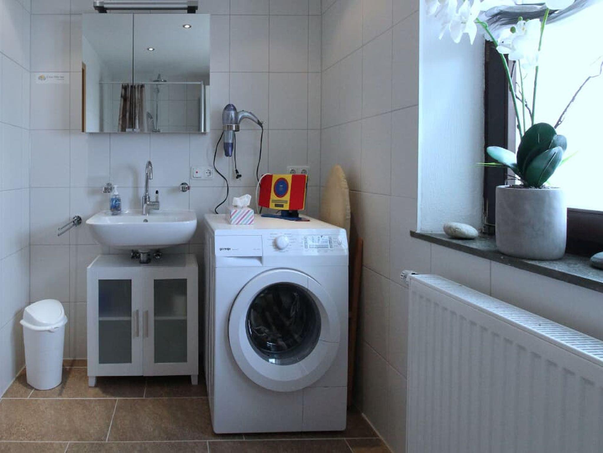 Duschraum mit Großraumdusche und bodenebenen, rutschfesten Einstieg, Spiegel, Duschstuhl sowie Föhn und Waschmaschine, Wäscheständer, Radio, Bügeleisen, Bügelbrett und Erste Hilfe-Set.