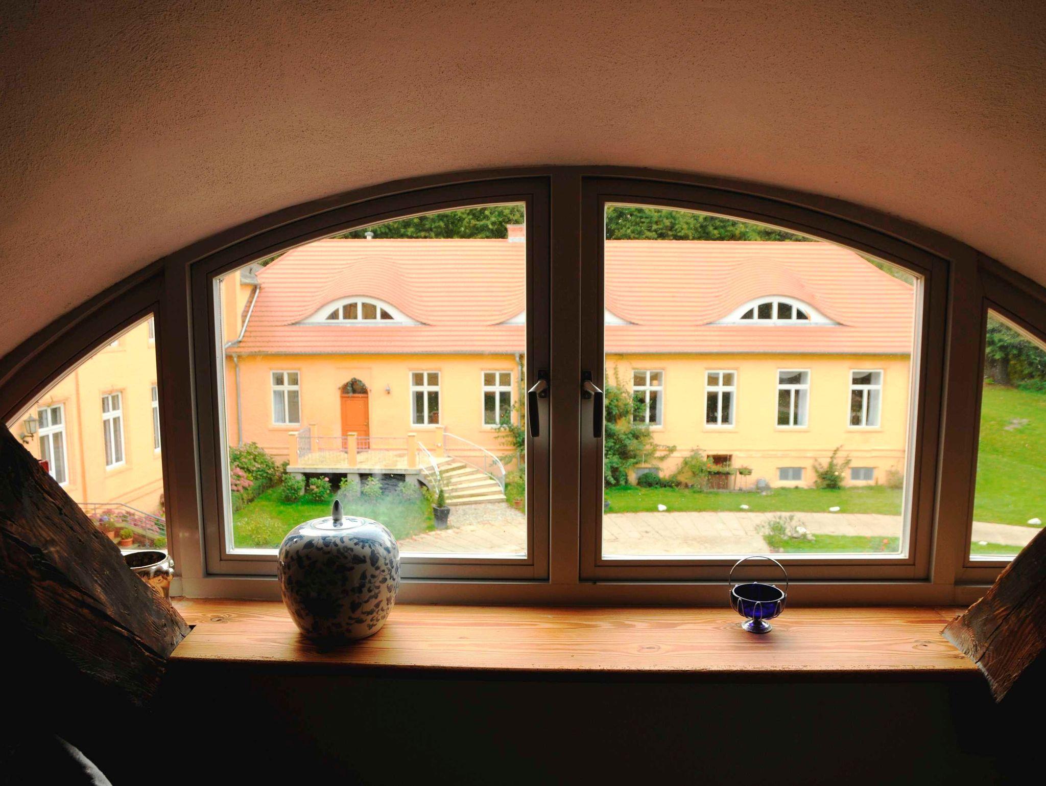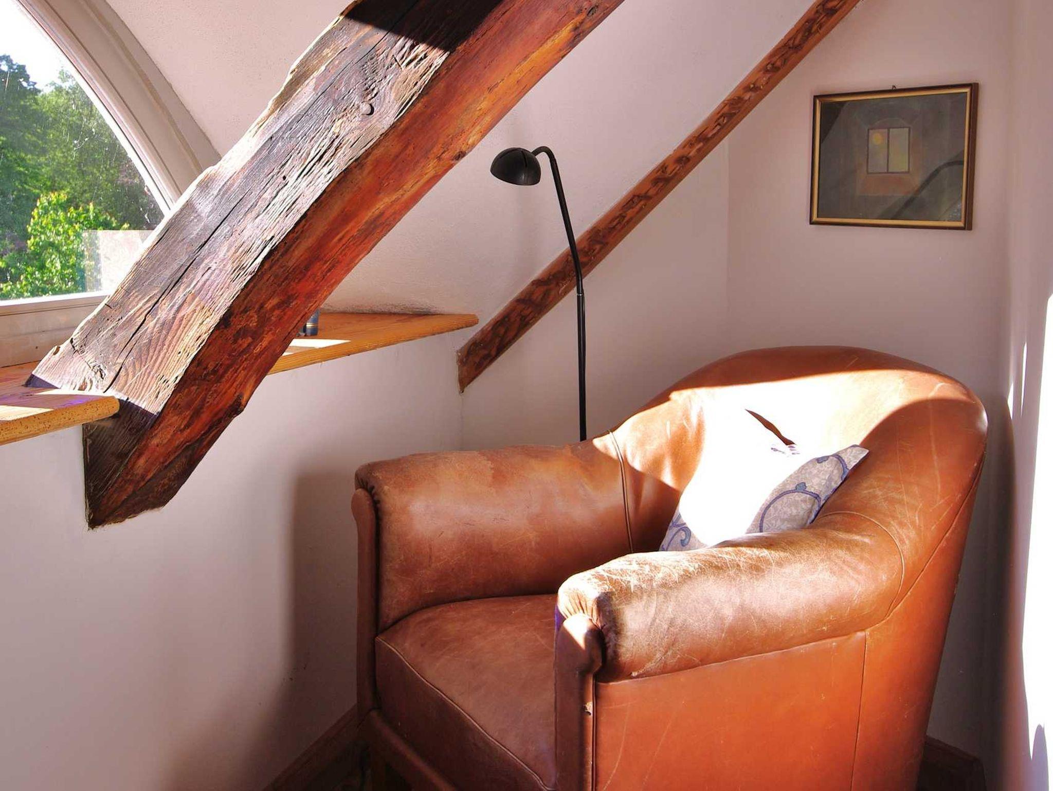 Die Zofenkammer ist eine kleine süße Wohnung (48 qm) im 2. OG des Kavliershauses mit gemütlichem Kaminofen. Der Blick geht in die östliche Lindenallee (Schlafen) und nach Westen über den Ehrenhof.
