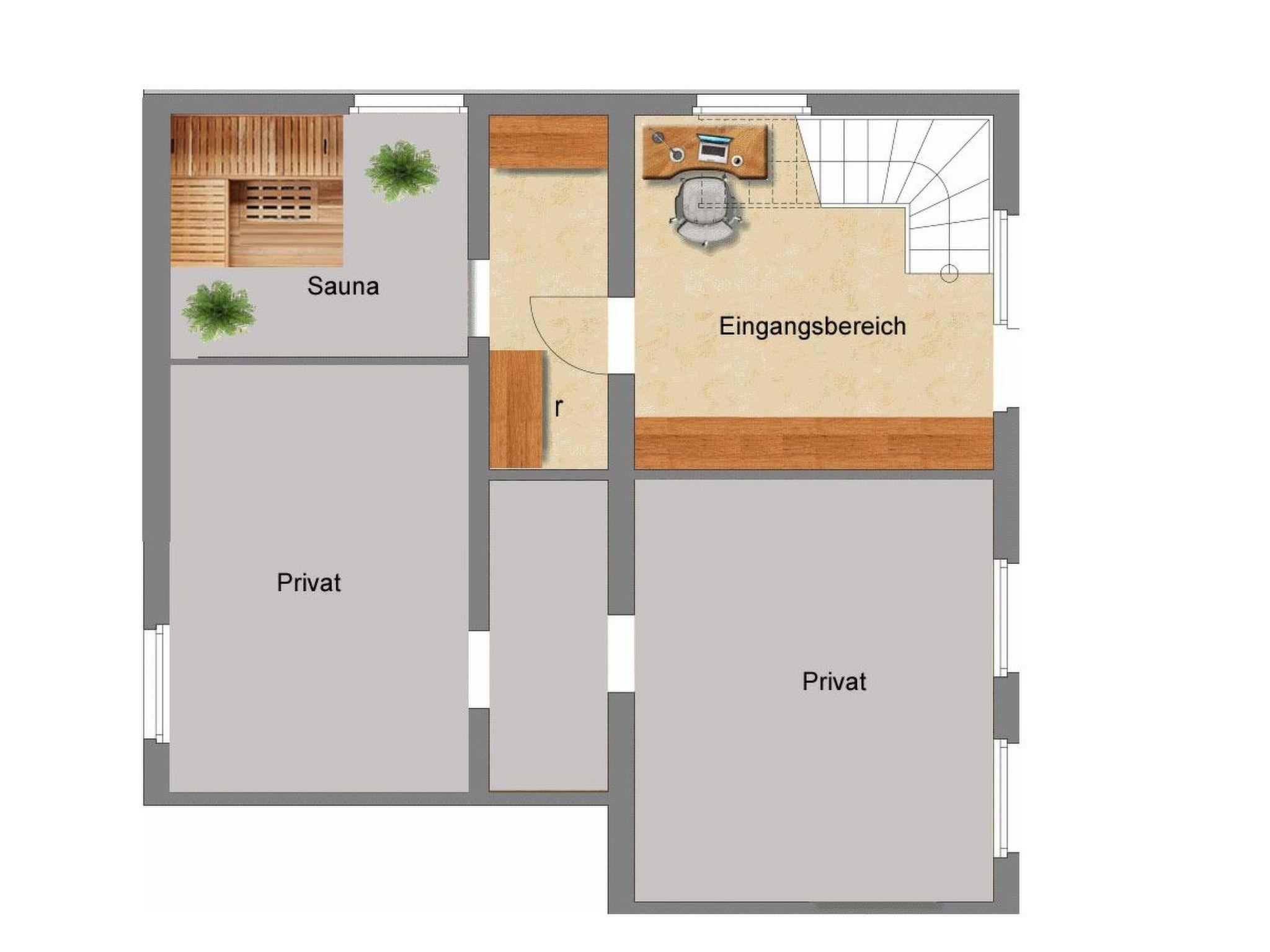 On the ground floor there is a spacious entrance area with a small office corner - from there you can access the small wellness area with an infrared sauna.