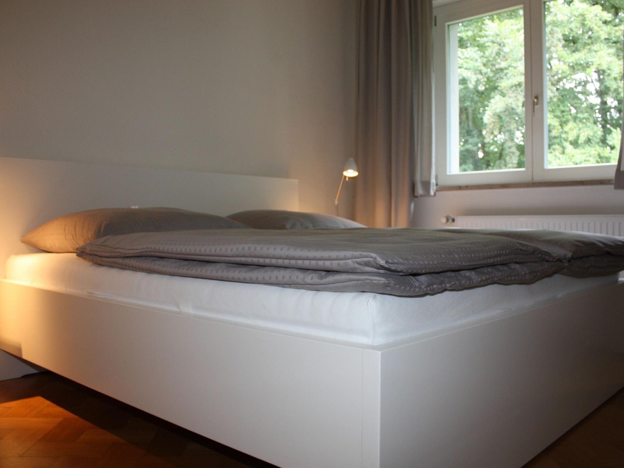 You can relax in the big garden with century-old trees and a pond with lilies, as well as the newly designed rose and perennial garden. There is a generous garden sitting area with comfortable garden furniture, a parasol and grill in the sunny orchard right by the house. There are further seating and loungers, as well as a campfire area, in the park. The park was laid out according to the ideas of the garden architect Rudolf Ehlgötz in the 1930s. The apartment has a car parking space and lockable storage space for bicycles or skis.