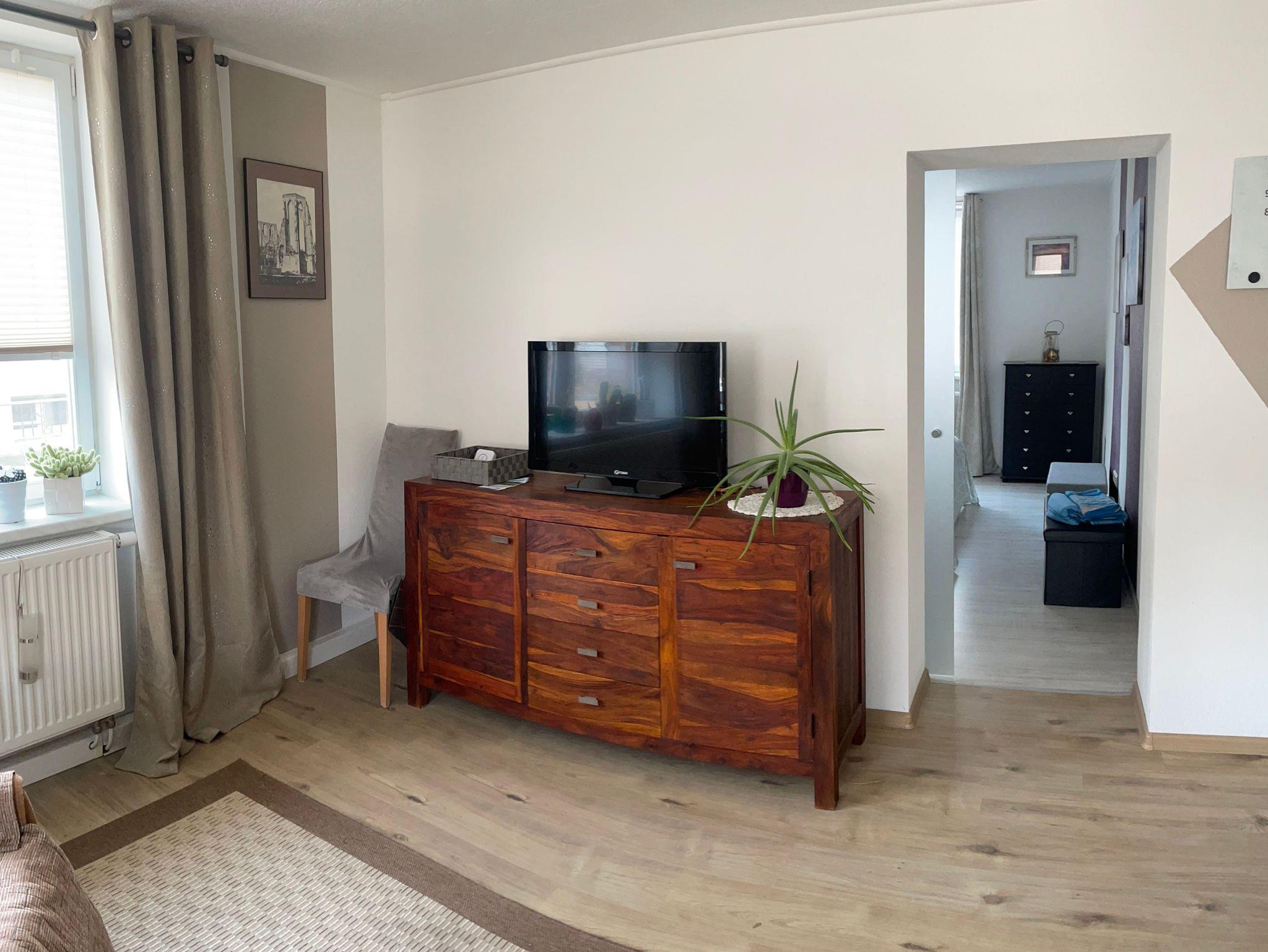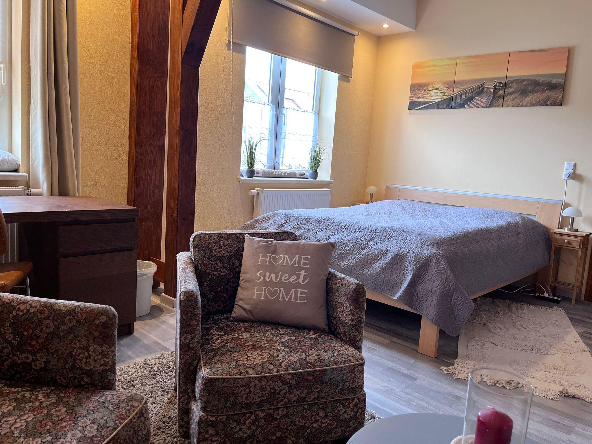 Die Ferienwohnung befindet sich im Erdgeschoss der Villa Genzel. Sie verfügt über ein Wohnzimmer mit angrenzendem Schlafzimmer sowie einem zweiten Schlafzimmer mit eigenem Arbeits- und Sitzbereich. Die Küche ist voll ausgestattet und das Bad verfgt über eine ebenerdige Dusche.
