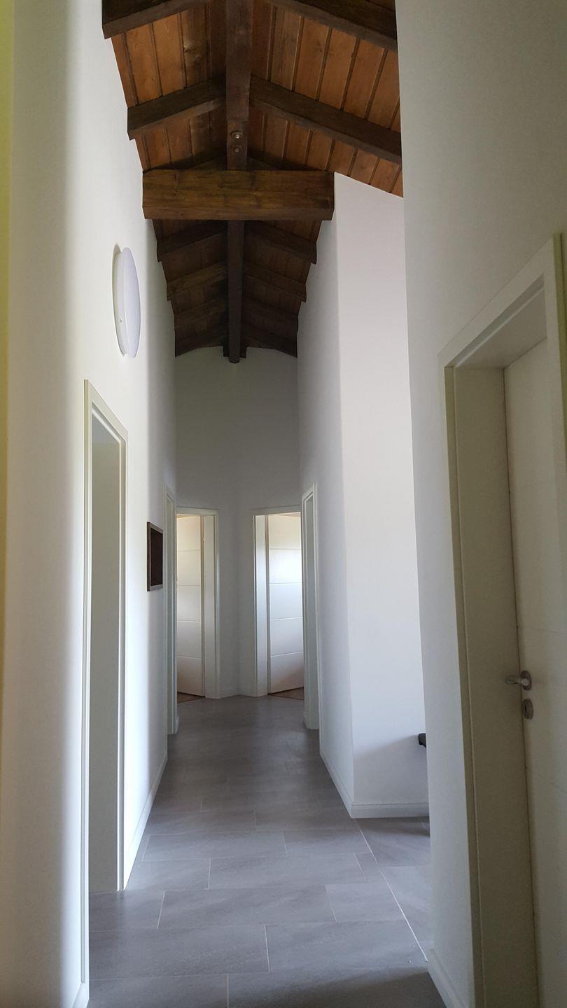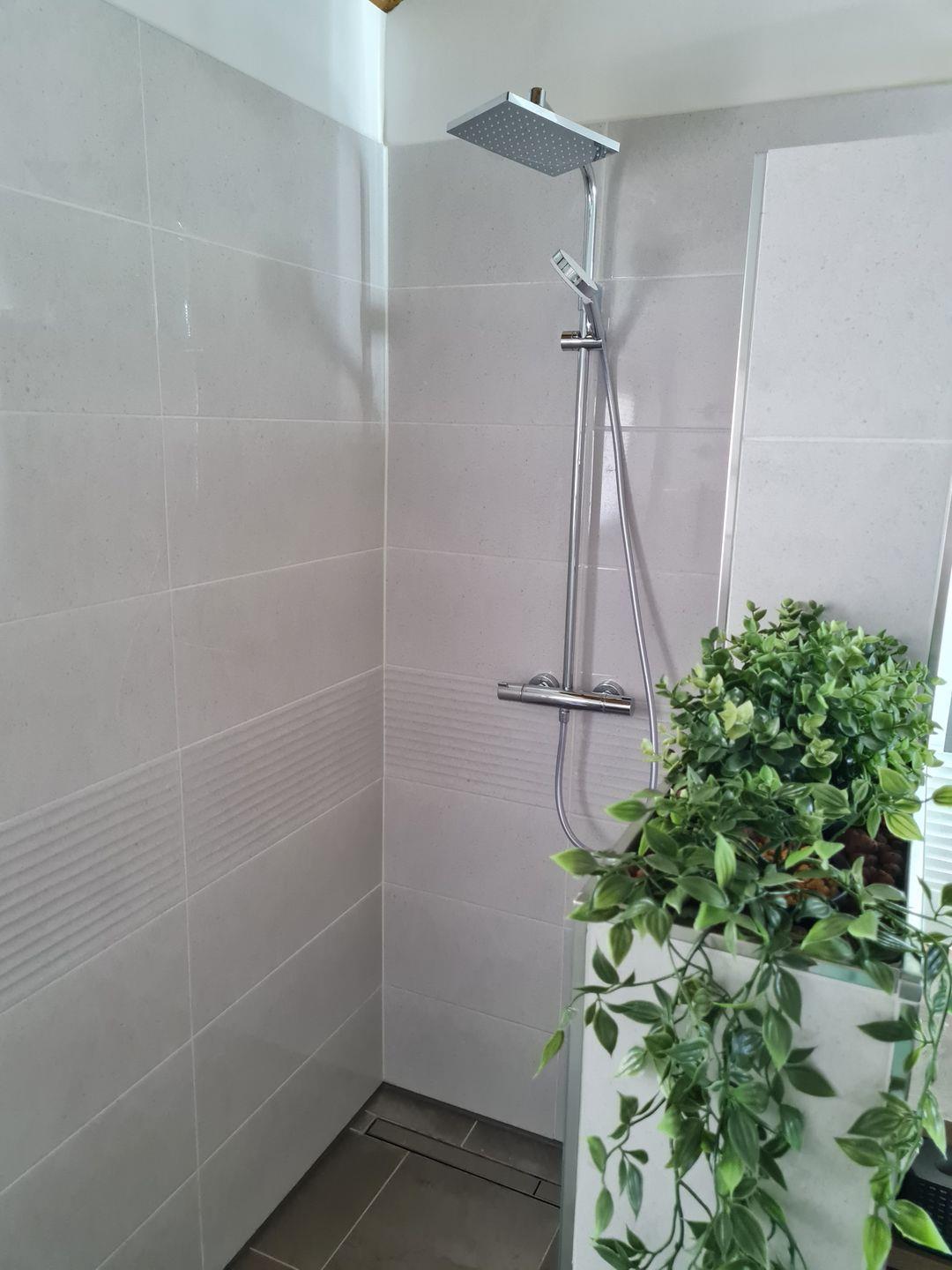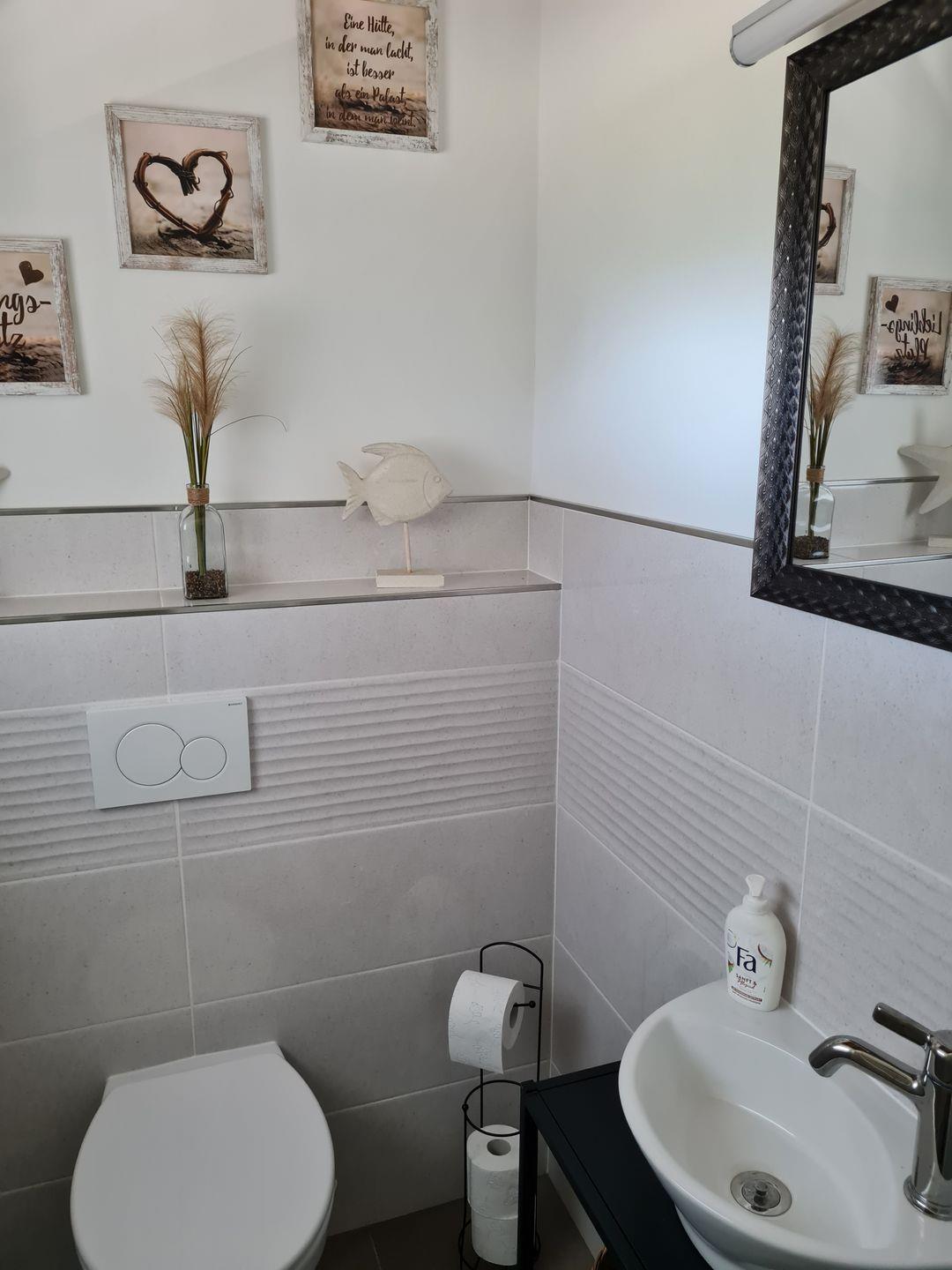 Im Tageslichtbad befinden sich zwei Waschtische, eine bodengleiche Dusche und eine Toilette. Zusätzlich gibt es ein Gäste WC mit Waschbecken