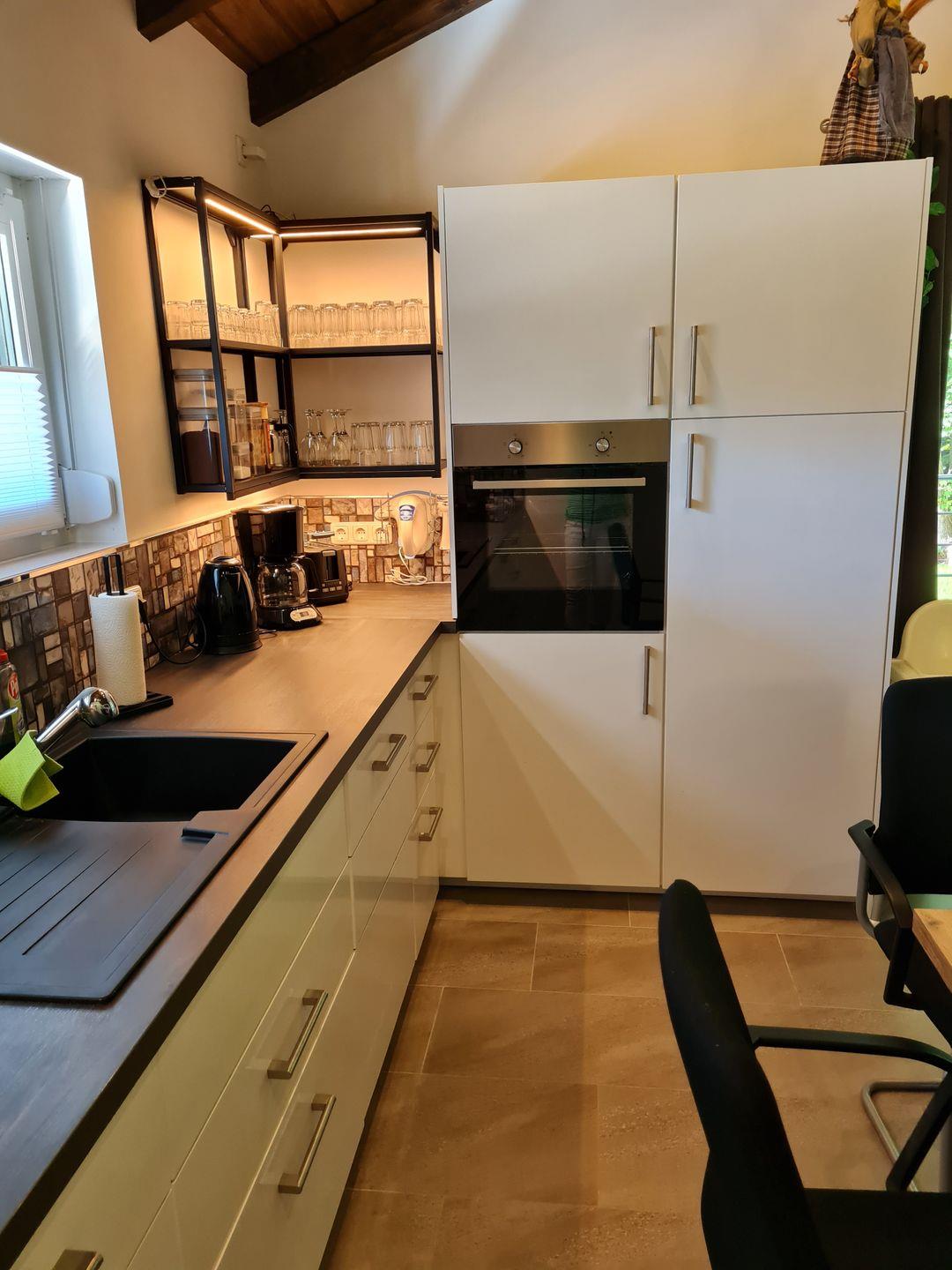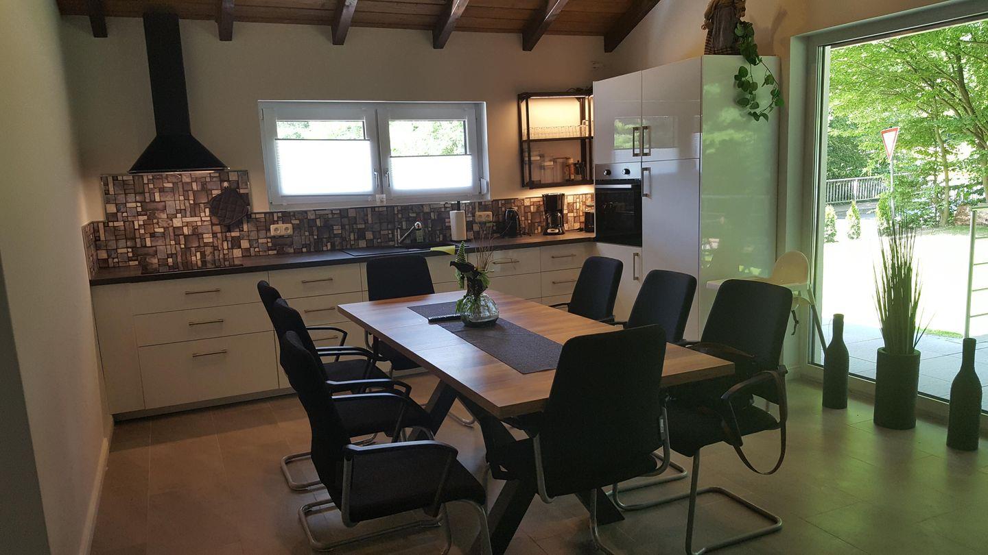 Die große Ess- und Wohnlandschaft mit komplett ausgestatteter Küchenzeile lädt am Esstisch in großer Runde ein. Das moderne Ecksofa bietet ausreichend Platz für gemütliche Fernsehabende.