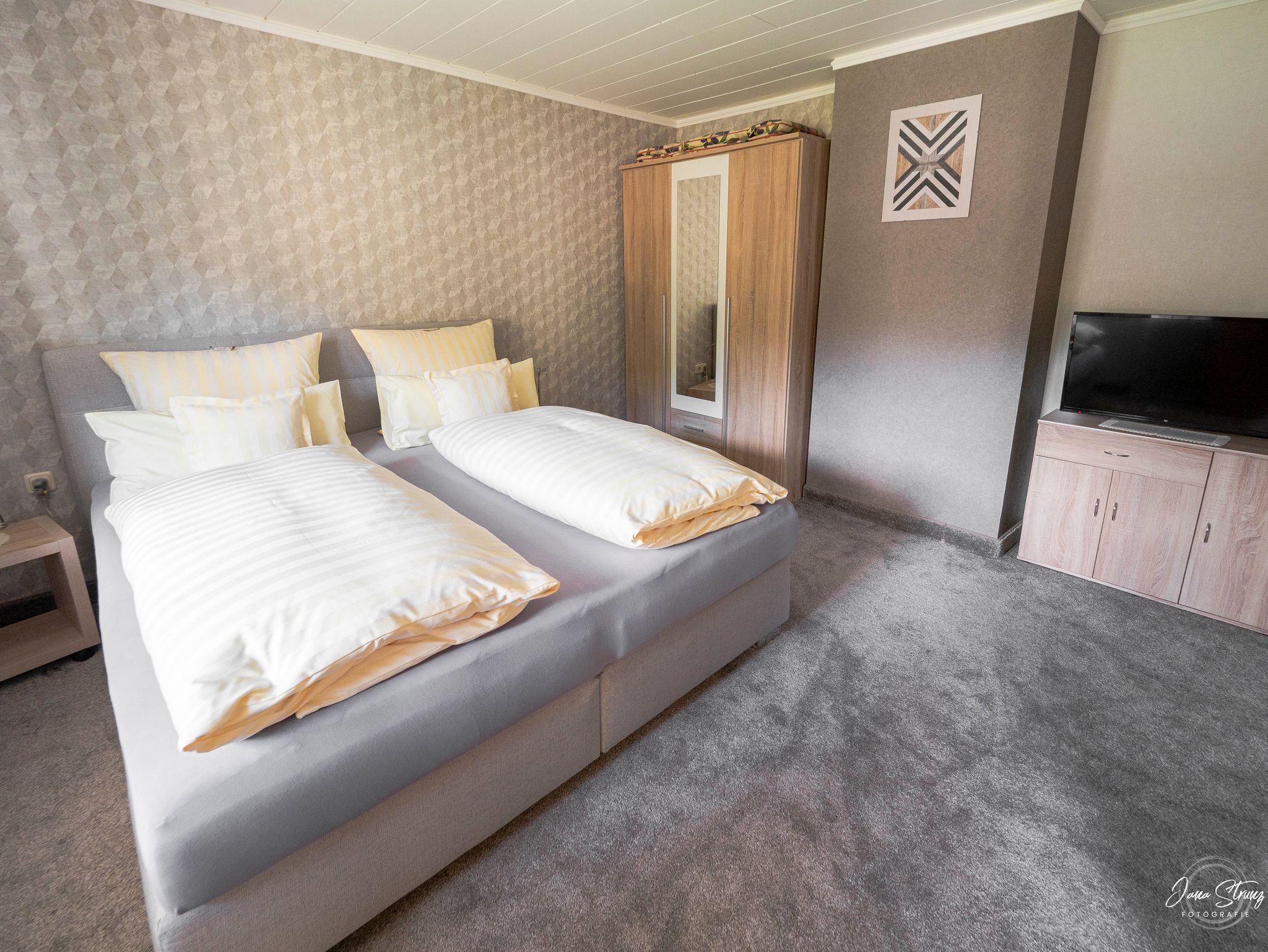 Die modern ausgestattete Ferienwohnung (65qm) verfügt über ein Schlafzimmer mit hochwertigem King-Size Boxspringbett und einem kleiner Flat-TV.