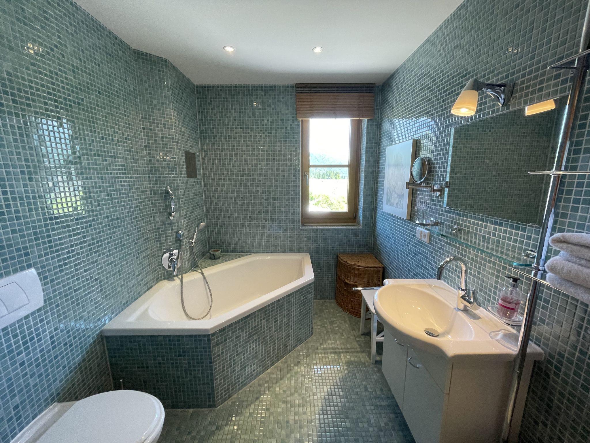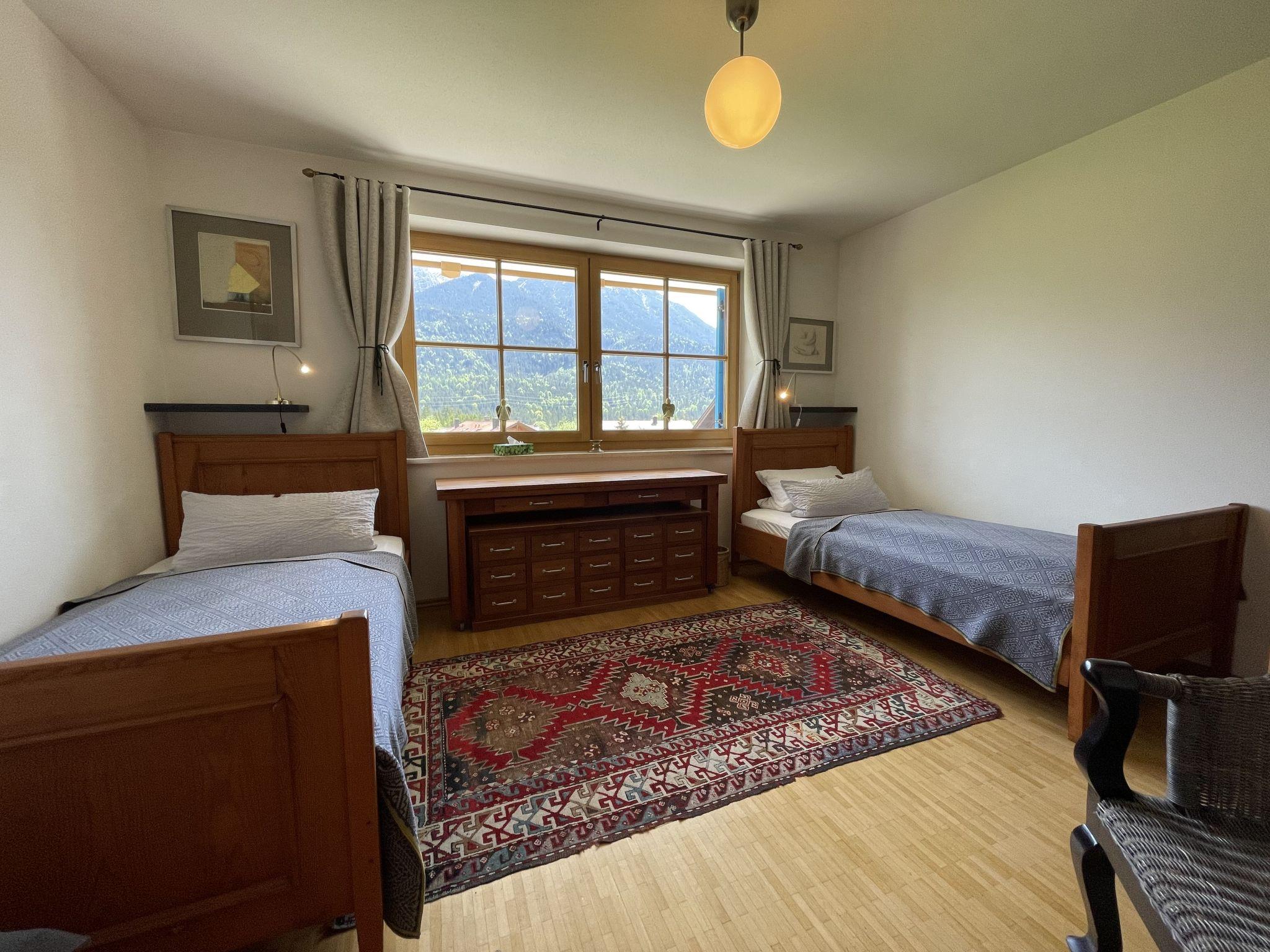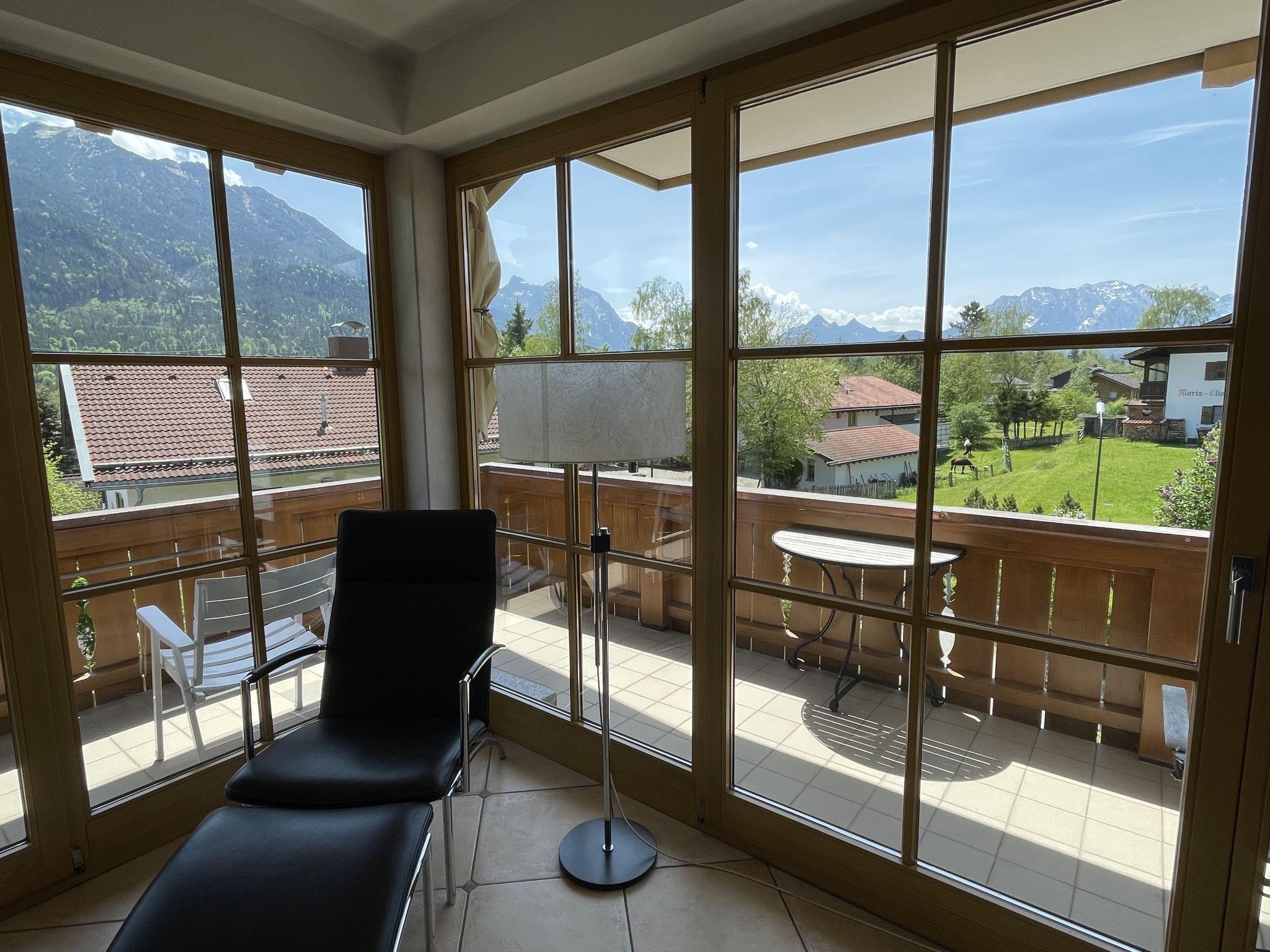 3-room apartment 92 m2 on 1st floor. Modern and stylish furnishings: living room with cable TV (flat screen), DVD. Exit to the balcony. 1 room with 2 beds. 1 double bedroom. Kitchen (oven, dishwasher, microwave, electric coffee machine) with dining table. Shower/WC, bath/shower/WC. Floor heating. Balcony 16 m2, south facing position. Balcony furniture, barbecue. Very beautiful panoramic view of the mountains. Facilities: washing machine, dryer. Internet (WiFi, free). Please note: non-smokers only. High-quality equipment with parquet and terracotta floors as well as designer furniture. Kitchen with corner seat and W-LAN radio. Very nice panoramic view from the balcony on Karwendel, Stubai, Wetterstein Mountains and Zugspitze.