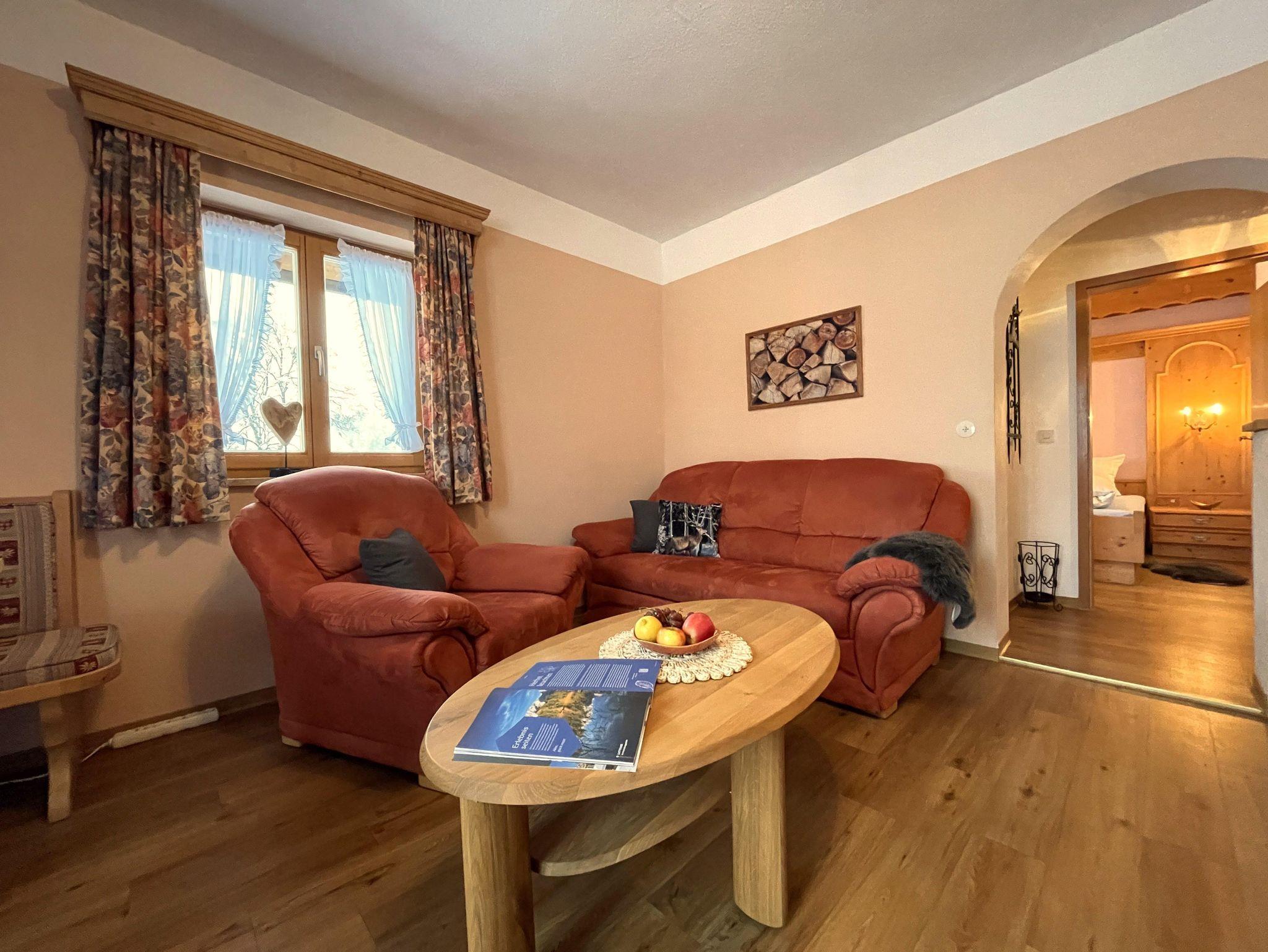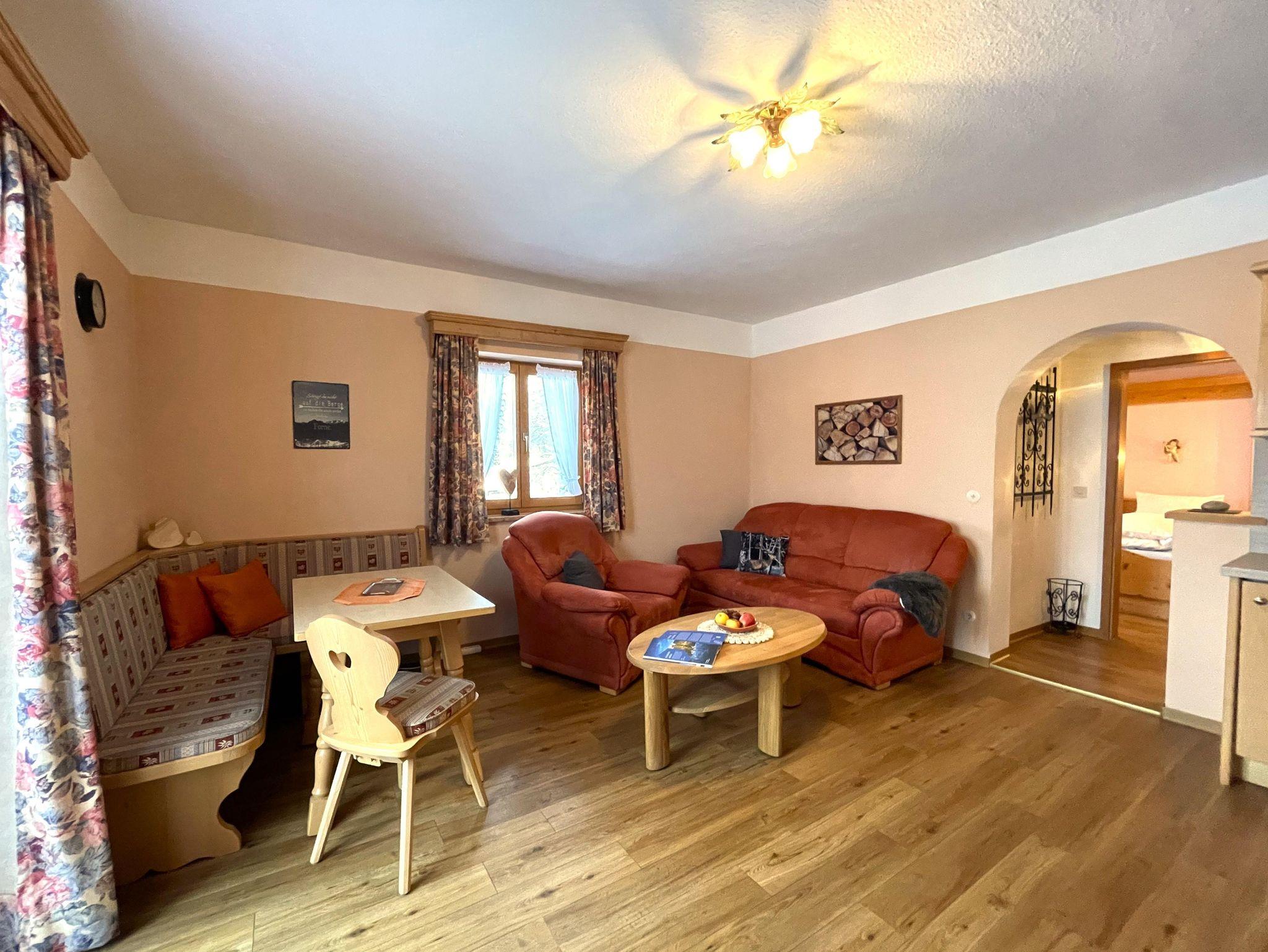 Gemütlich eingerichteter Wohnraum mit Schlafcouch für zwei Personen und Sessel, Eßecke für 4 Personen und voll ausgestattete Küchenzeile.
