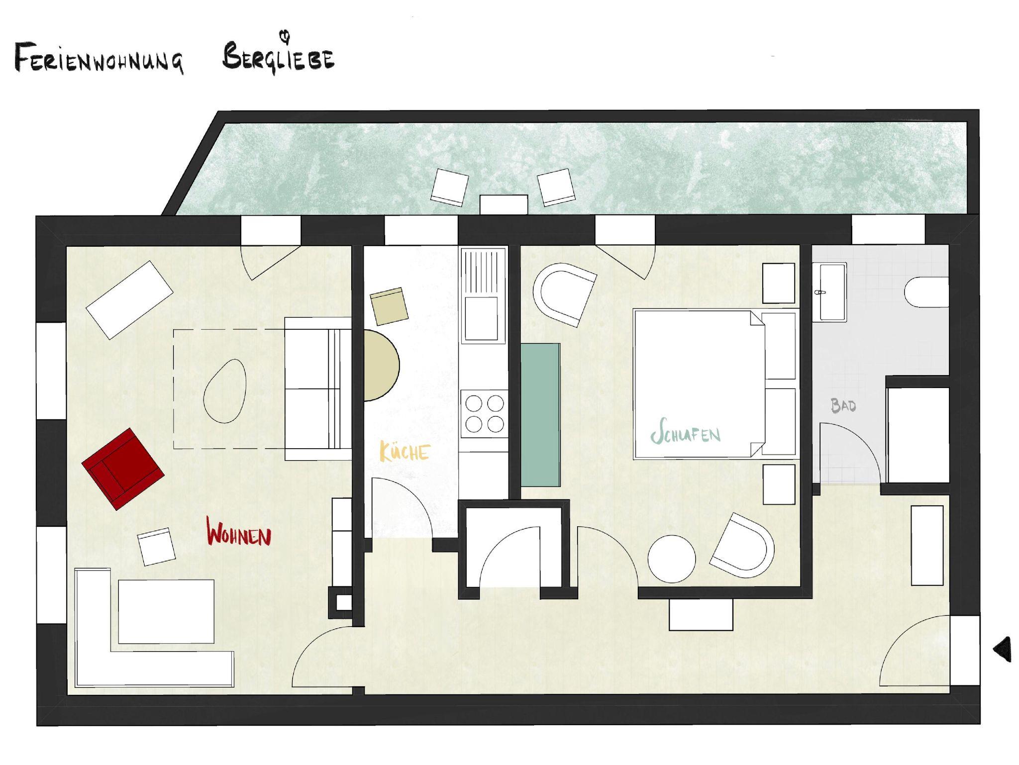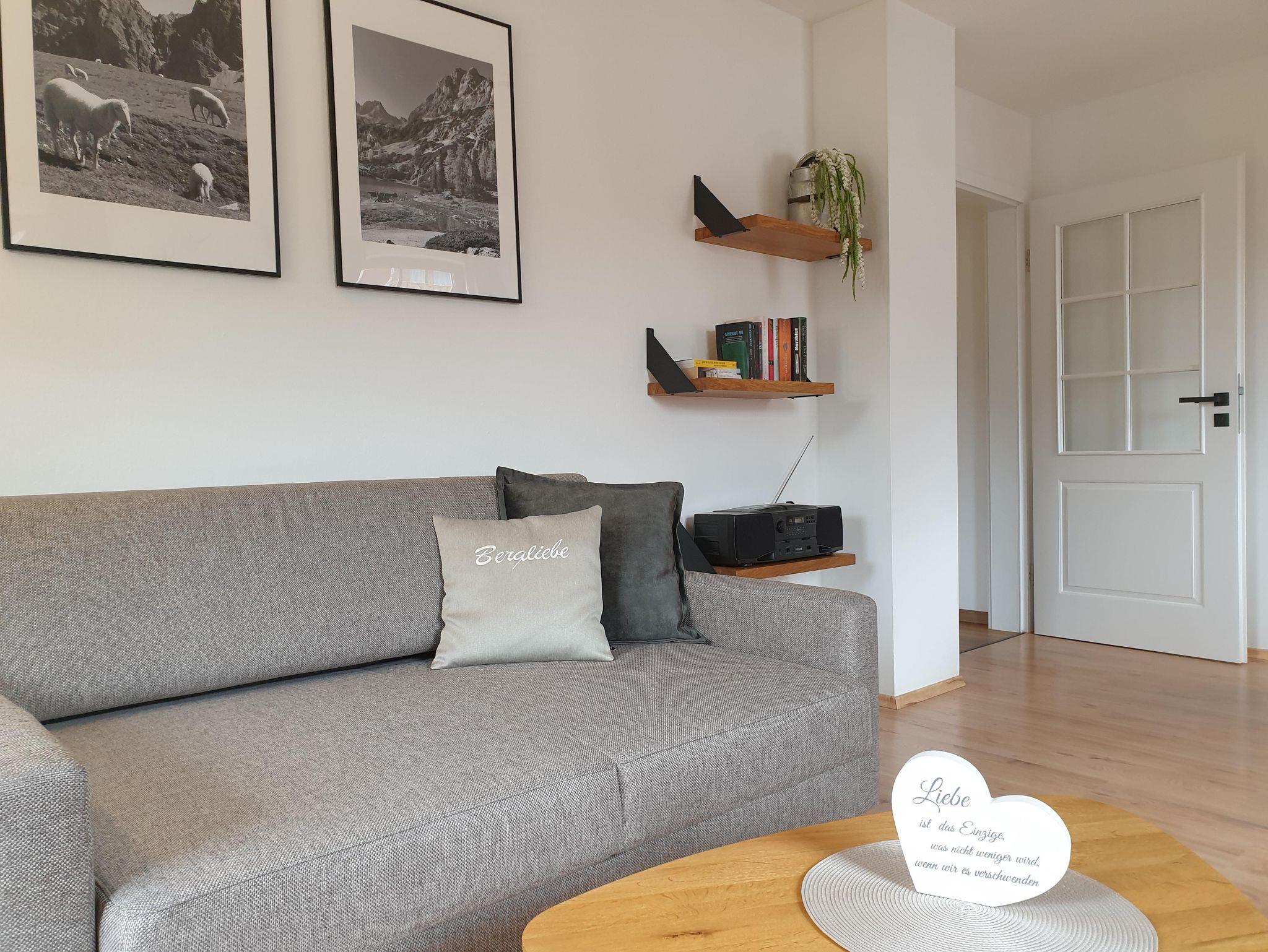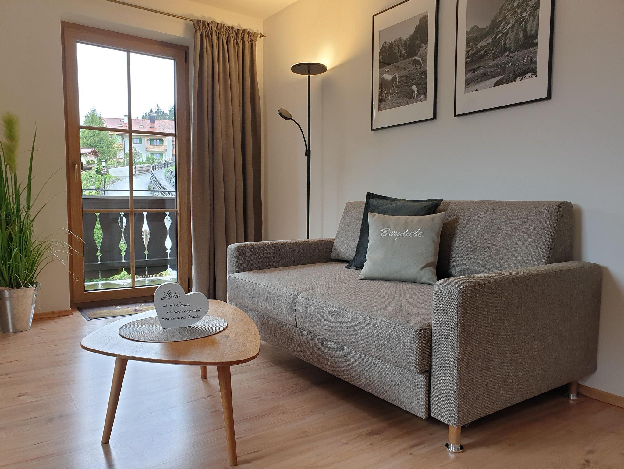 Die frisch renovierte Ferienwohnung Bergliebe im ersten Stock mit ruhigem, möblierten Süd-Westbalkon verfügt über einen großzügigen Wohnraum mit Essecke, bequemem Sofa/Schlafsofa und TV, sowie über ein gemütliches, separates Schlafzimmer mit Zirbenholz-Doppelbett, eine separate komplett ausgestattete Küche und ein modernes Badezimmer mit WC, Waschbecken und Dusche mit tiefem Einstieg. Gratis Waschmaschine und Trockner, sowie PKW-Stellplatze und Garage für Fahrräder und Sportequipment direkt am Haus.