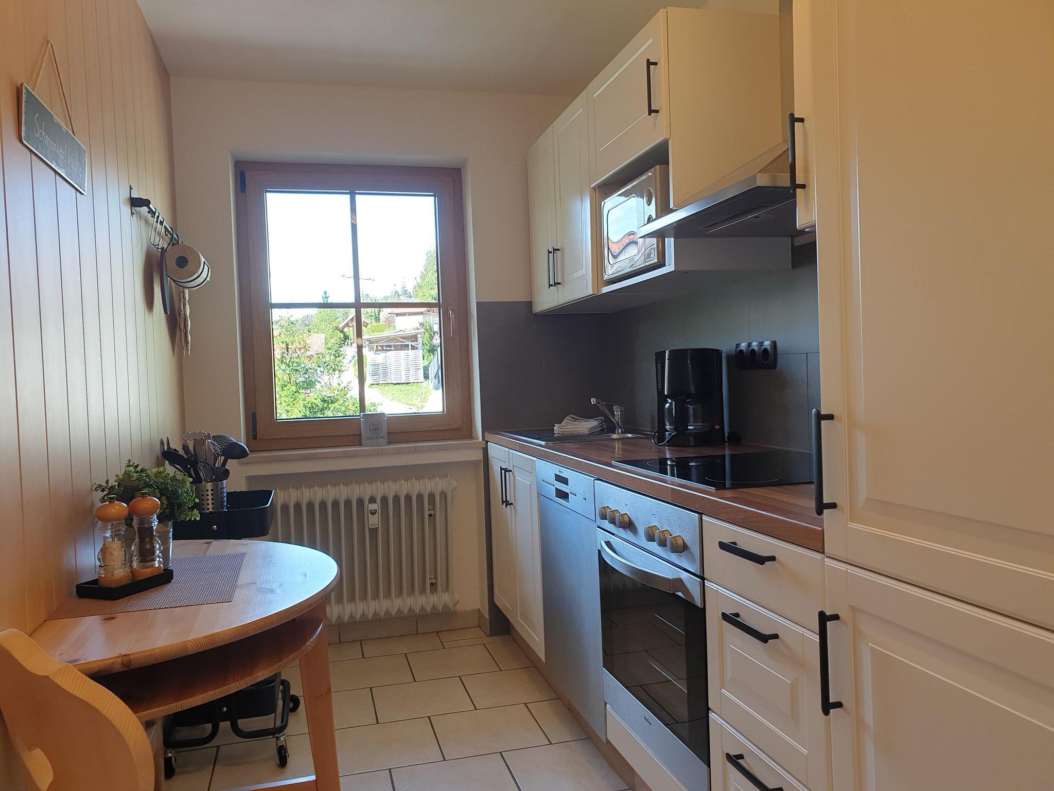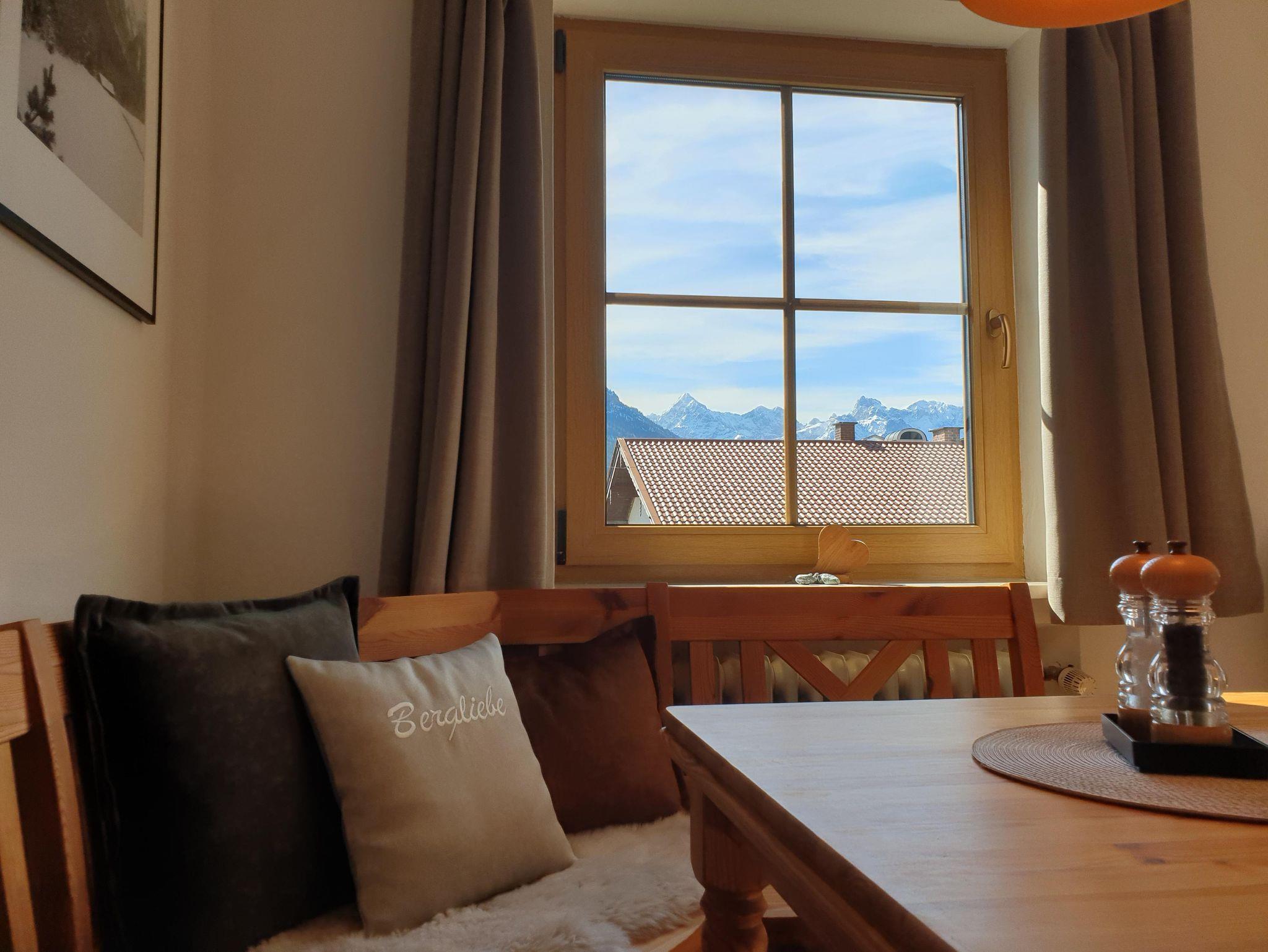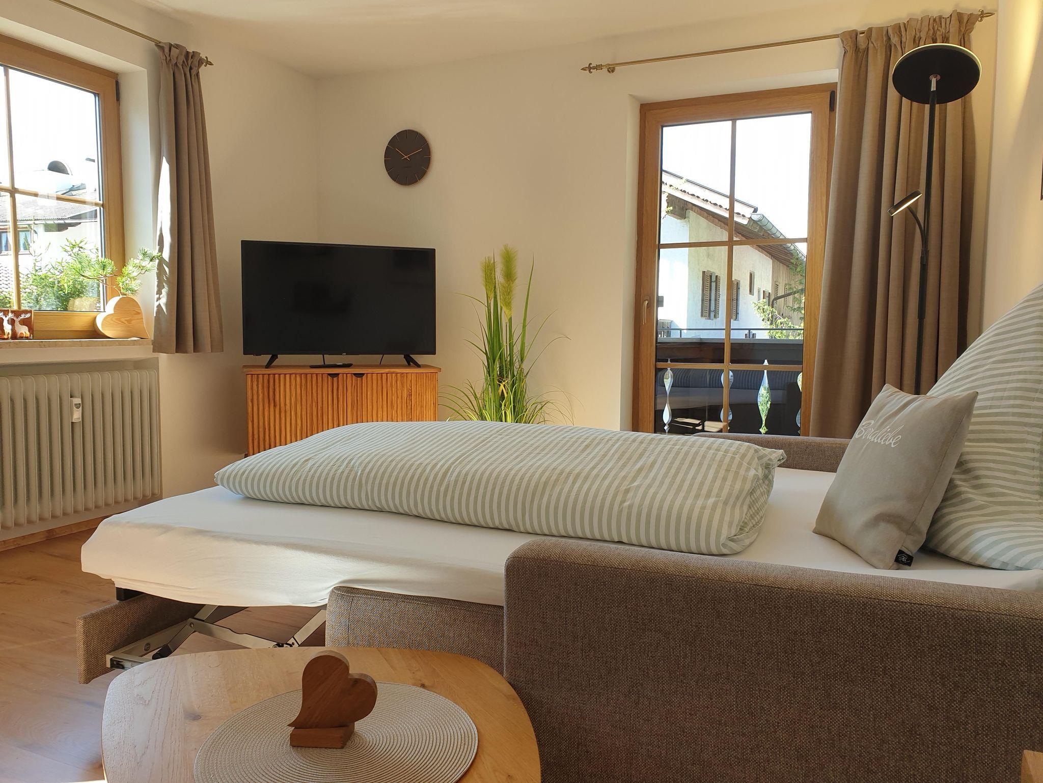 Die frisch renovierte Ferienwohnung Bergliebe im ersten Stock mit ruhigem, möblierten Süd-Westbalkon verfügt über einen großzügigen Wohnraum mit Essecke, bequemem Sofa/Schlafsofa und TV, sowie über ein gemütliches, separates Schlafzimmer mit Zirbenholz-Doppelbett, eine separate komplett ausgestattete Küche und ein modernes Badezimmer mit WC, Waschbecken und Dusche mit tiefem Einstieg. Gratis Waschmaschine und Trockner, sowie PKW-Stellplatze und Garage für Fahrräder und Sportequipment direkt am Haus.