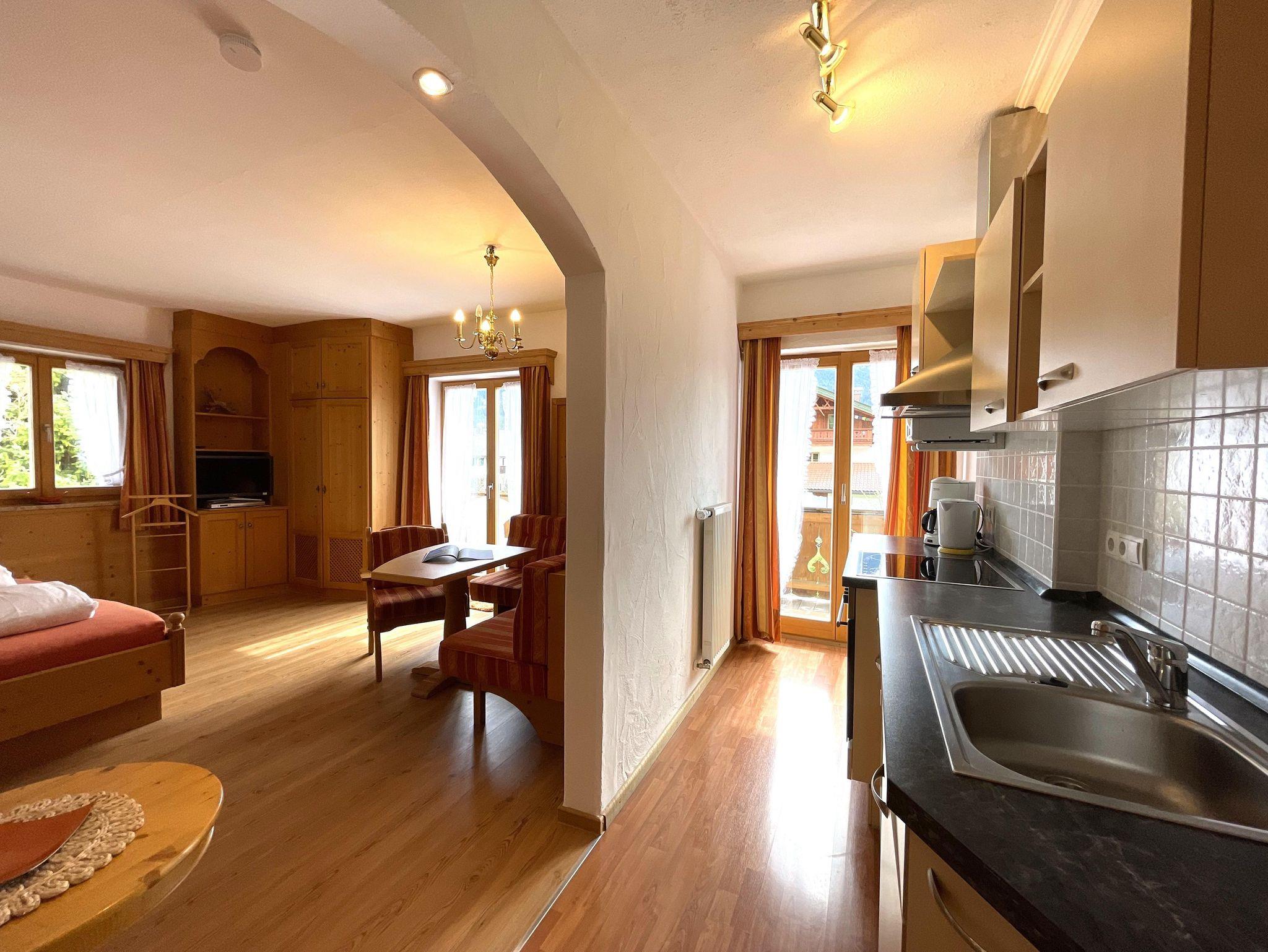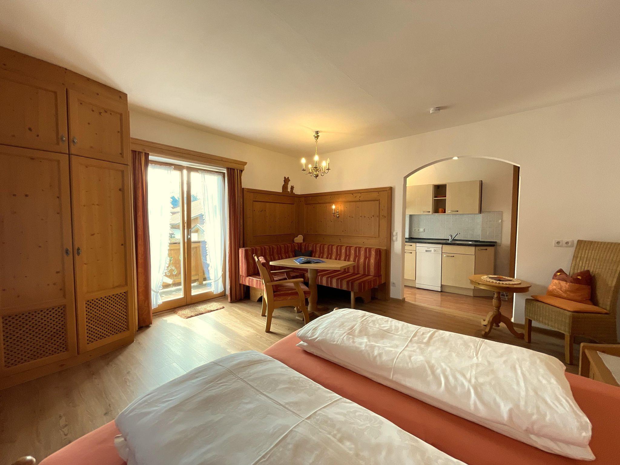 Schlaf/Wohnraum mit Doppelbett und Essecke. Räumlich abgetrennte komplett eingerichtete Küchenzeile.