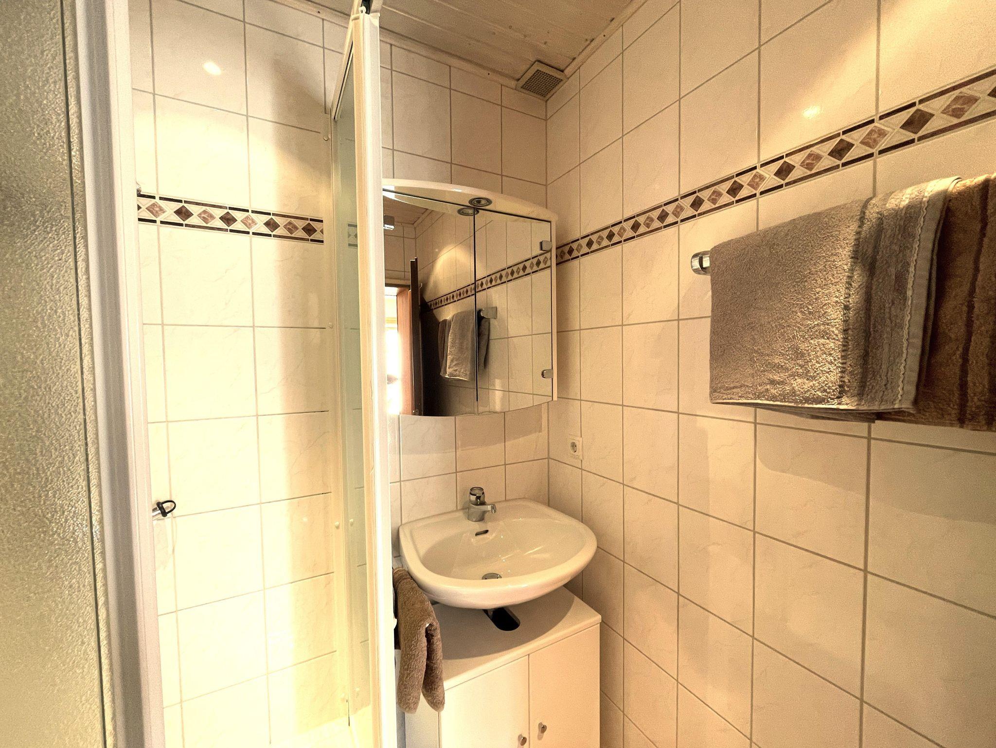Das Badezimmer ist mit Dusche und WC ausgestattet.