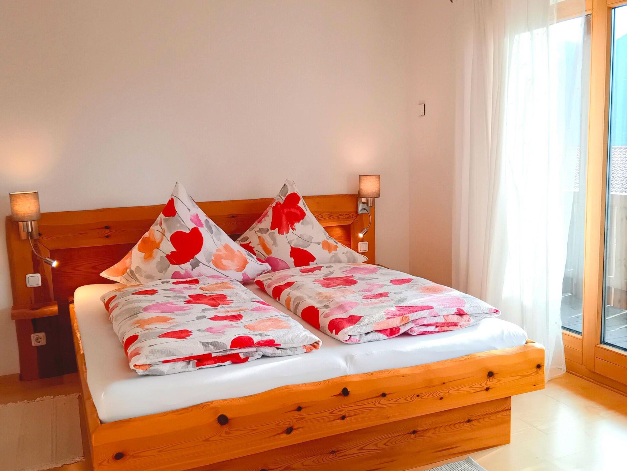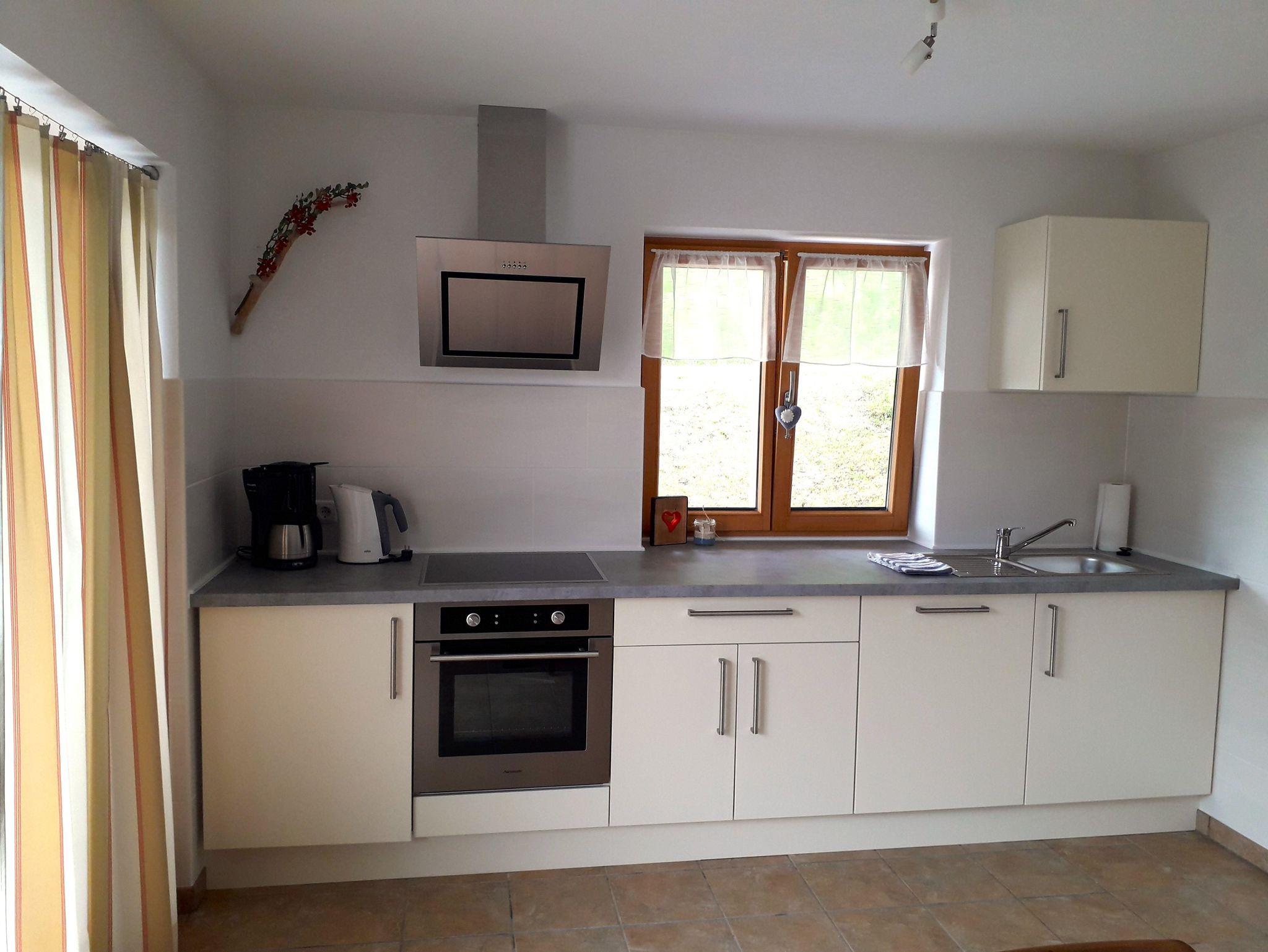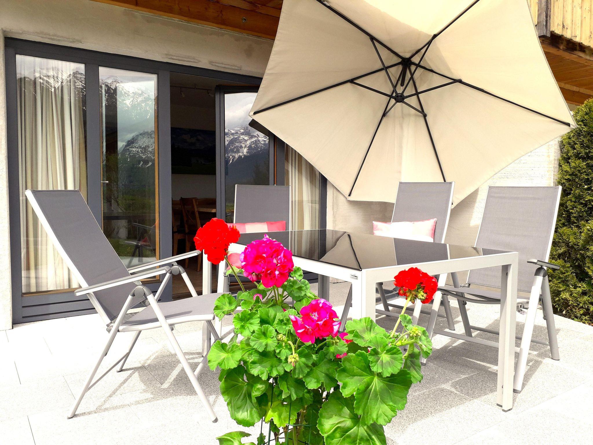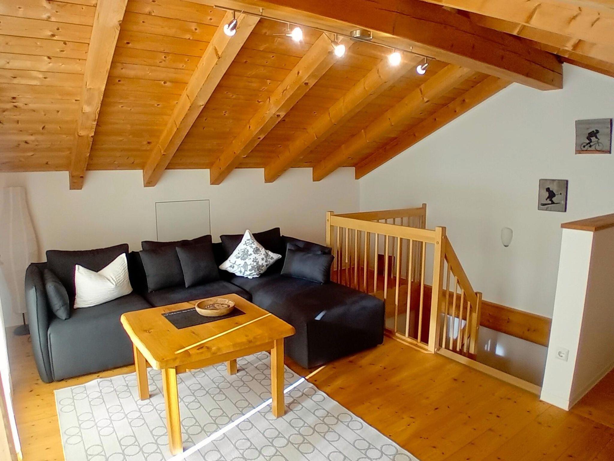 Unsere gemütliche Ferienwohnung mit 100qm bietet Platz für bis zu 4 Personen. Die Ferienwohnung erstreckt sich über 2 Stockwerke und verfügt über 2 separate Schlafzimmer, eine Küche/Esszimmer, ein Galerie-Wohnzimmer, ein Bad/WC sowie einen eigenen Waschkeller und eine eigene Terrasse sowie einen Balkon. Die Küche im Erdgeschoss ist voll ausgestattet mit einem Backofen, Ceran-Kochfeld, Geschirrspüler, Kühlschrank mit Gefrierfach, Toaster, Wasser-, Eierkocher und einer Kaffeemaschine. In der großen Essecke steht ein massiver Holztisch mit Bänken und Stühlen. Von dort haben Sie Zugang zur Terrasse, hier laden gemütliche Gartenmöbel zum Verweilen ein. Im 1. Stock befinden sich 2 separate Schlafzimmer mit jeweils einem Doppelbett und einem Schrank. Auch hier gibt es einen Balkon mit gemütlichen Gartenmöbeln. Das Bad verfügt über eine Dusche sowie ein WC und ein Waschbecken. Im 2. Stock ist ein gemütliches Galerie-Wohnzimmer mit 50-Flachbild-TV sowie einer gemütlichen, großen Couchlandschaft. Im Waschkeller befindet sich eine Waschmaschine sowie ein Trockenraum. Bettwäsche, Handtücher, Badetücher sowie Geschirrtücher sind vorhanden. Ein Kinderbett sowie ein Kinderhochstuhl können wir auf Anfrage gerne zur Verfügung stellen. Es gibt einen überdachten Auto-Stellplatz, sowie einen abschließbaren Garagenstellplatz auf Anfrage (gegen Gebühr). Zudem können Sie Ihre Fahrräder in einer Fahrradgarage abschließen. Gerne können Sie auch den Garten mit Liegewiese und Alpenpanorama-Blick nutzen.