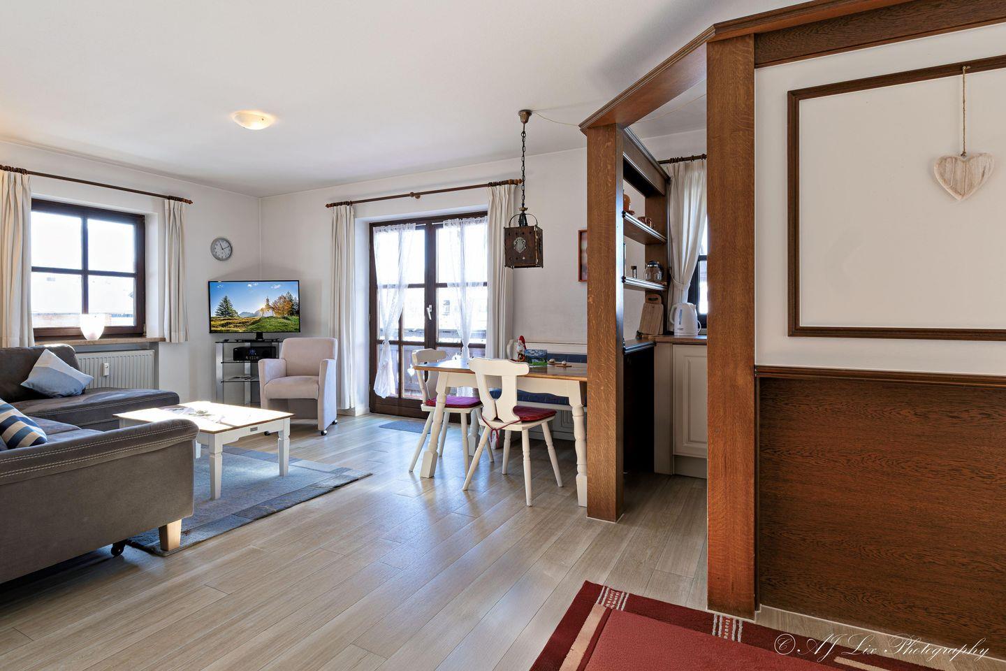 Die Ferienwohnung Kathi heißt Sie im ersten Obergeschoss willkommen. Genießen Sie den herrlichen Blick auf die umliegenden Berge, während Sie auf dem überdachten Balkon entspannen, der mit Gartenmöbeln ausgestattet ist. Hier können Sie die frische Alpenluft und die Ruhe der Natur in vollen Zügen genießen. Die gemütliche Atmosphäre wird durch die offene Gestaltung der Räume unterstützt, wobei das Wohn- und Esszimmer nahtlos miteinander verbunden sind. Im großzügigen Wohnzimmer erwartet Sie ein gemütliches Sofa, ein TV sowie ein CD- und DVD-Player, die zu entspannten Abenden einladen.