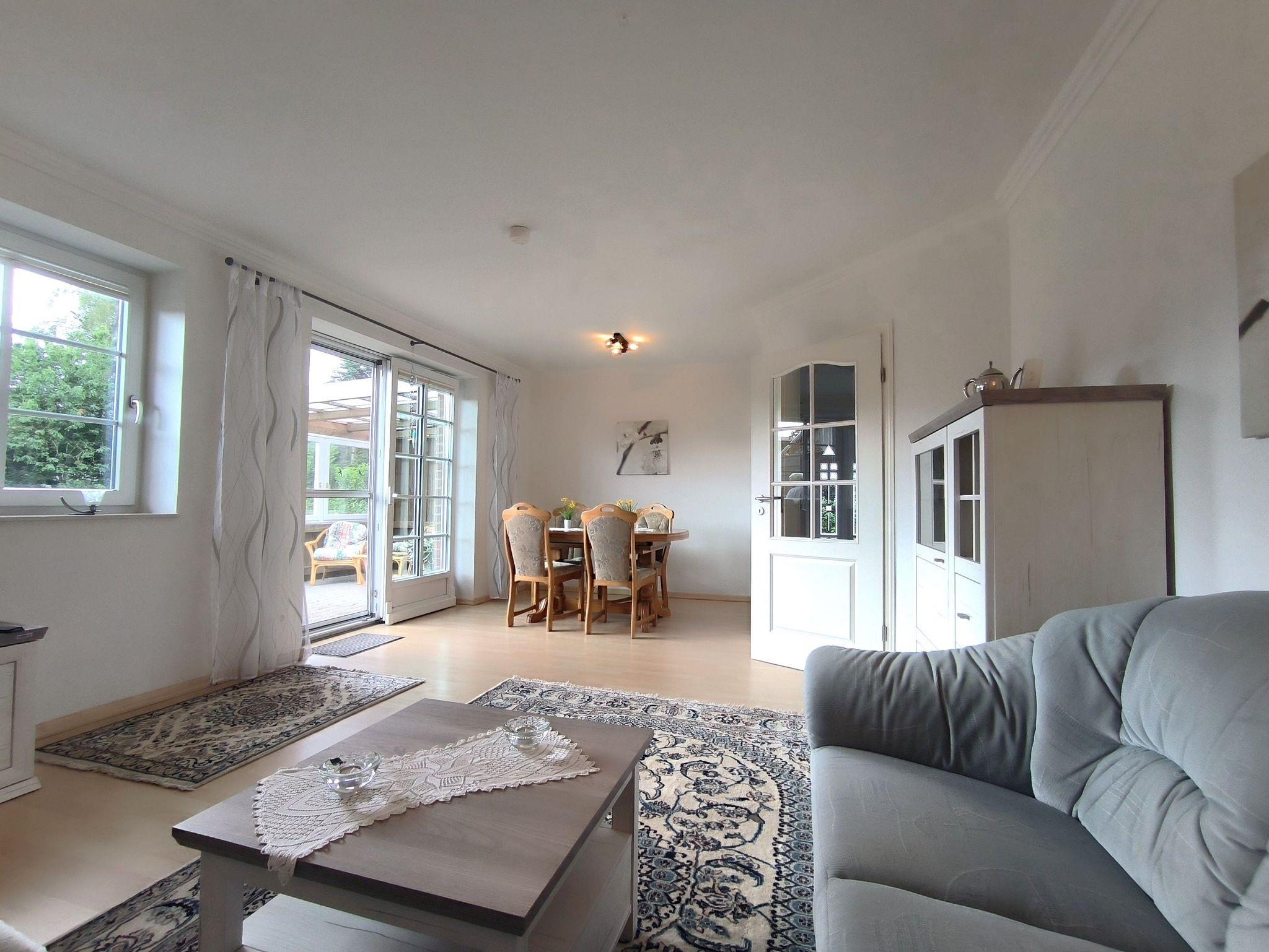 Die Ferienwohnung Süderstraße ist für ein bis zwei Personen geeignet: das große Wohnzimmer ist mit Esstisch und einer gemütlichen Sofaecke und TV ausgestattet. In der großen und modernen Küche ist alles vorhanden, was man zum Zubereiten leckerer Urlaubsmahlzeiten benötigt. Vom Flur aus geht zunächst das Schlafzimmer mit dem Doppelbett ab: bitte beachten Sie, dass das Bett bei einer Breite von 1,60m nur eine Länge von 1,90m und ein Fußende hat. Das Badezimmer ist mit einer ebenerdigen Dusche, WC, Waschbecken und Spiegelschrank ausgestattet und hat ein Fenster. Im kleinen Raum hinter der Küche steht eine Waschmaschine, die von den Gästen genutzt werden darf. Vom Wohnzimmer begehbar ist die große Terrasse mit überdachtem Sitzbereich sowie Gartentisch und -stühlen: ein Sonnenschirm und ein Grill sind auch vorhanden. Der große Garten kann gerne genutzt werden.