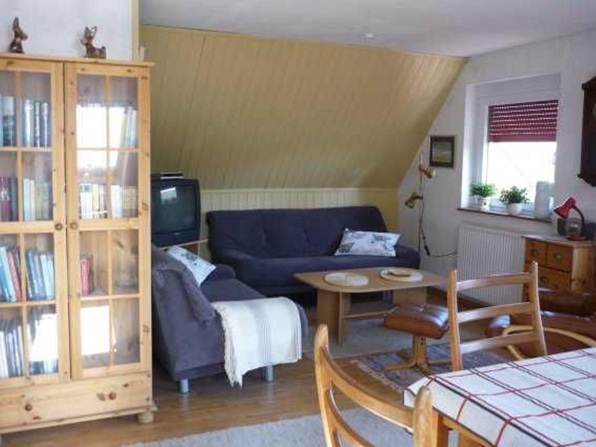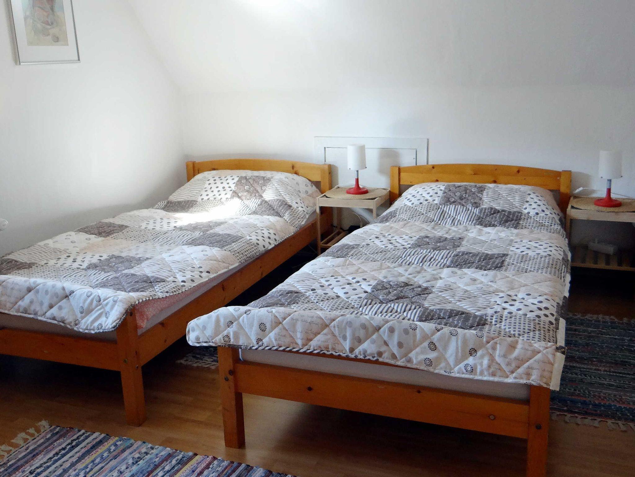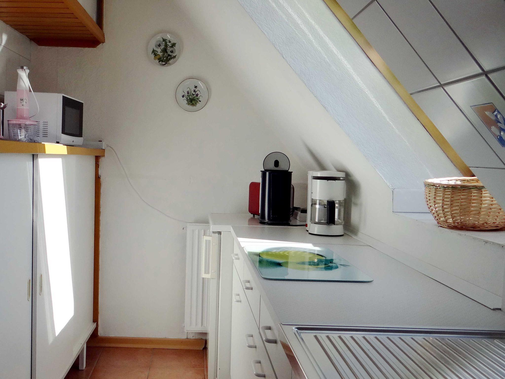Die gemütliche Ferienwohnung ist ca. 60 qm groß, liegt im Obergeschoss eines Einfamilienhauses und hat eine möblierte Dachterrasse. Die Wohnung besteht aus einem Wohnraum mit Sitz- und Essecke, einer offenen Küche, einem Schlafzimmer mit Doppelbett und einem Wannenbad mit Duschmöglichkeit. Das 2. Schlafzimmer mit zwei Einzelbetten ist über eine Raumspartreppe im Dachgeschoss erreichbar - für Kleinkinder nicht geeignet. Die Wohnung ist gemütlich und sauber und die Gastgeberin sehr freundlich. Im Mietpreis inklusive sind Bettwäsche, Handtücher und die Energiekosten, die Endreinigung wird mit einer Pauschale gesondert berechnet.