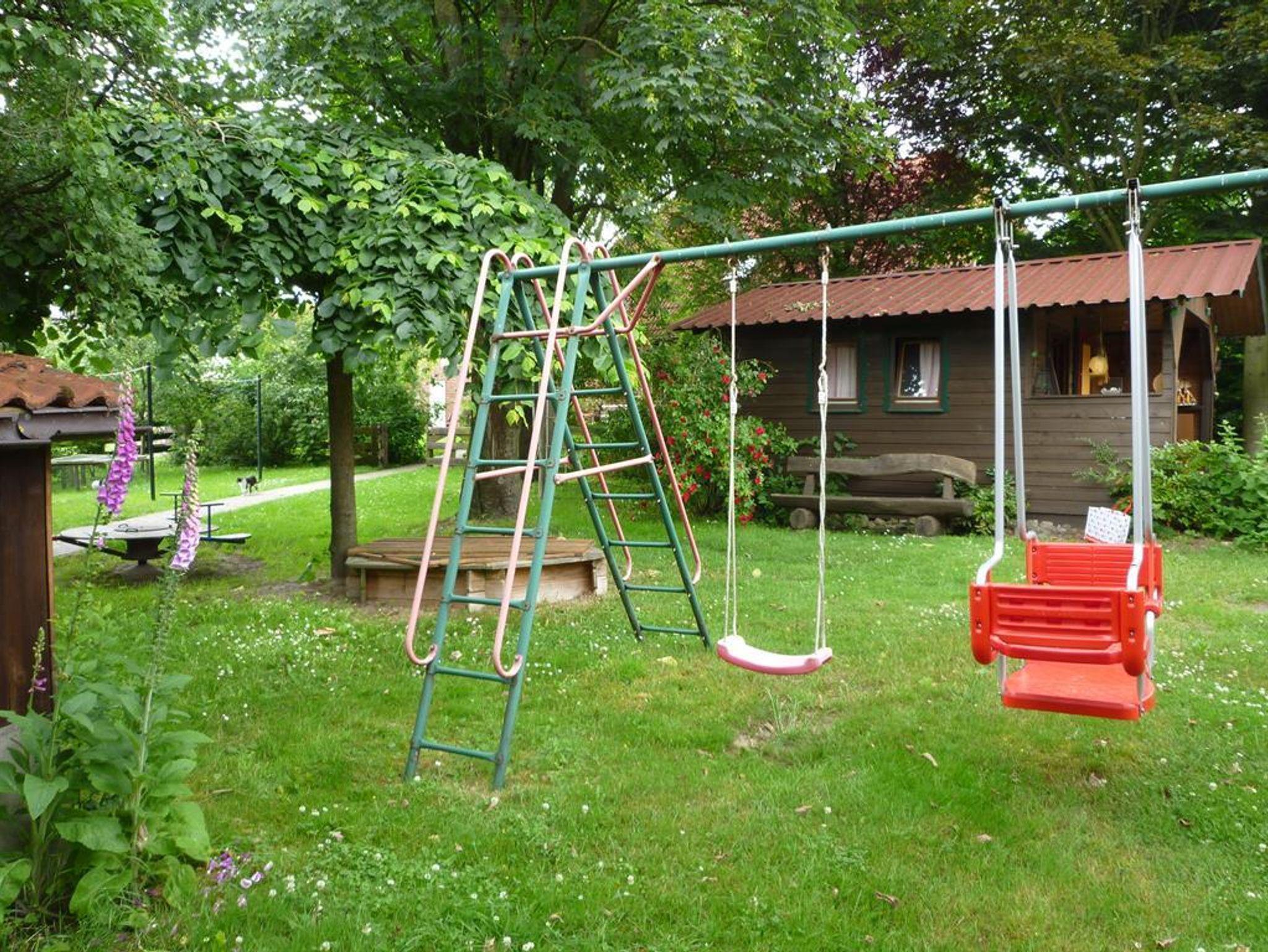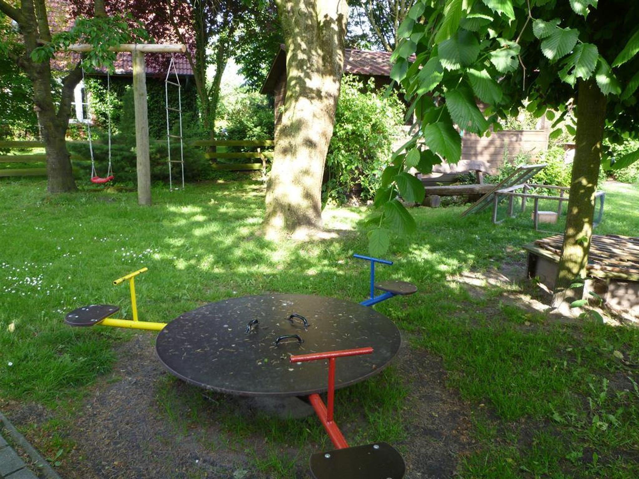 Garten mit Liegewiese und Spielgeräten, Gartenhaus, Streicheltiere, und kostenlose Leihfahrräder.