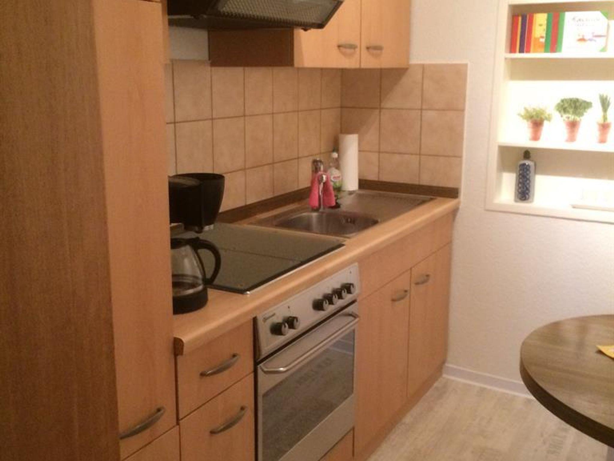 Das Wohn-/Schlafzimmer hat eine gemütliche Sitzecke, Sat-TV und W-Lan. Das Doppelbett ist bezogen. Komplette Küche mit Elektroherd mit Backofen,Kaffeemaschine, Toaster, Kühlschrank mit Gefrierfach, Tisch- und Küchenwäsche. Die Dusche/WC hat einen Föhn und Hand- und Duschtücher sind ausreichend vorhanden. Eine Waschmaschine steht zur Verfügung. Anreise ab 15 Uhr / Abreise bis 13 Uhr.