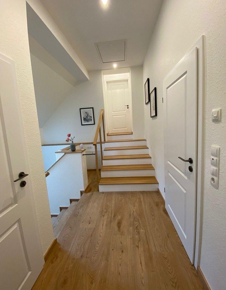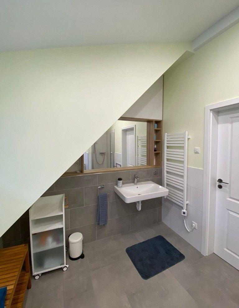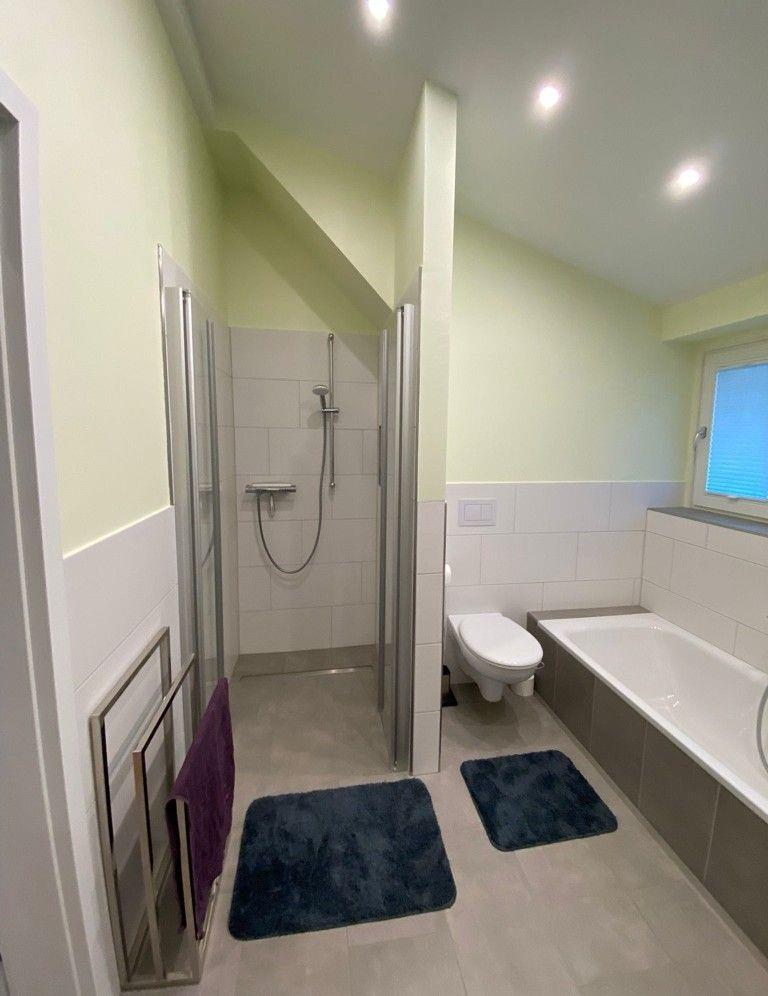 Ein besonderes Highlight dieser Unterkunft ist das großzügige Badezimmer im Obergeschoß, das sowohl mit einer Dusche als auch mit einer Badewanne ausgestattet ist. Der bodengleiche Duschbereich ermöglicht einen komfortablen Zugang, während ein Haartrockner und ein großes Waschbecken ebenfalls zur Verfügung stehen. Ein zusätzliches Gäste-WC unten sorgt dafür, dass auch bei mehreren Gästen ausreichend Privatsphäre gewährleistet ist.