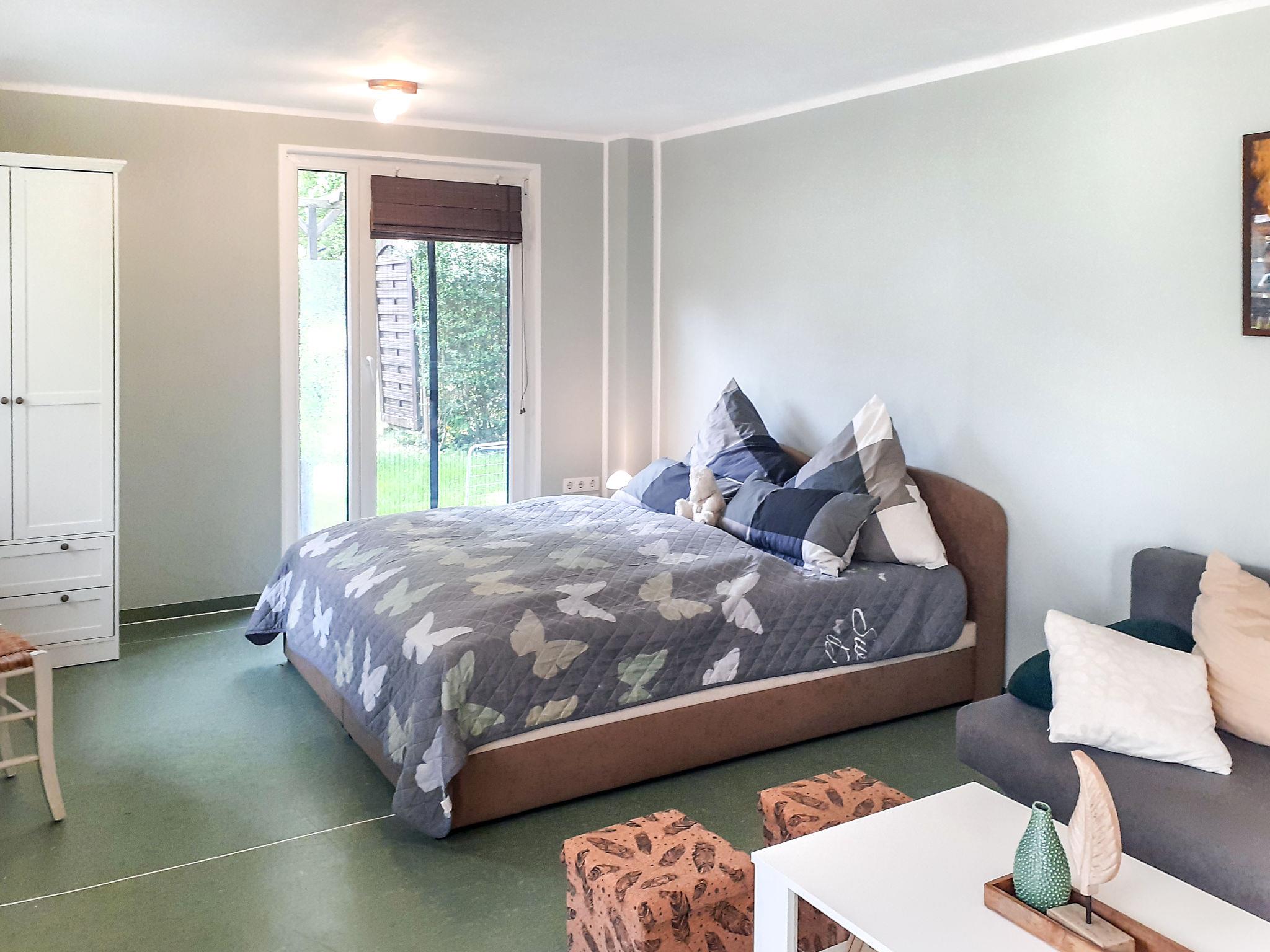 Cosy bungalow "Heike". 400 m from the centre of Wandlitz, 11 km from the centre of Bernau, 30 km from the centre of Berlin, in the residential district, 2 km from the lake, in a cul-de-sac. Private: property 200 m2 (fenced) with lawn, orchard, pond. Patio, terrace (9 m2), garden furniture, barbecue. 100 m long bumpy motor access to the house. Parking at the house at 10 m. Supermarket 800 m, bus stop "Wandlitz" 850 m, grass beach 2 km, outdoor swimming pool 2 km, indoor swimming pool 25 km. Please note: the owner lives on the same property.