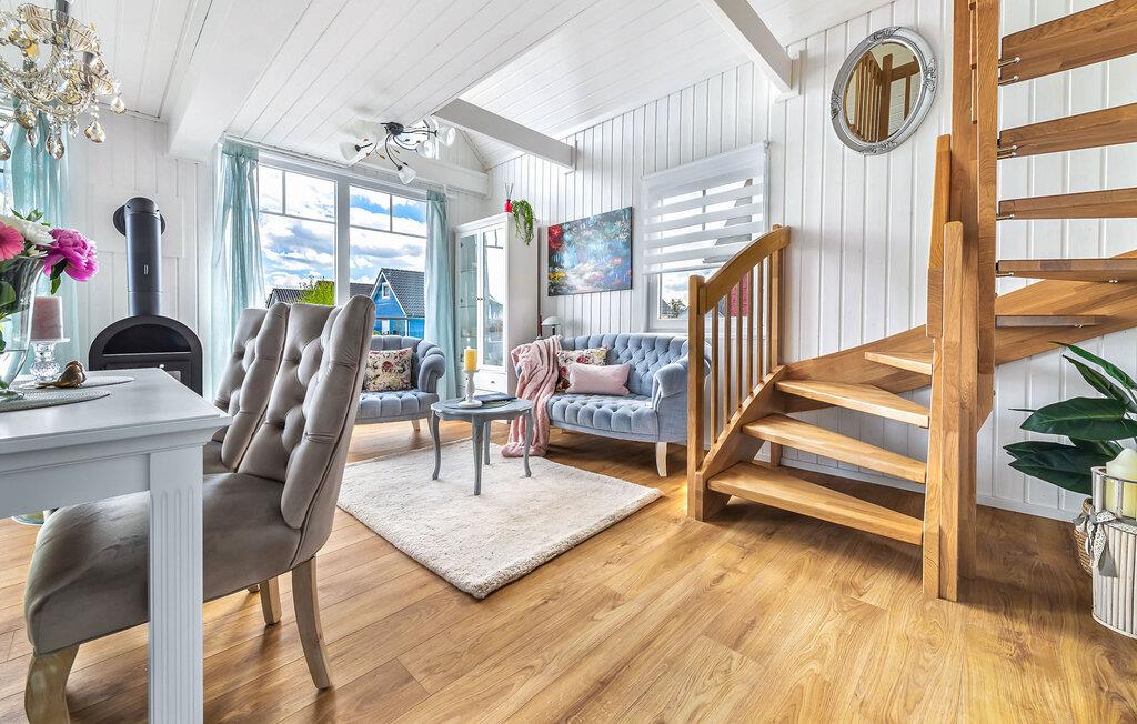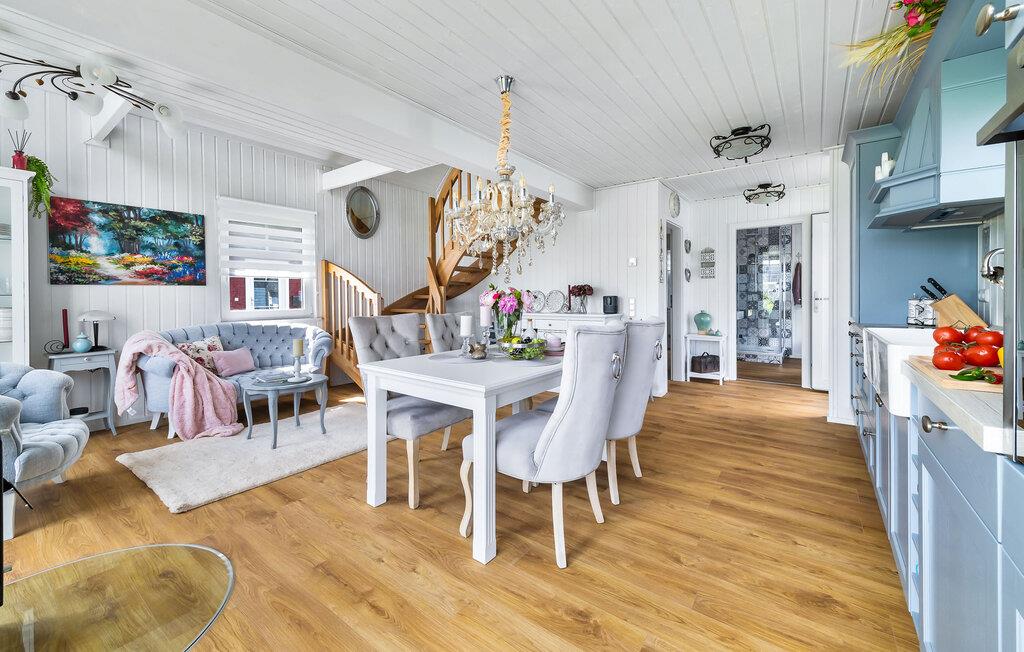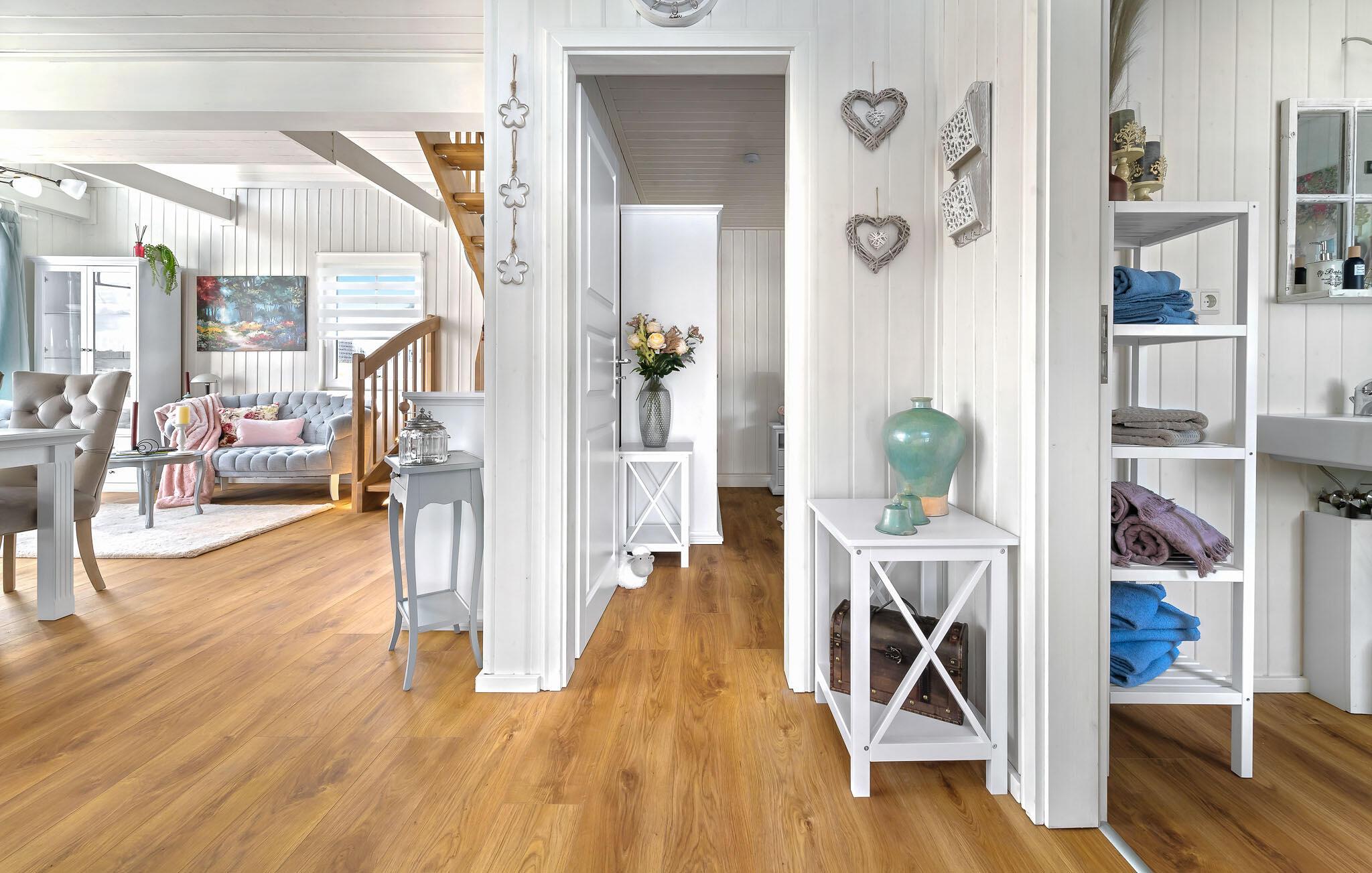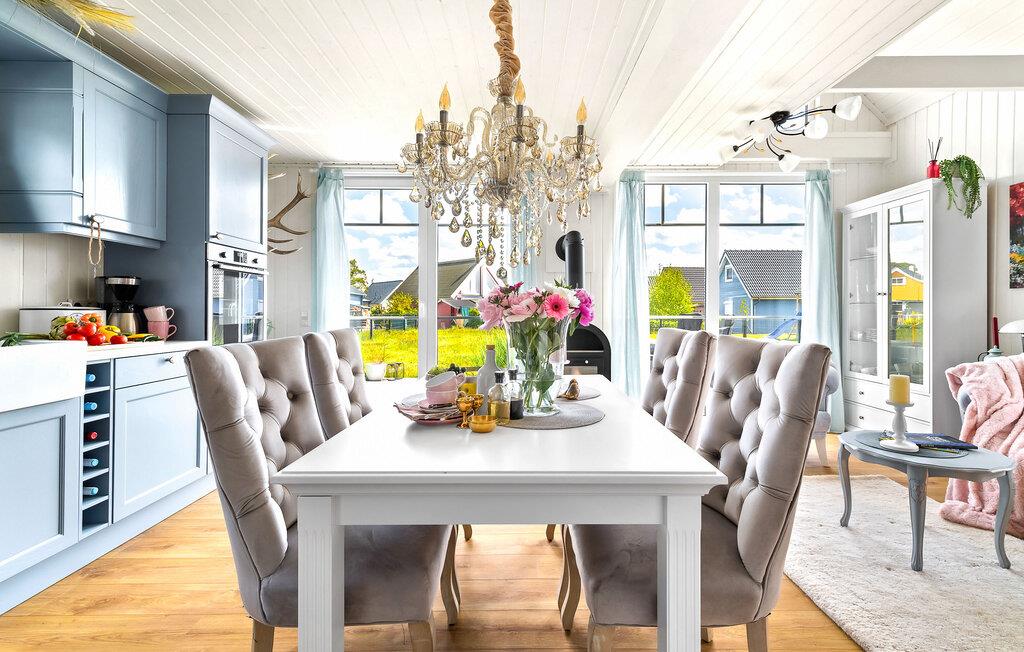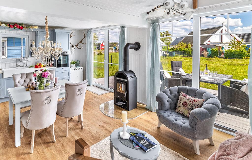 Feriehuset er moderne og hyggeligt - her vil I straks føle jer hjemme! Om aftenen lokker pejsen i det åbne opholds- og spiseområde med sin knitrende ild og hyggelige varme. Om sommeren kan I nyde solen på jeres private terrasse i komfortable havemøbler og slappe af.