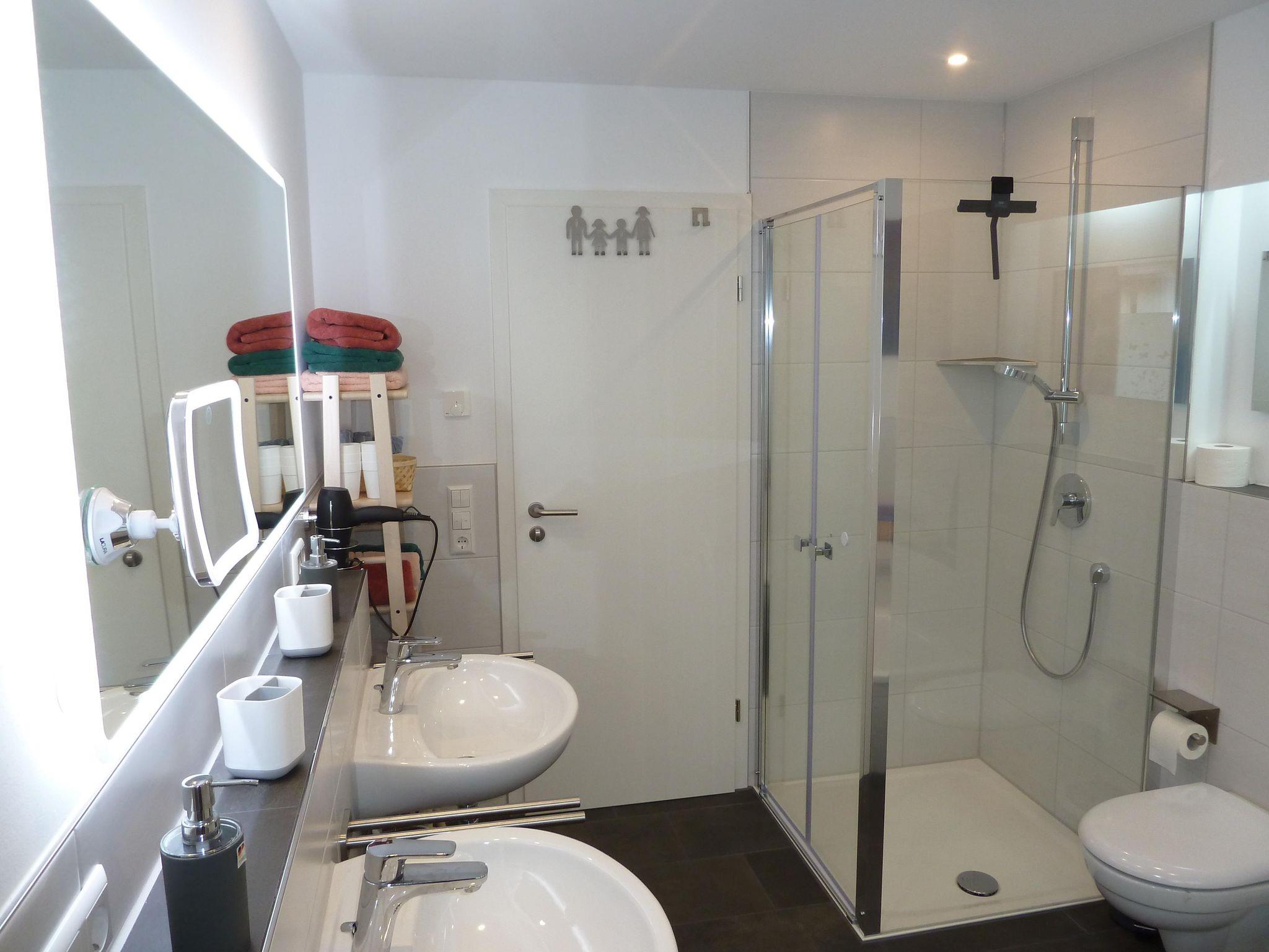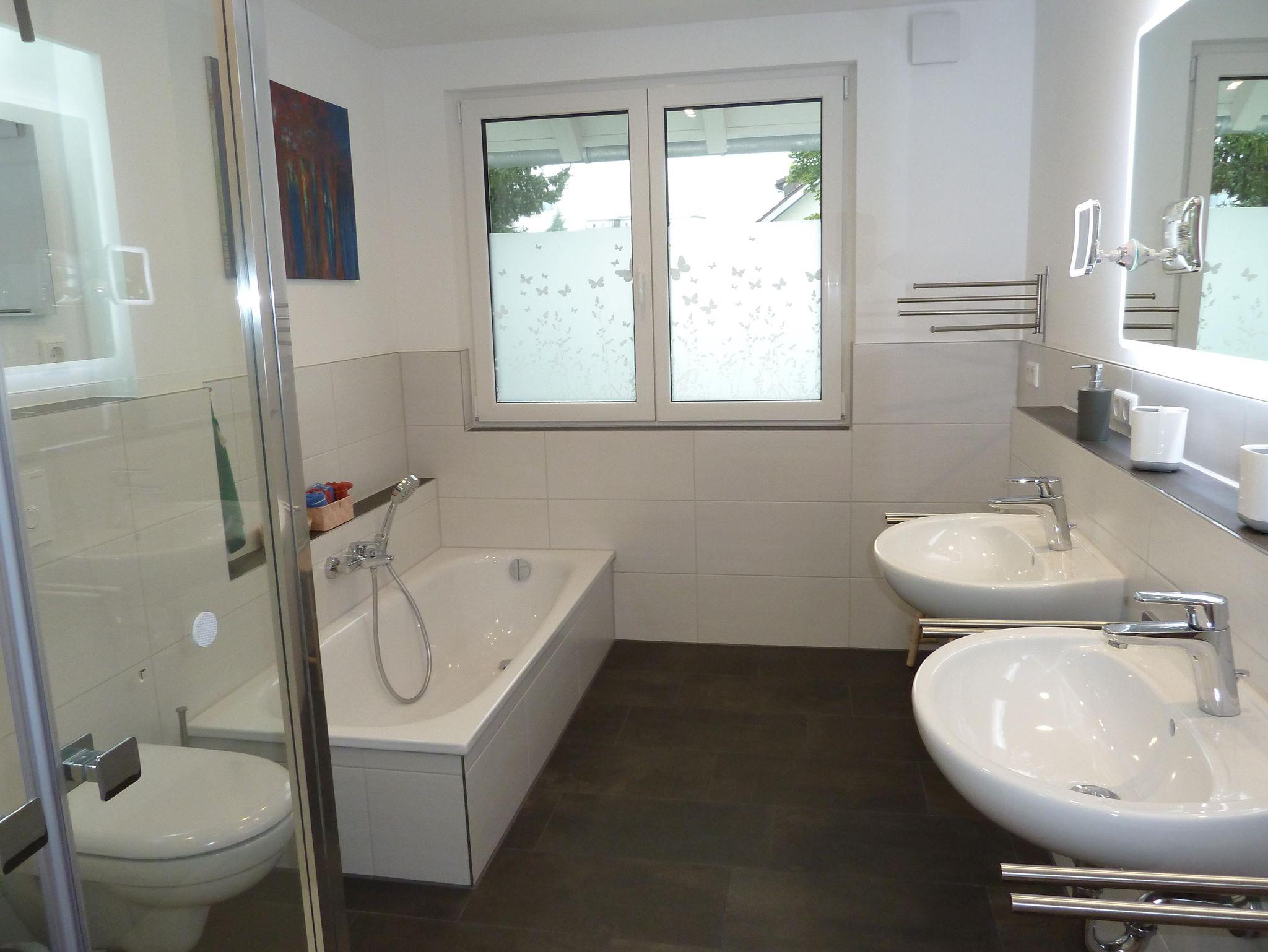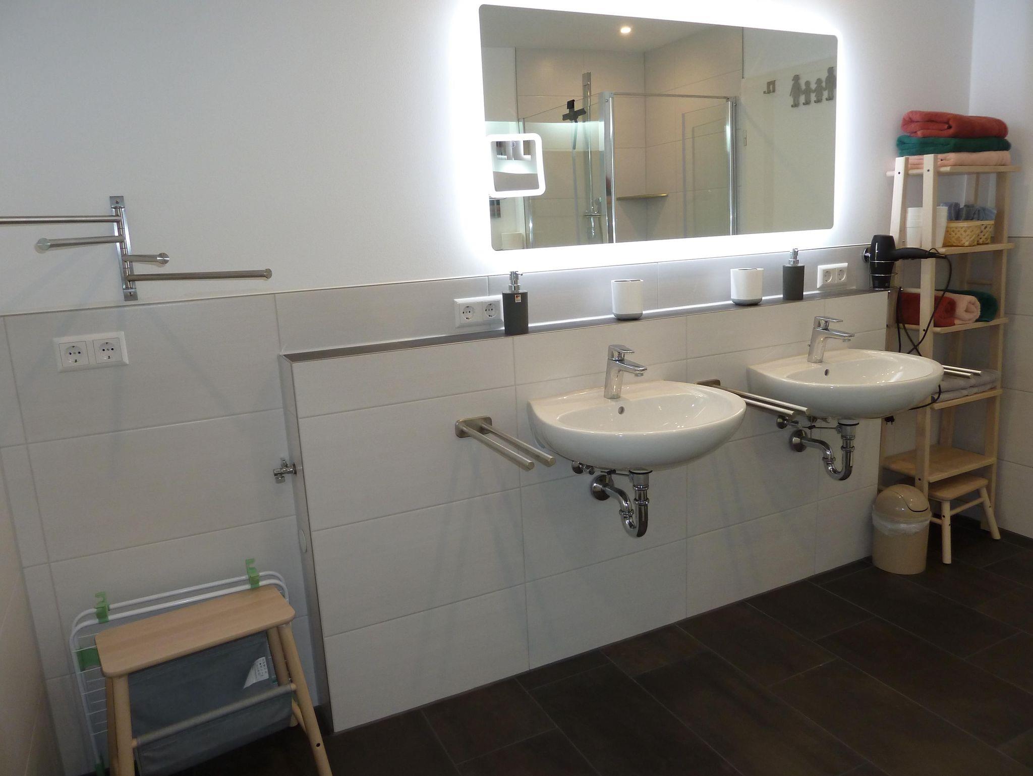 Das Badezimmer ist ausgestattet mit zwei Waschbecken, einem WC, Dusche, Badewanne sowie Fön, Kosmetikspiegel, Wäscheständer, Handseife.