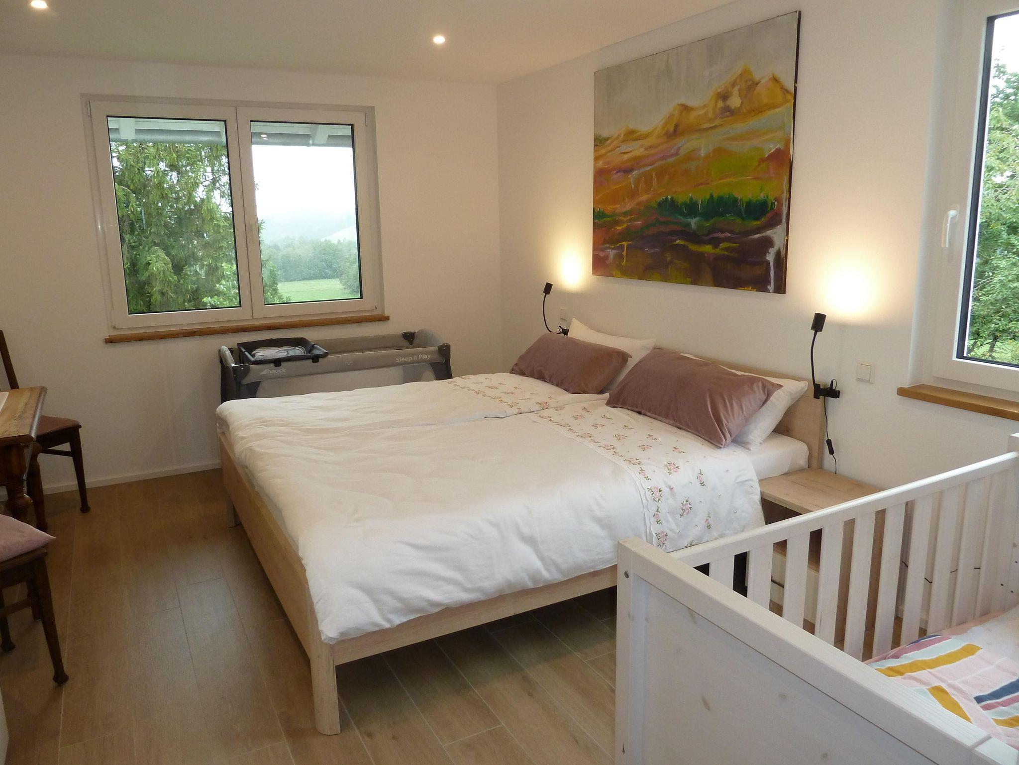 Unsere neue und ökologisch erstellte, sonnendurchflutete und liebevoll eingerichtete Ferienwohnung im 1.OG, lädt zu einem schönen und erholsamen Aufenthalt ein. Der große Balkon bietet eine herrliche Sicht ins Argental und auf malerische Sonnenuntergänge. Die idyllische Ortsrandlage in einer ruhigen Sackgasse macht unsere FeWo zur idealen Unterkunft für Paare, Familien und Gruppen.