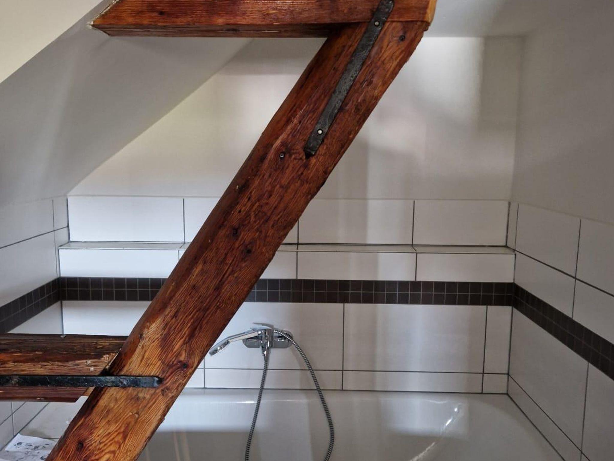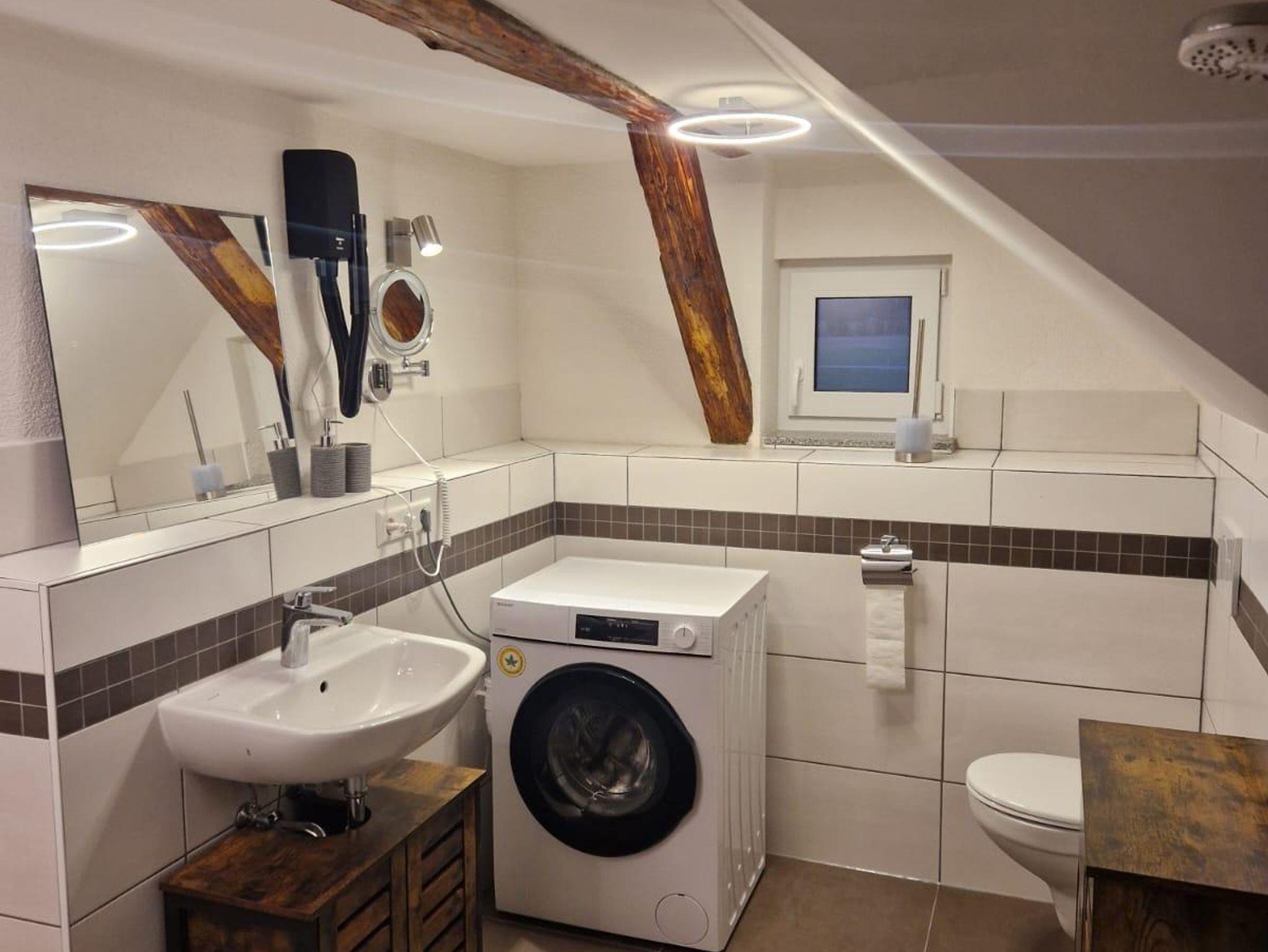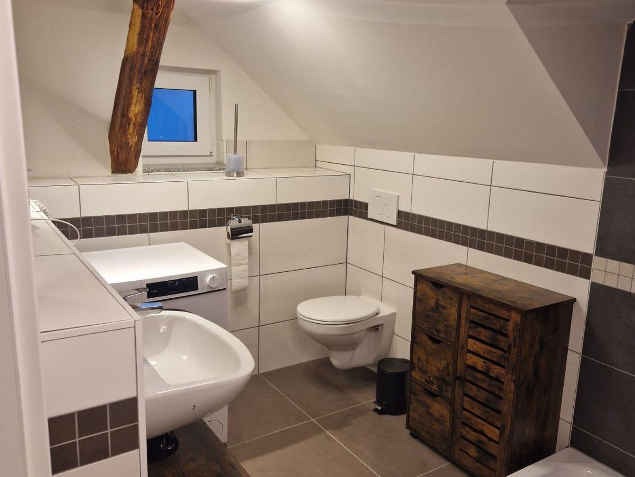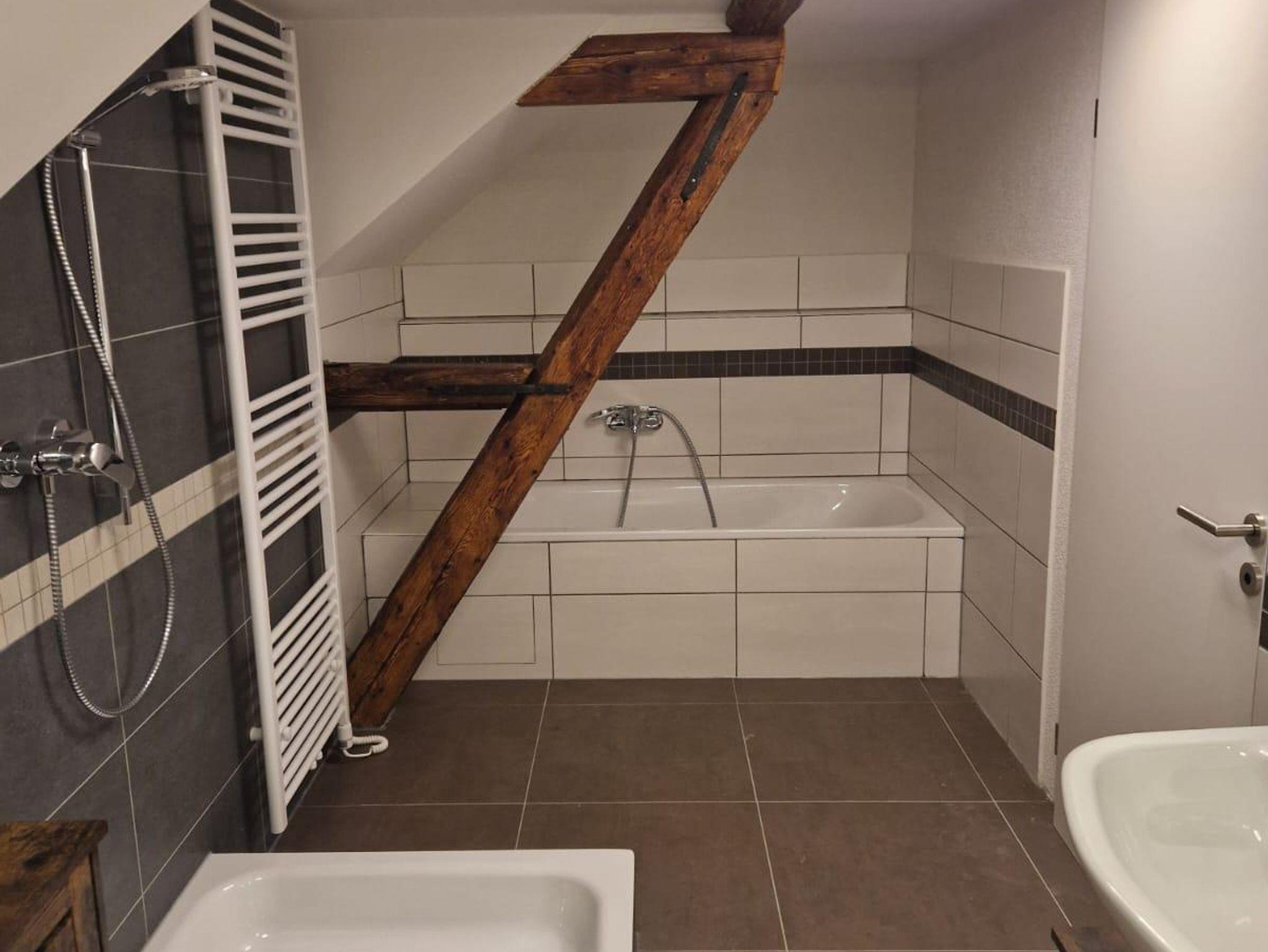 Das Badezimmer verfügt über eine Dusche, eine Badewanne und eine Waschmaschine welche kostenlos mitbenutzt werden kann, außerdem stehen Handtücher, Haarfön zur Nutzung bereit.
