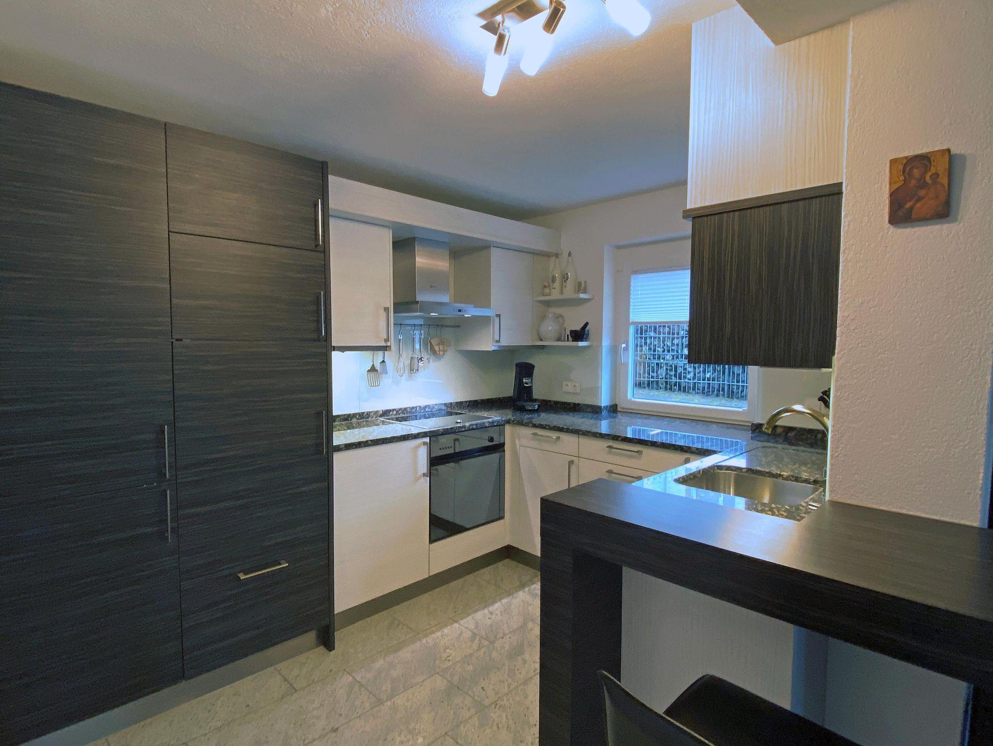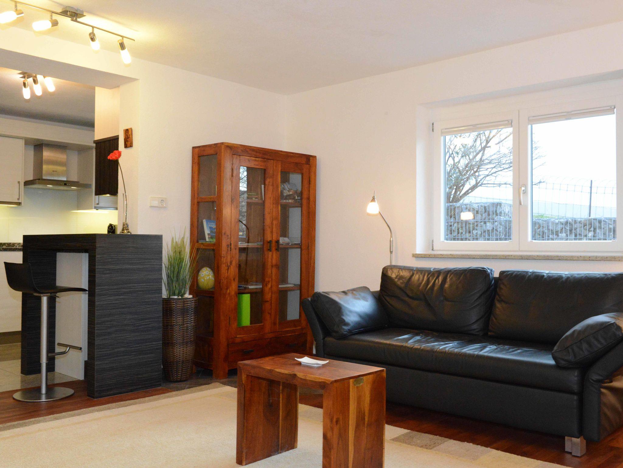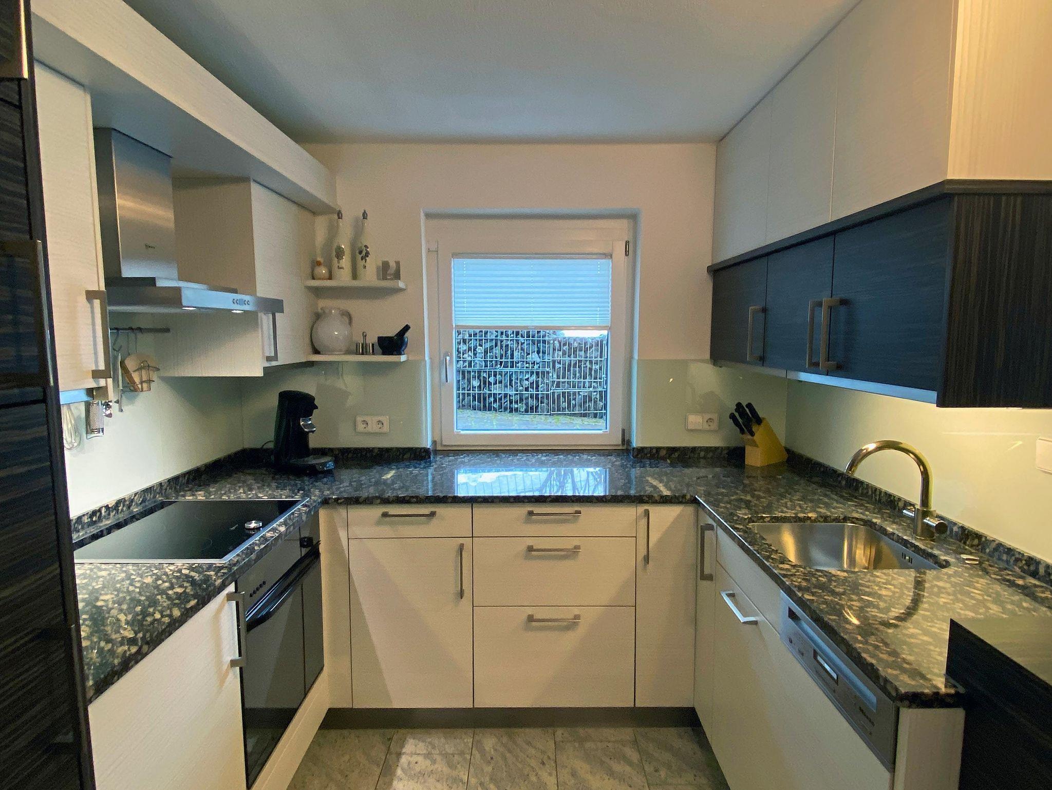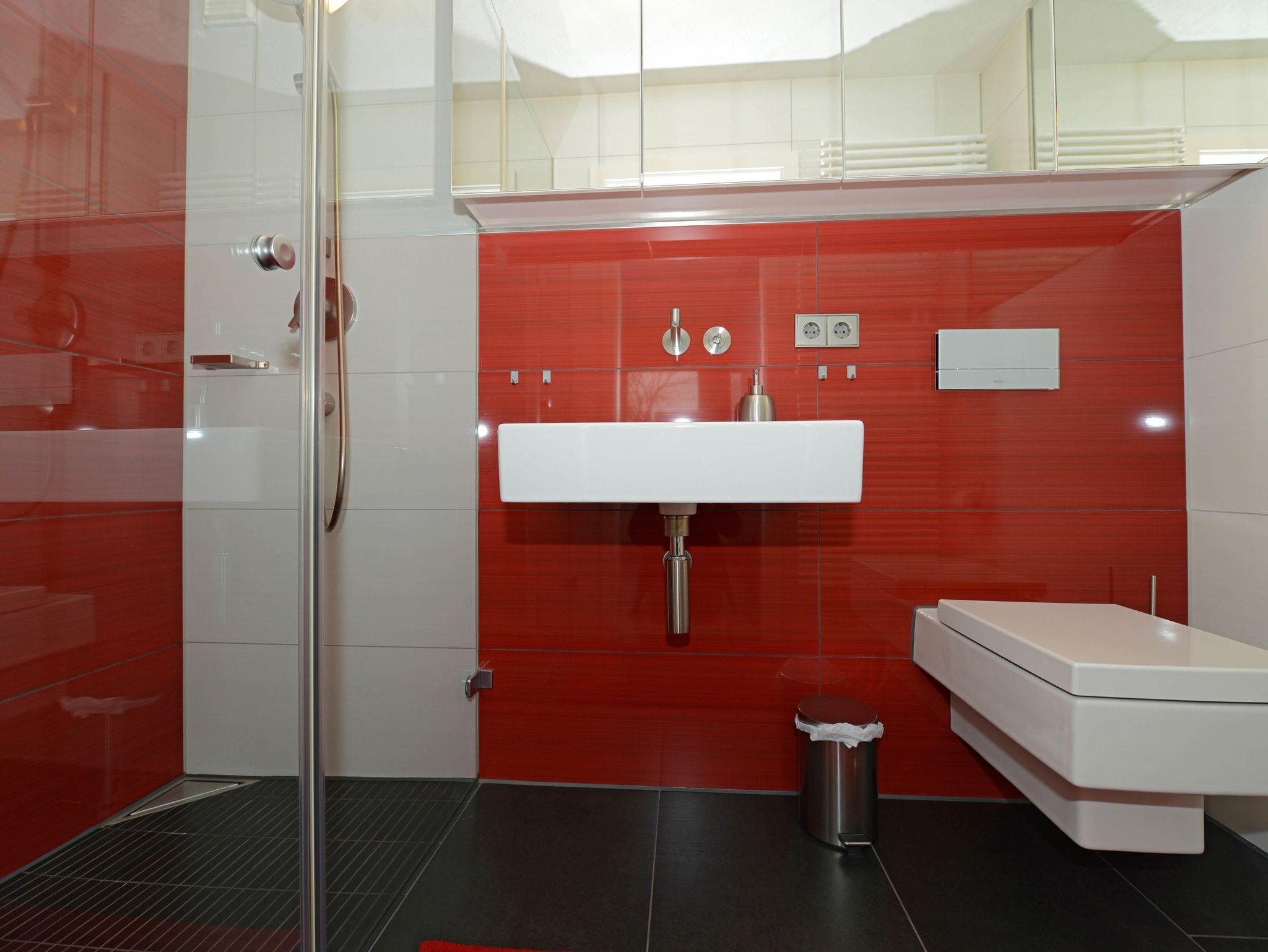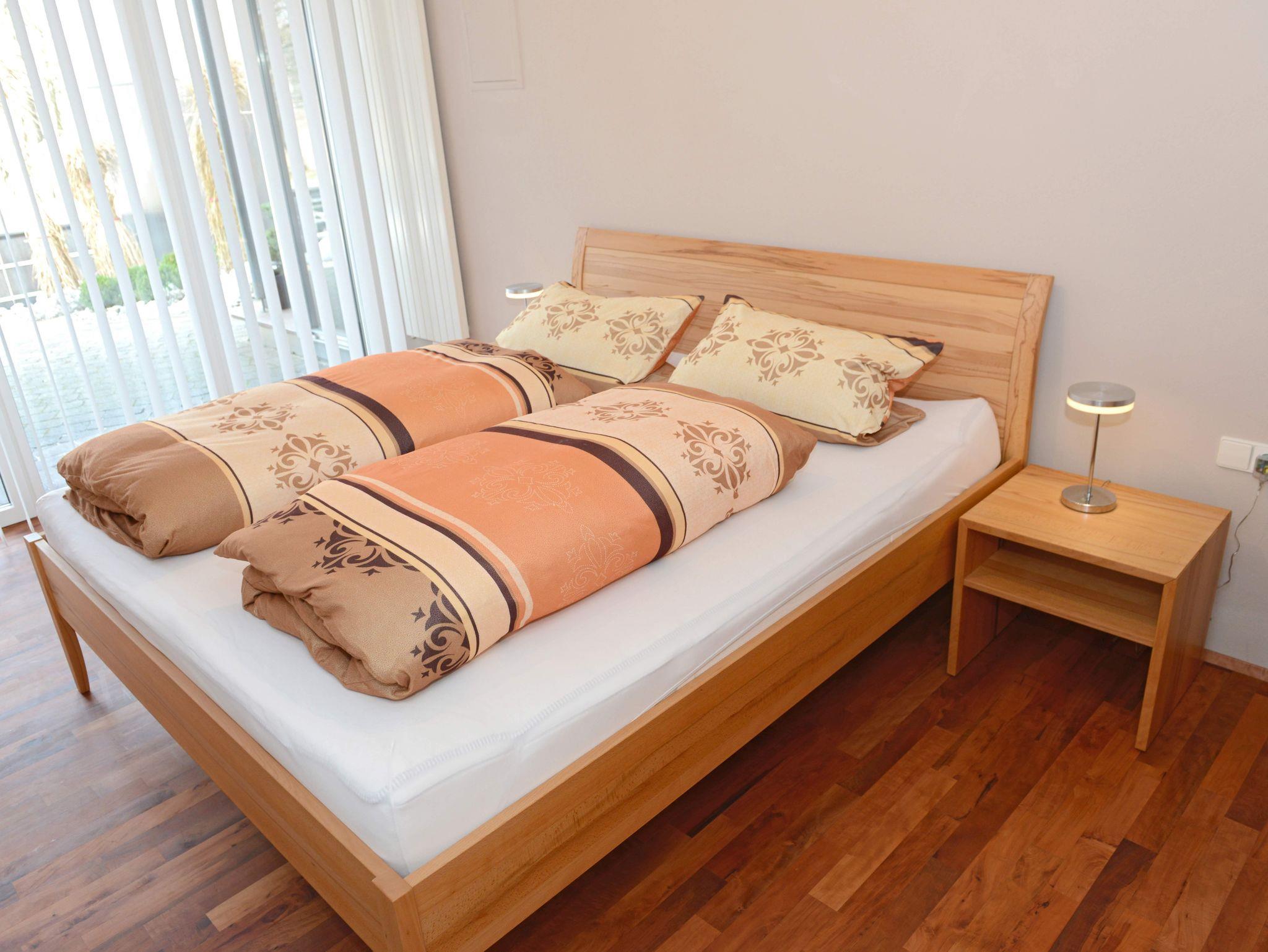 Hochwertig, modern und lichtdurchflutet präsentiert sich unsere komplett eingerichtete Ferienwohnung mit 60 qm. Schlafzimmer mit Komfort-Doppelbett und ausziehbarer Couch im Wohn- und Essbereich. Fußbodenheizung in Küche und Badezimmer, in den anderen Räumen hochwertiger Parkettboden. Großer Flachbild-TV, kostenfreies W-LAN.