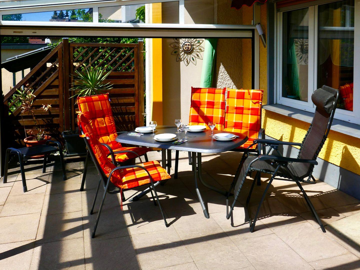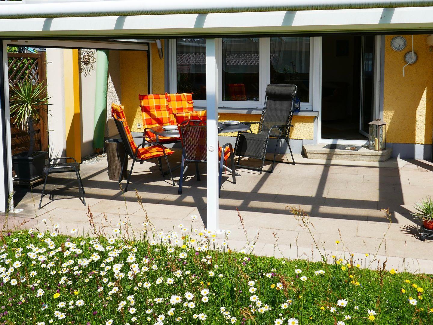 Ihre Erdgeschoss Ferienwohnung verfügt über eine große überdachte Sonnenterrasse, die zum ausgiebigen Frühstück oder Abendessen in ruhiger Atmosphäre einlädt.