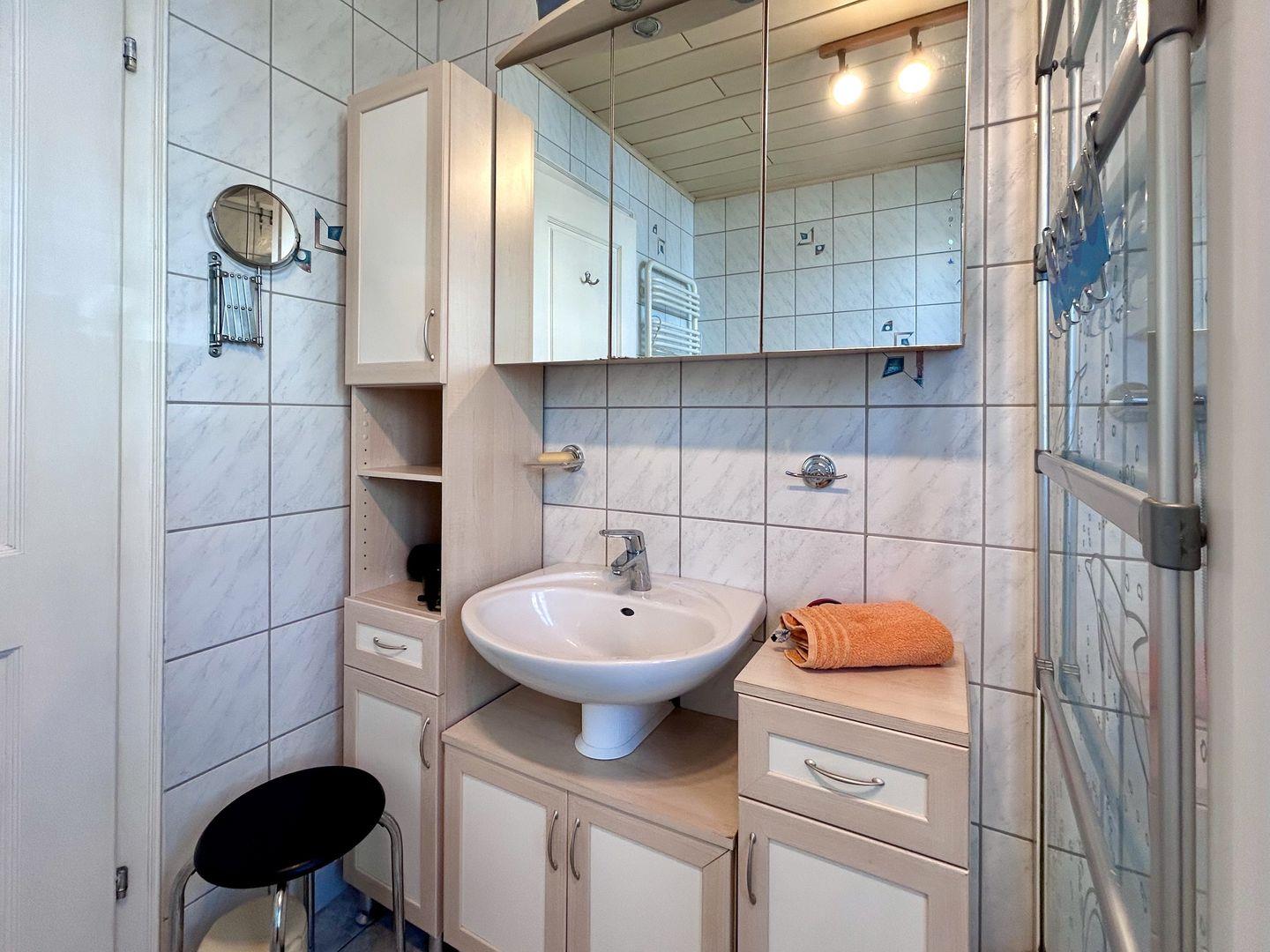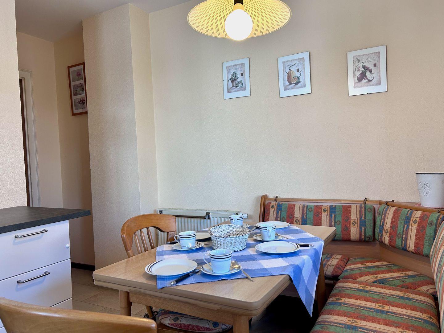Die Küche mit Esstisch und Eckbank ist vollausgestattet u.a. mit Geschirrspülmaschine, Kühlschrank, Kaffeemaschine, Toaster etc. Neben dem Schlafzimmer mit Kleiderschrank befindet sich ein geräumiges Wohnzimmer mit Panoramafester und Sitzcouch, Sessel und TV. Das Tageslicht-Bad ist mit Dusche und Badewanne ausgestattet, das WC ist separat. Ein kleines aber helles Schlafzimmer mit Etagenbett (90 x 200 cm) bietet weiteren zwei Personen ausreichend Platz für den Aufenthalt.