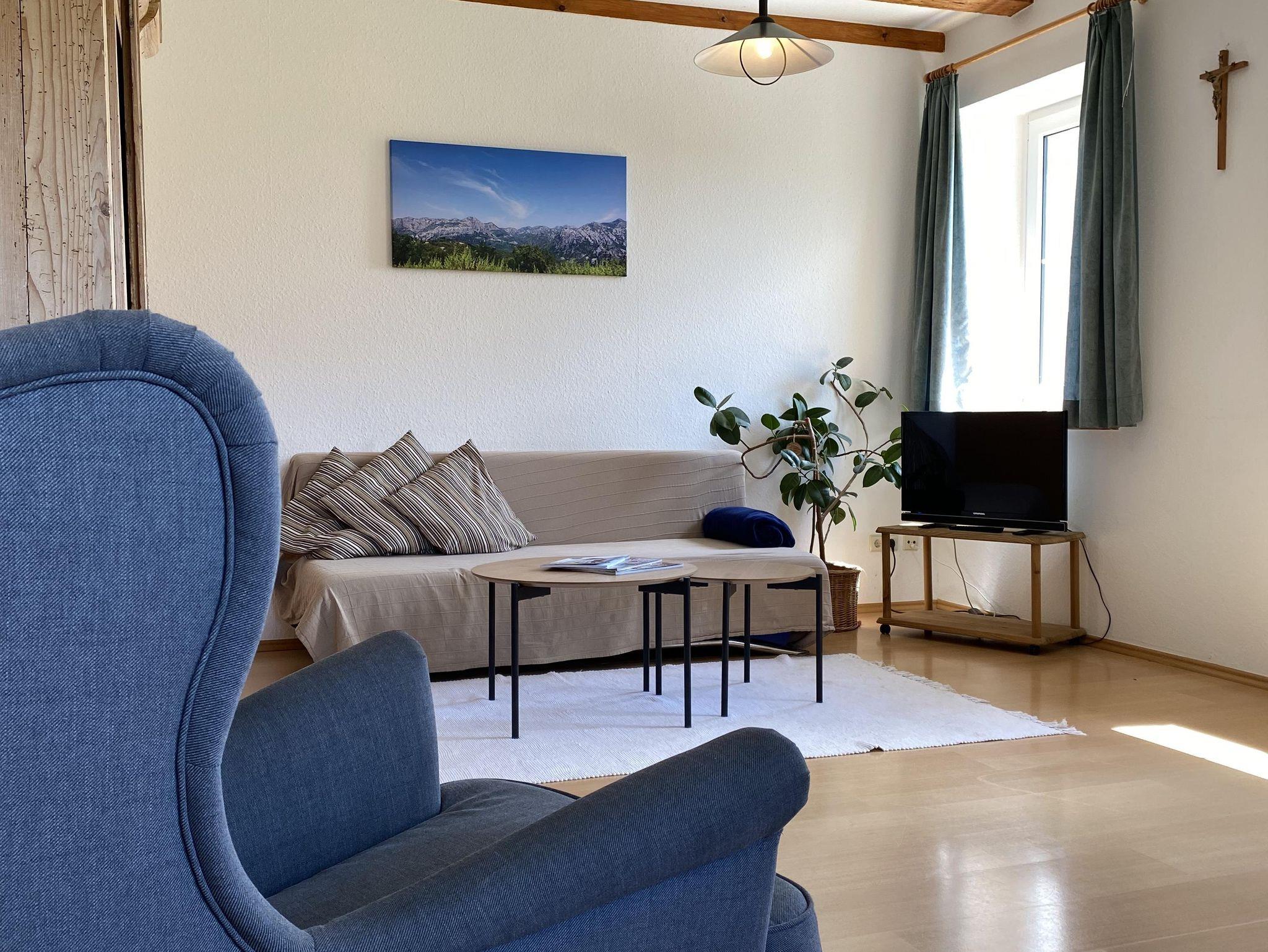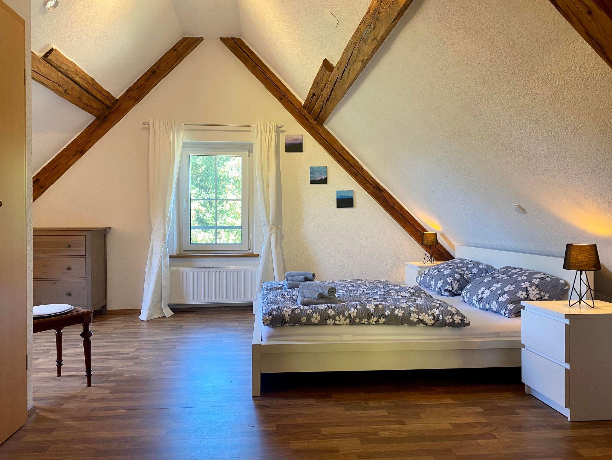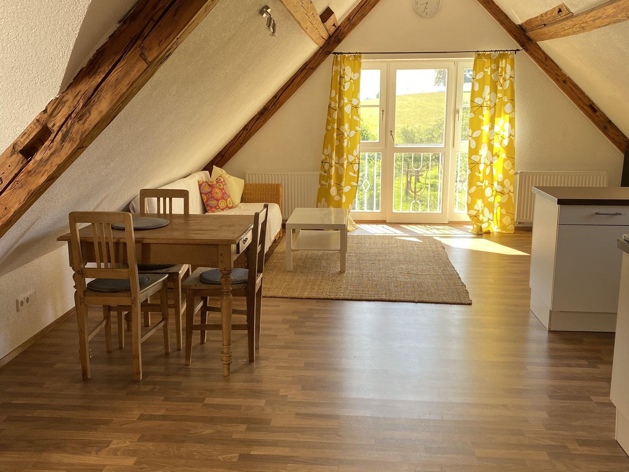 Im 3. OG befindet sich unsere Ferienwohnung Weitblick mit 60m². Wer die Ruhe sucht, ist hier richtig. In unserer schönen modernen Dachgeschosswohnung mit den sichtbaren Balken, haben Sie einen sehr schönen weiten Blick über das Dorf bis in die Berge. Nach hinten sind der angrenzende Wald und die Wiesen mit Pferdekoppeln.