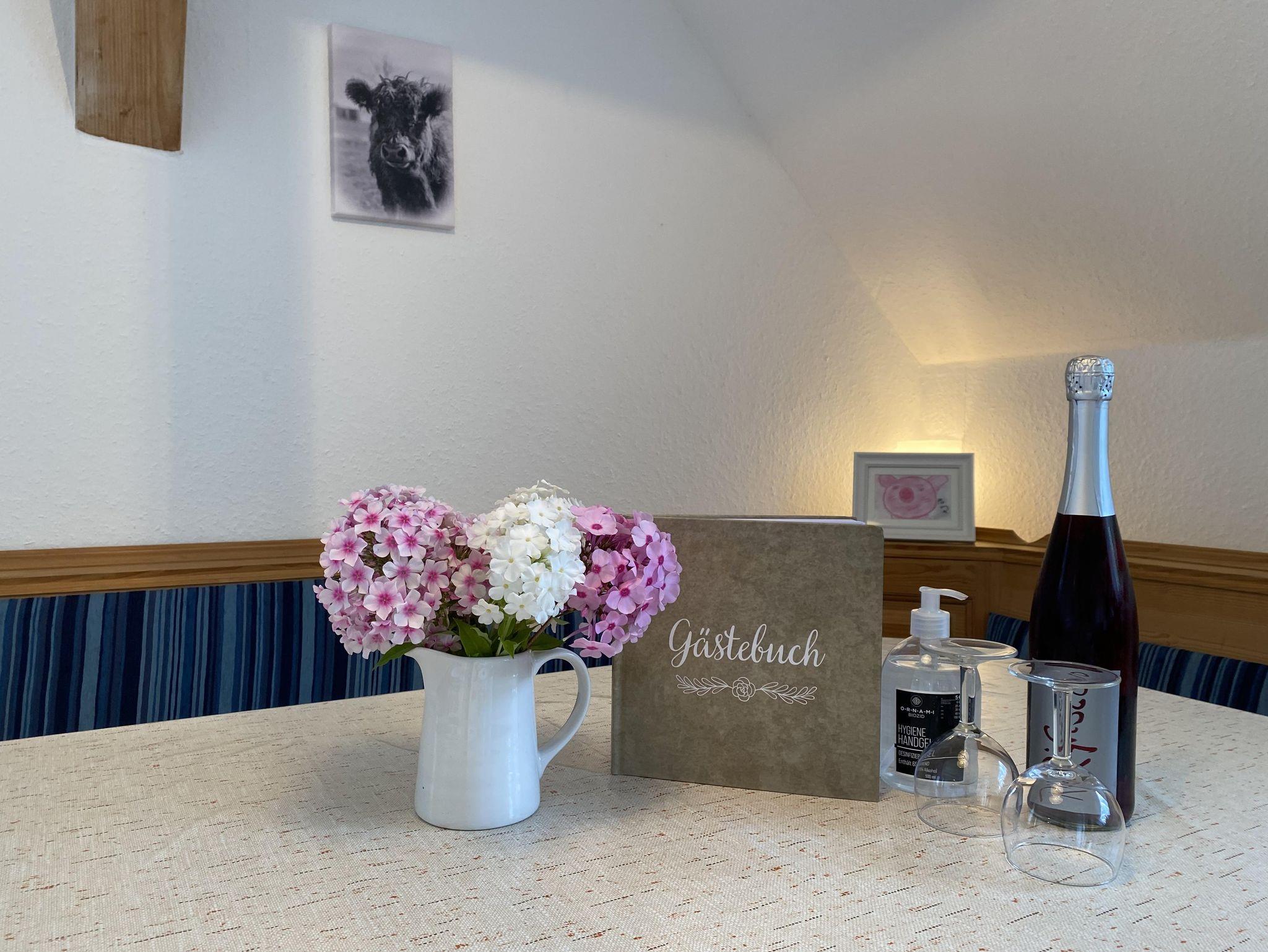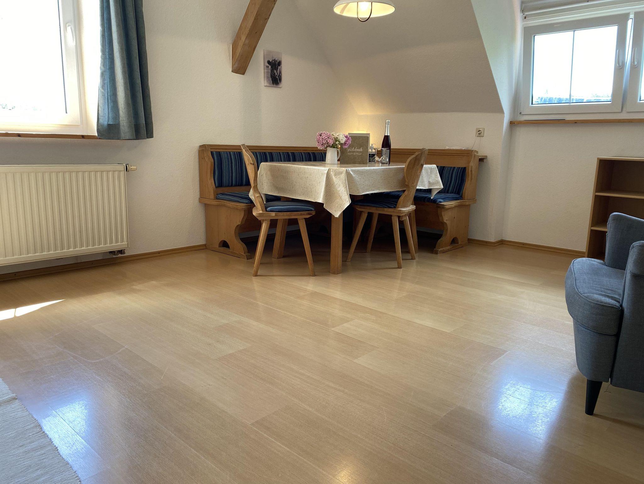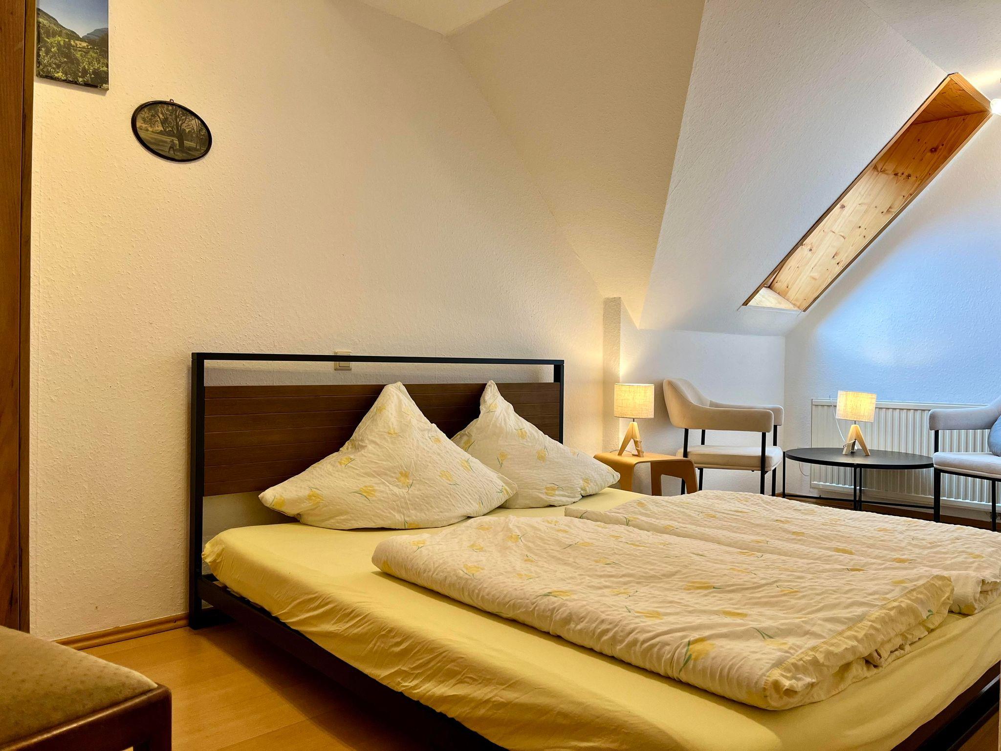 Im 2. OG befindet sich die helle und gemütlich eingerichtete Ferienwohnung Bergblick mit 80 m². Mit 2 Schlafräumen für Eltern und Kinder (Hochbett), großzügiger Wohnküche inkl. Spühlmaschiene, Bad mit Badewanne und separatem WC finden Sie alles, was Sie für einen erholsamen Urlaub brauchen. Die traumhafte Bergsicht und die Sonnenaufgänge werden Sie begeistern.