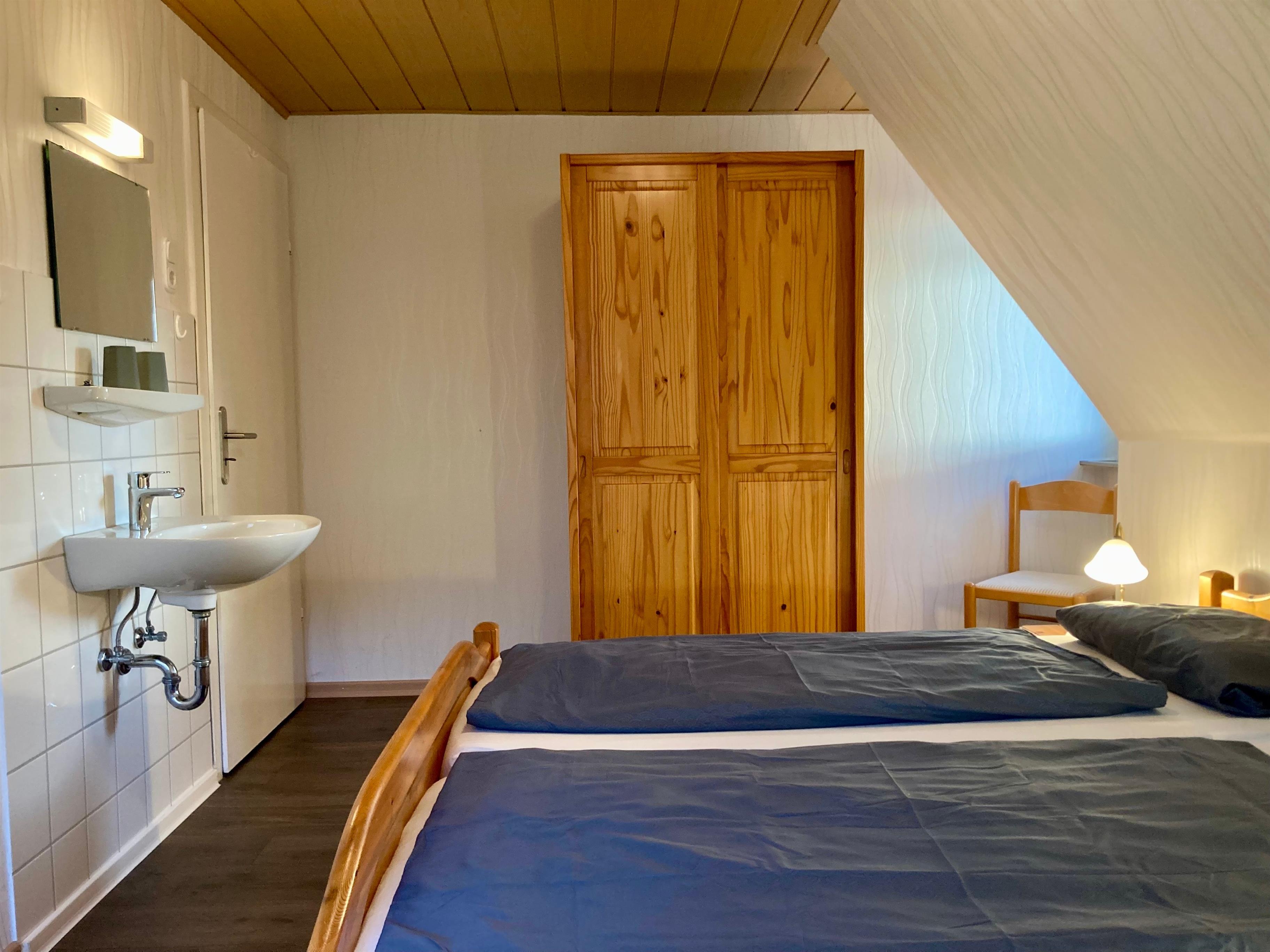 Separater Eingang, interne Treppe ins Obergeschoss: kleiner Flur. Heller Wohnraum mit Sitzgruppe, Sat-TV, Radio/CD, Internetzugang (WLAN, gratis), von hier Balkonausgang. Separate Küche mit Einbauherd (4 Ceranfelder, Backofen), Mikrowelle, Kühlschrank mit Gefrierfach, Kaffeemaschine, Wasserkocher, Toaster und Essplatz. Doppelzimmer mit Waschbecken. Zweibettzimmer. Kleine Dusche. Sep.WC.
