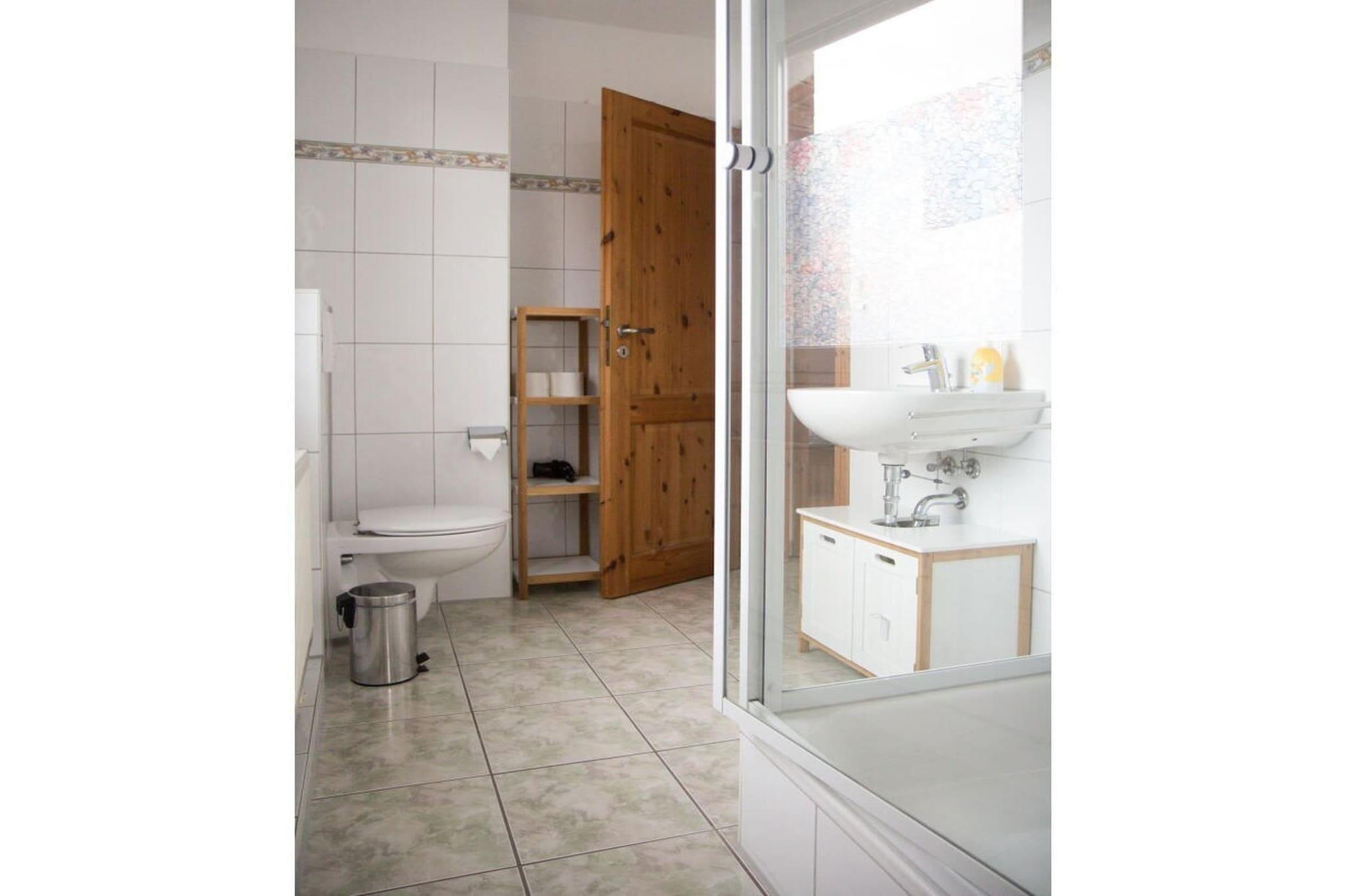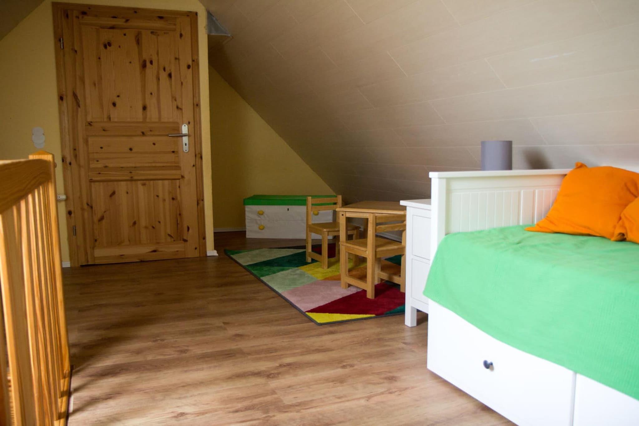 Das Ferienhaus verfügt im Erdgeschoss über einen schönen großen Eingangsbereich, ein Gäste- WC, einen Abstellraum, eine abgeschlossene Küche und ein großes, helles Wohnzimmer mit Kaminofen und direktem Zugang zum großen Garten. Über eine offene Treppe gelangt man in die erste Etage. Hier befinden sich ein sehr großes Schlafzimmer mit Doppelbett. Ein festes Kinderbett hat hier seinen Platz, eine gemütlich Ecke mit Sessel macht dieses Zimmer komplett. Das zweite Schlafzimmer ist mit zwei Einzelbetten und einem Fernseher ausgestattet. Im großen Duschbad auf dieser Etage befindet sich auch die Waschmaschine. Außenjalousien und Parkplatz. In diesem Haus mit Südausrichtung können Sie Ihre Urlaubstage entspannt genießen.